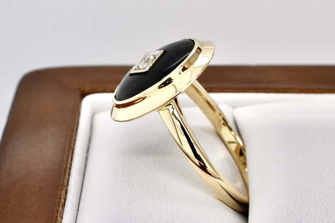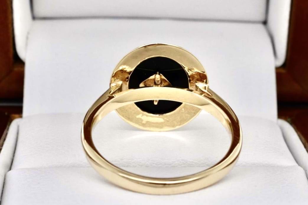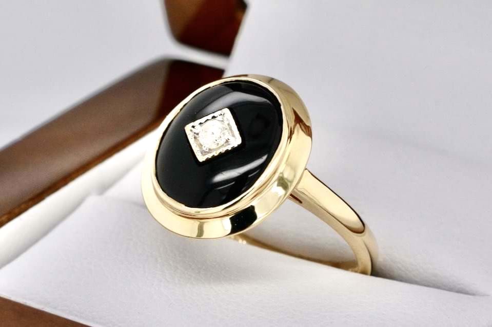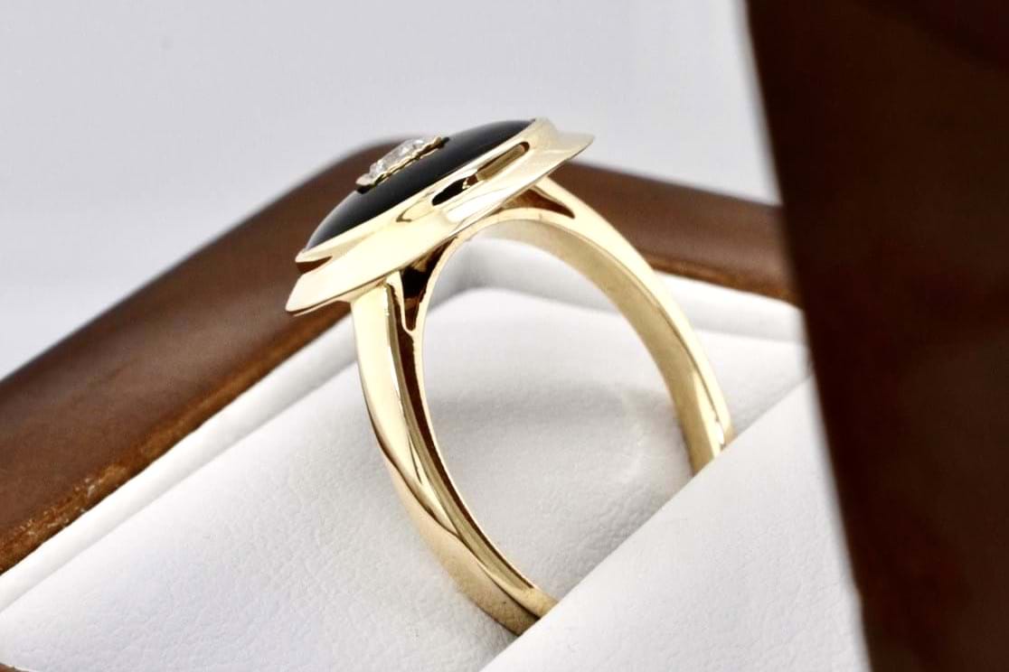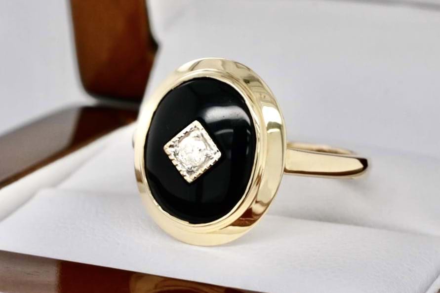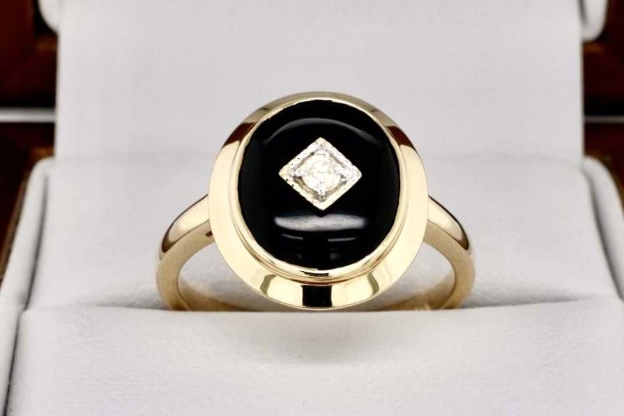 This beautiful ring is made from 9ct yellow gold with an oval piece of onyx measuring approximately 15.3 x 13.2mm, bezel set and with a sparkling RBC diamond in the centre with a pretty millgrain diamond shaped bezel with plain band. Finger size O