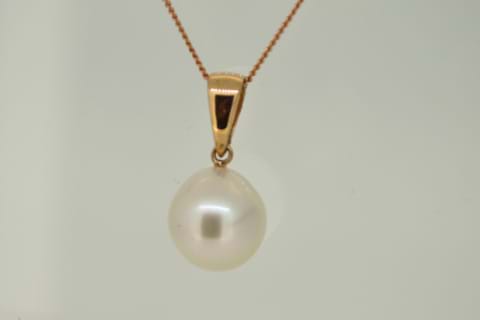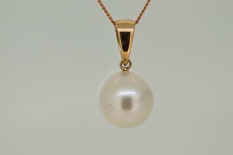 A contemporary and timeless south sea pearl pendant, feauring an oval white 12-12.5mm Australian south sea pearl suspended from a 9ct rose gold enhancer bale.