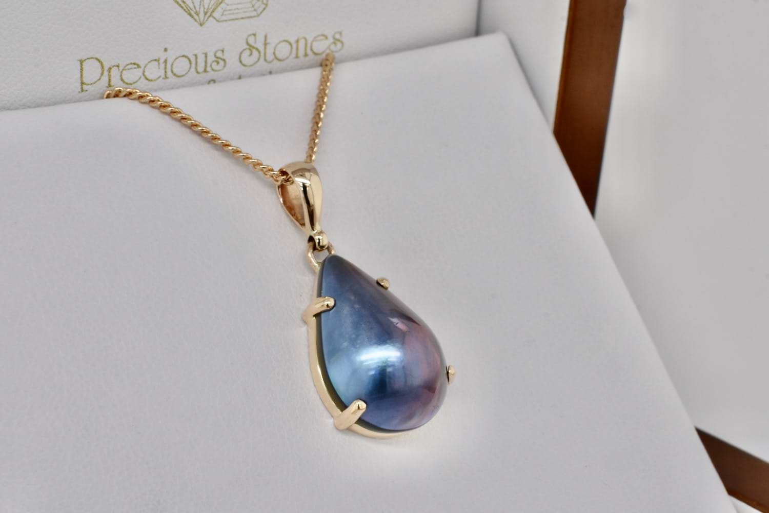 Pretty pearshape blue mabe pearl measuring approx. 19.8x14.2mm set into a handmade four claw 9ct yellow gold pendant. Chains are available for separate purchase