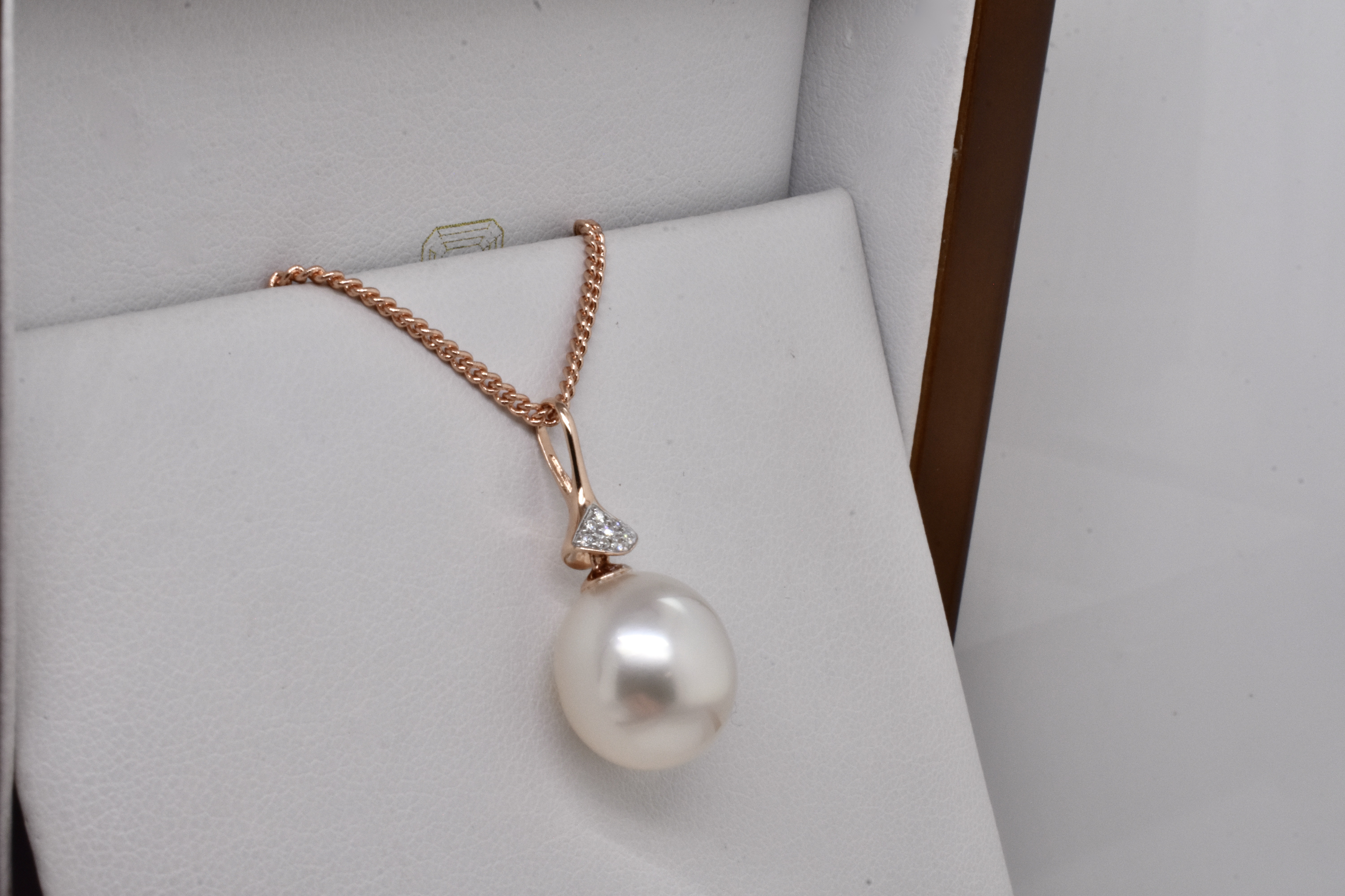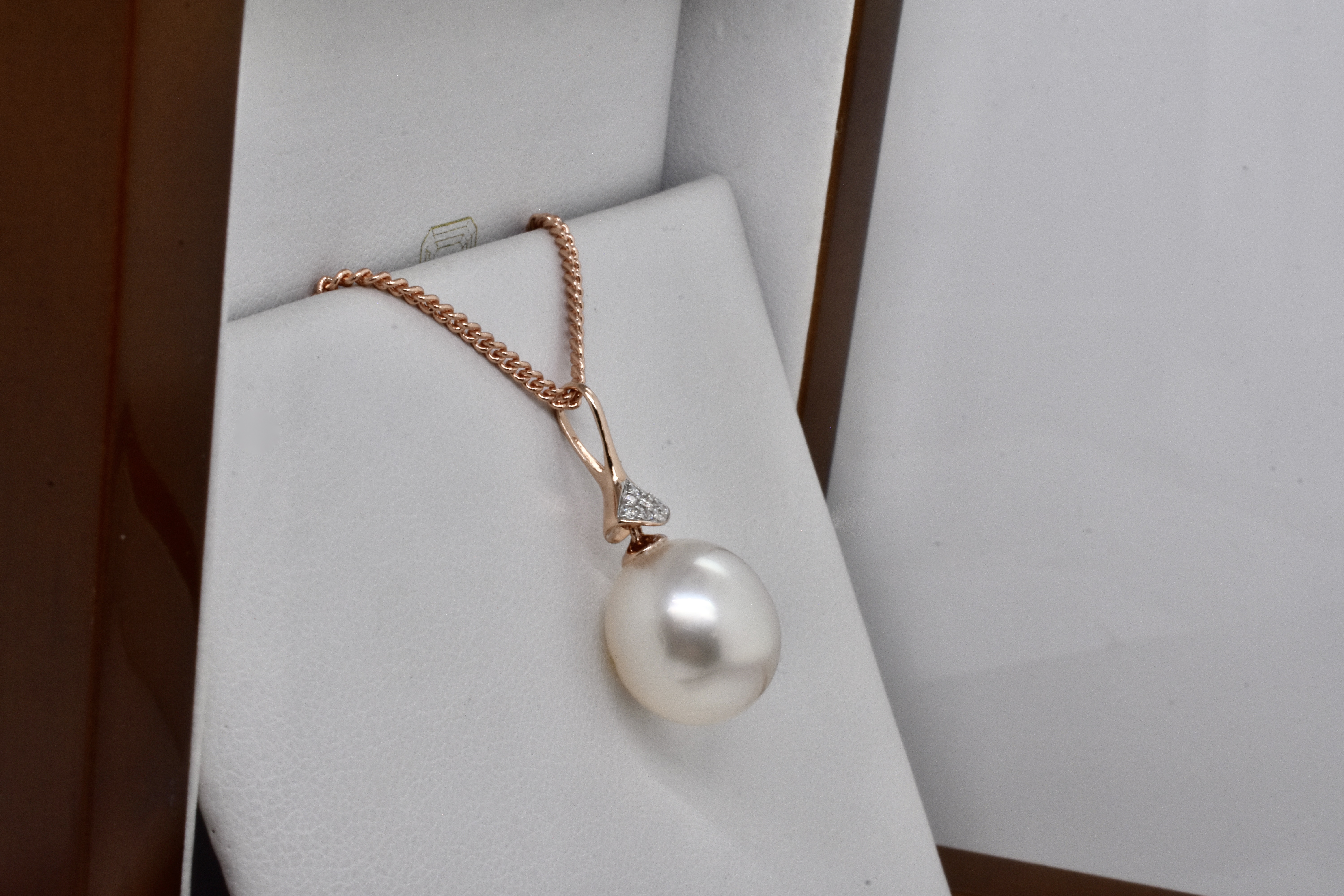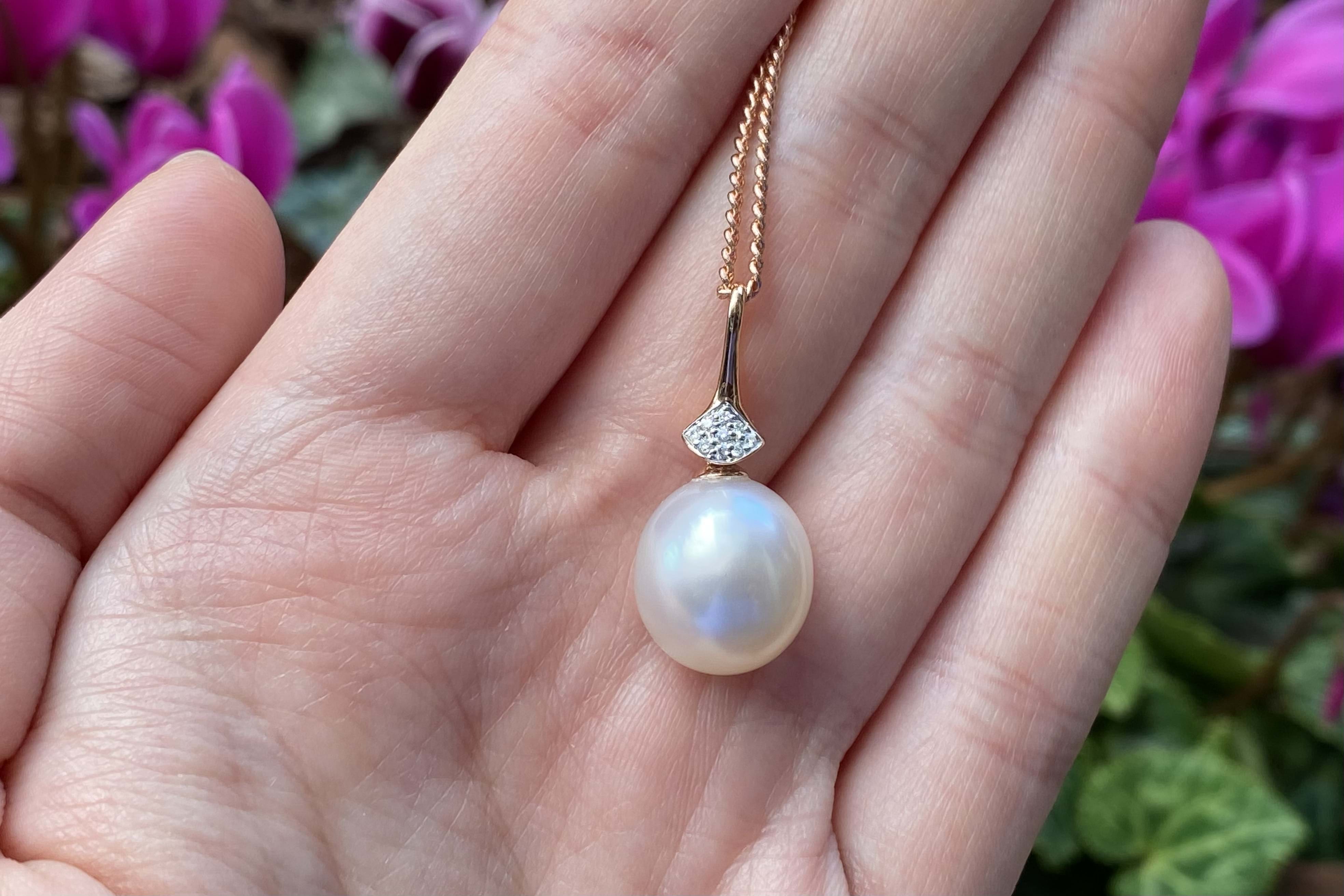 This modern pendant is made from 14ct rose gold, with a slender and tapered 9=0.04ct H/SI diamond set bail and a drop of a 11.9mm oval pink/white south sea pearl with good lustre. Chains available for separate purchase. Independent Valuation Supplied