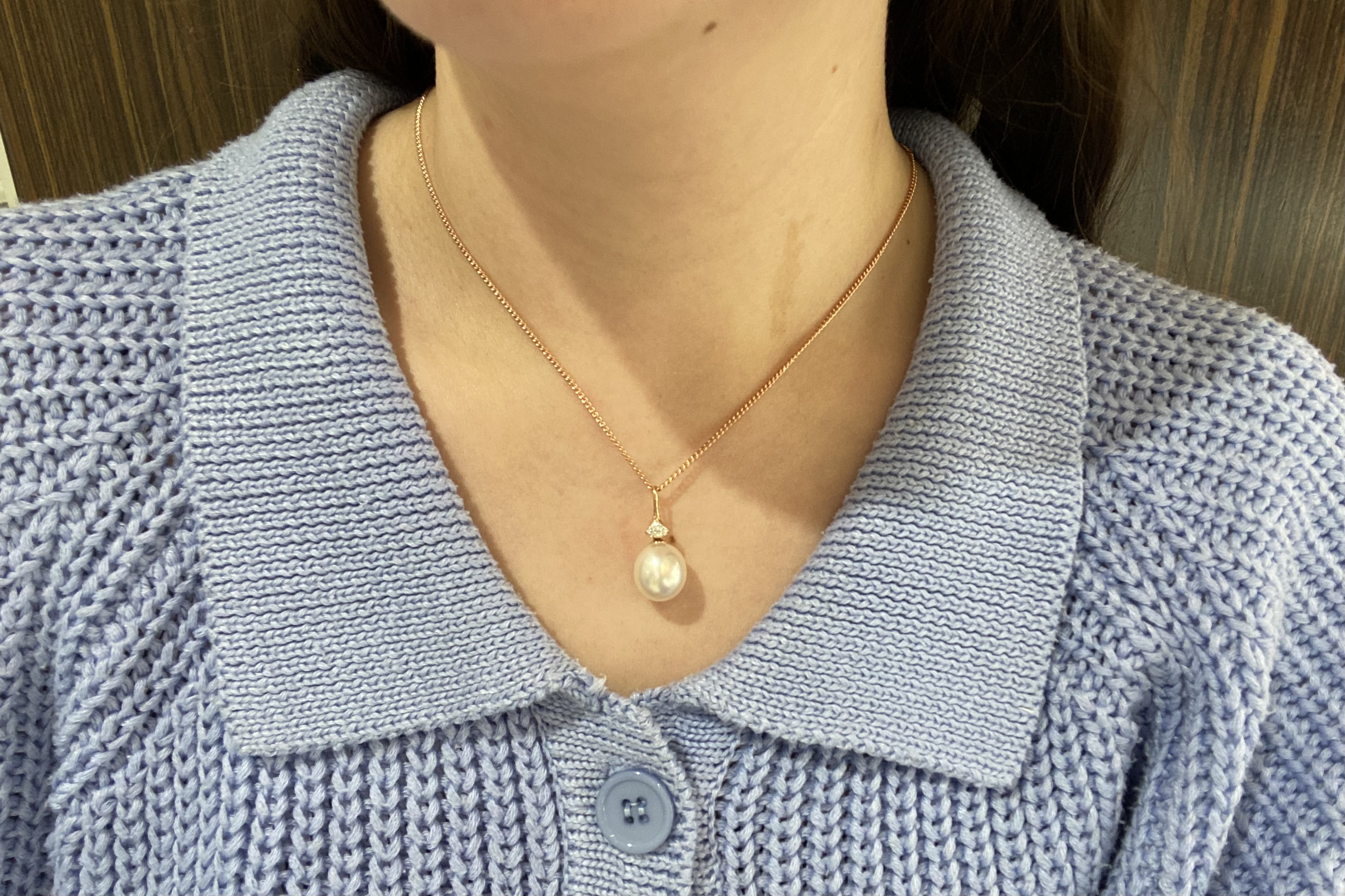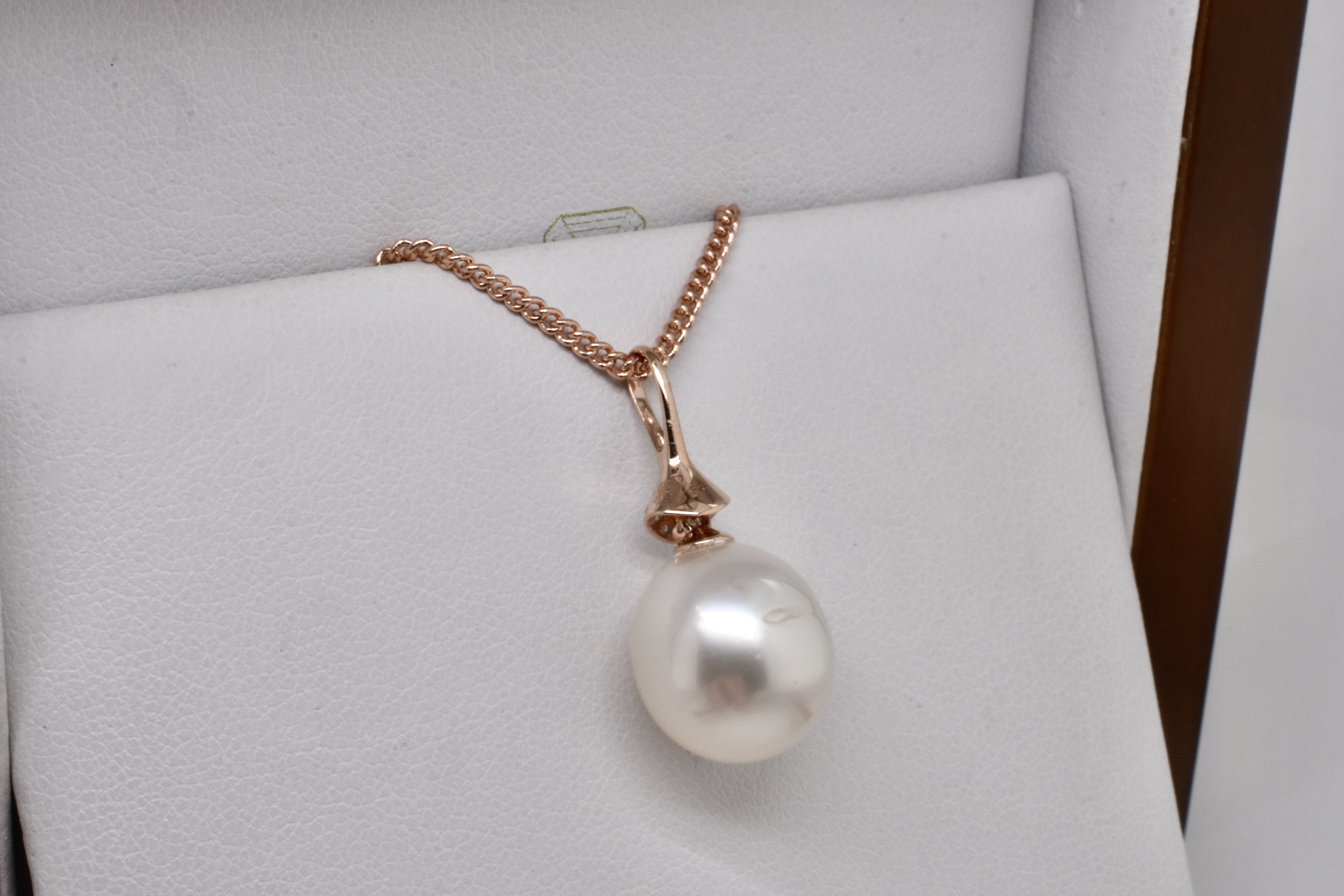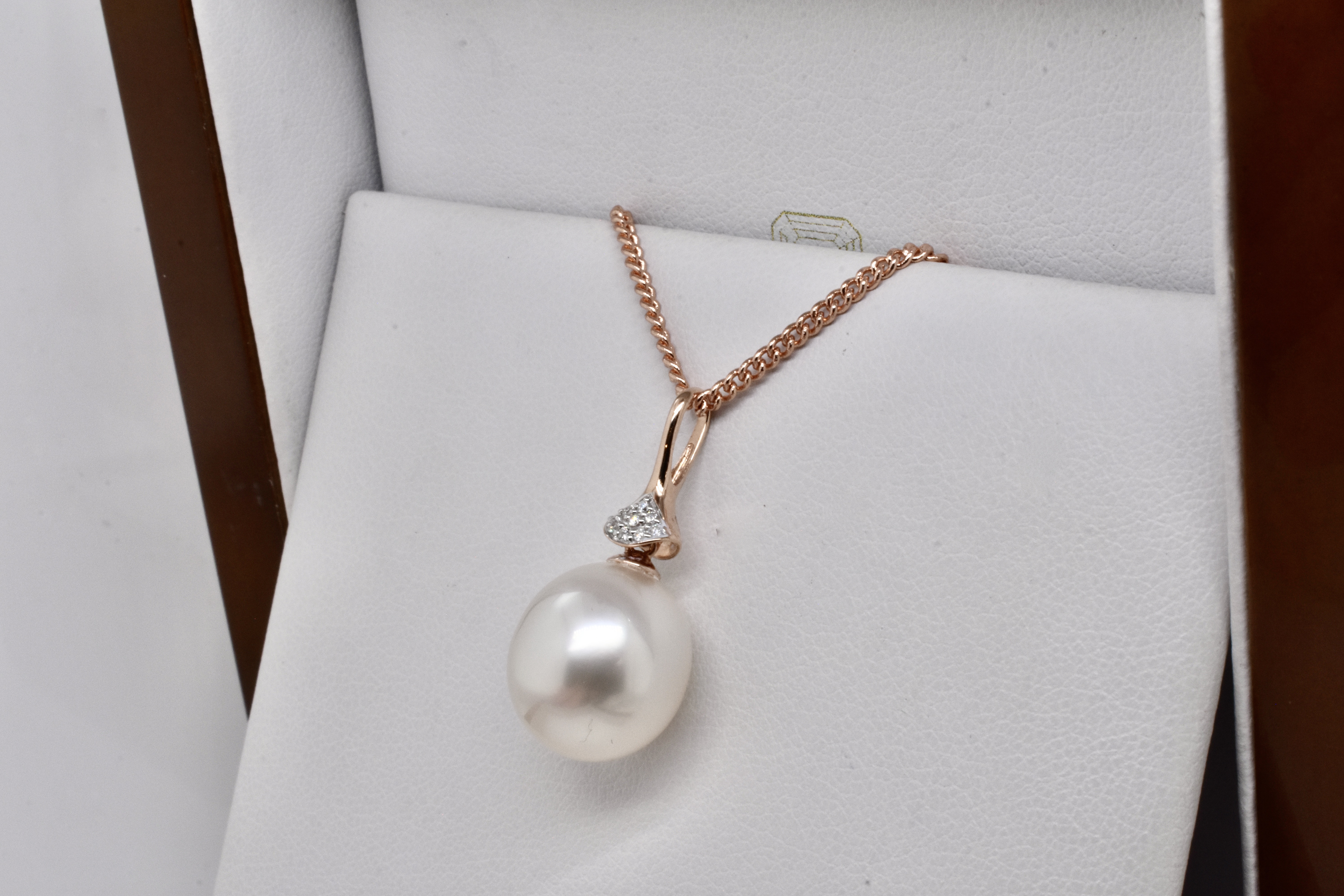 This modern pendant is made from 14ct rose gold, with a slender and tapered 9=0.04ct H/SI diamond set bail and a drop of a 11.9mm oval pink/white south sea pearl with good lustre. Chains available for separate purchase. Independent Valuation Supplied