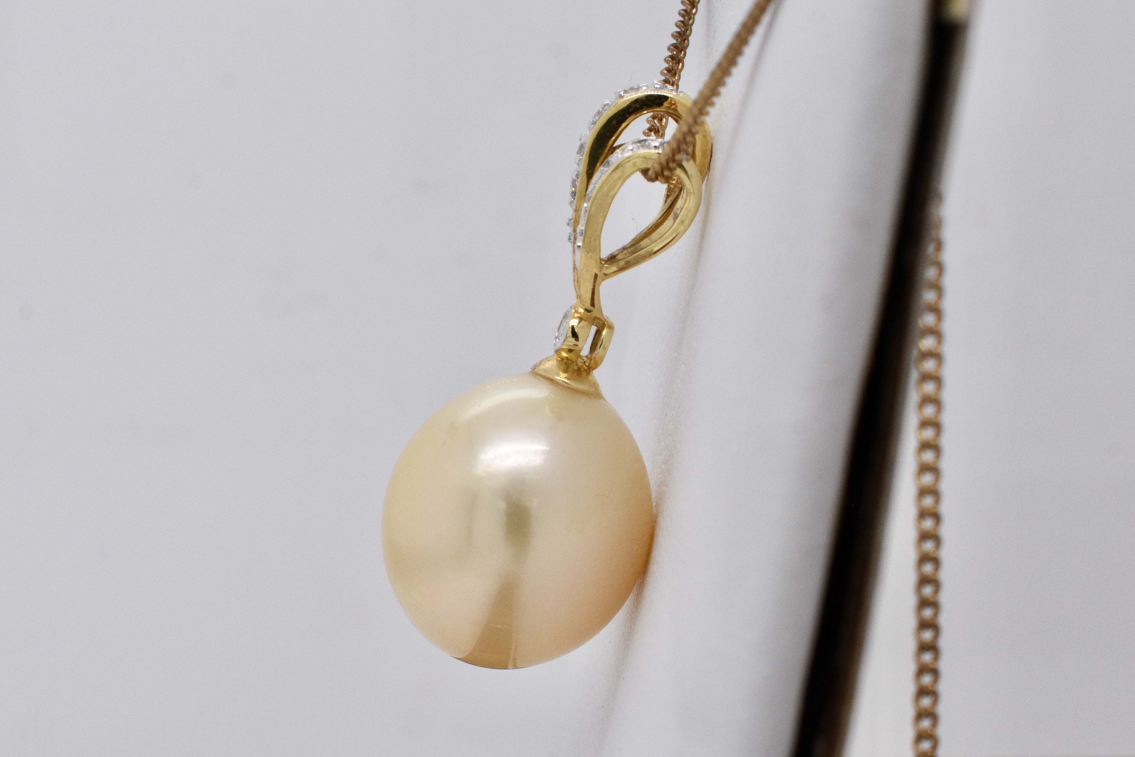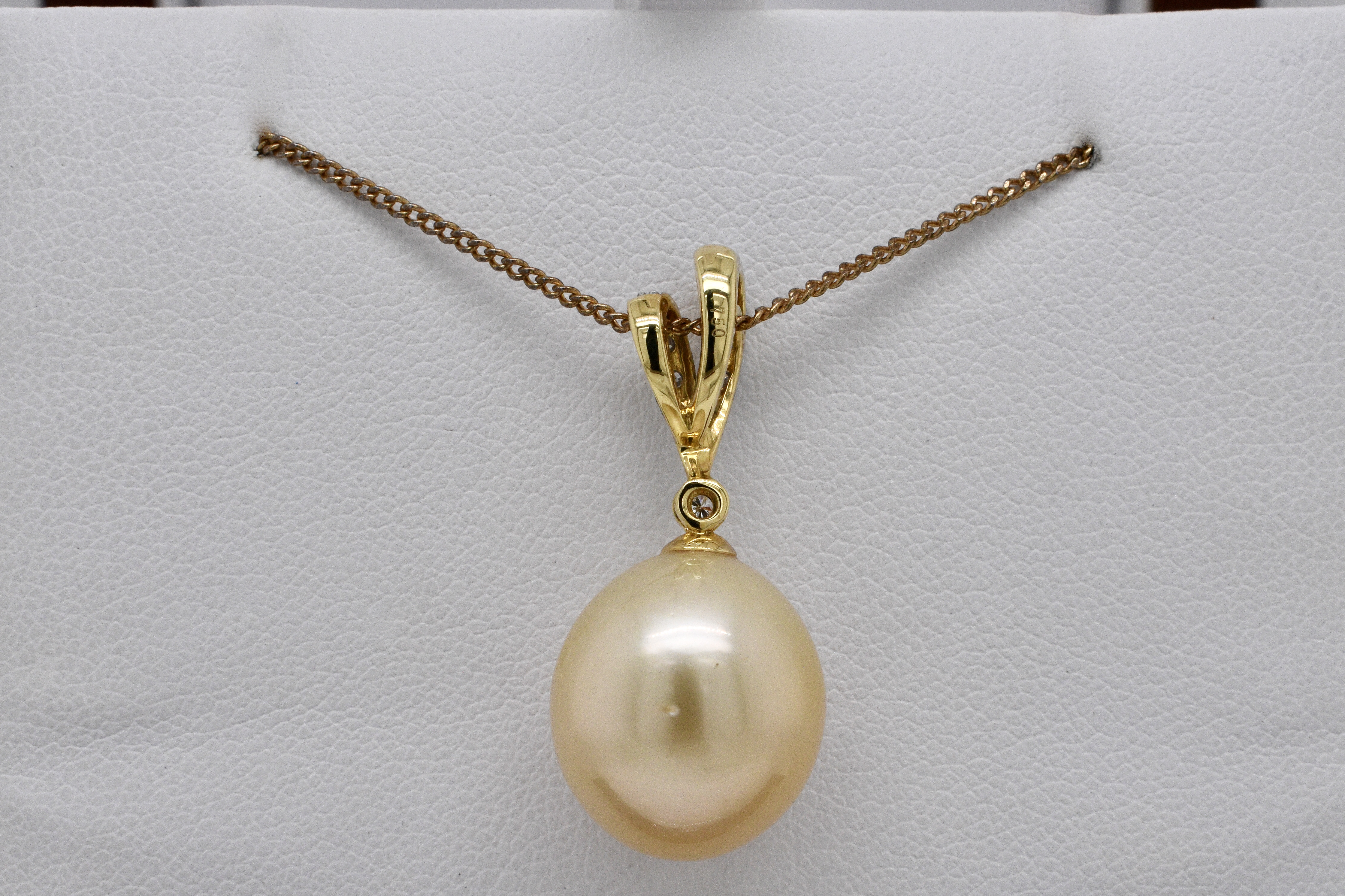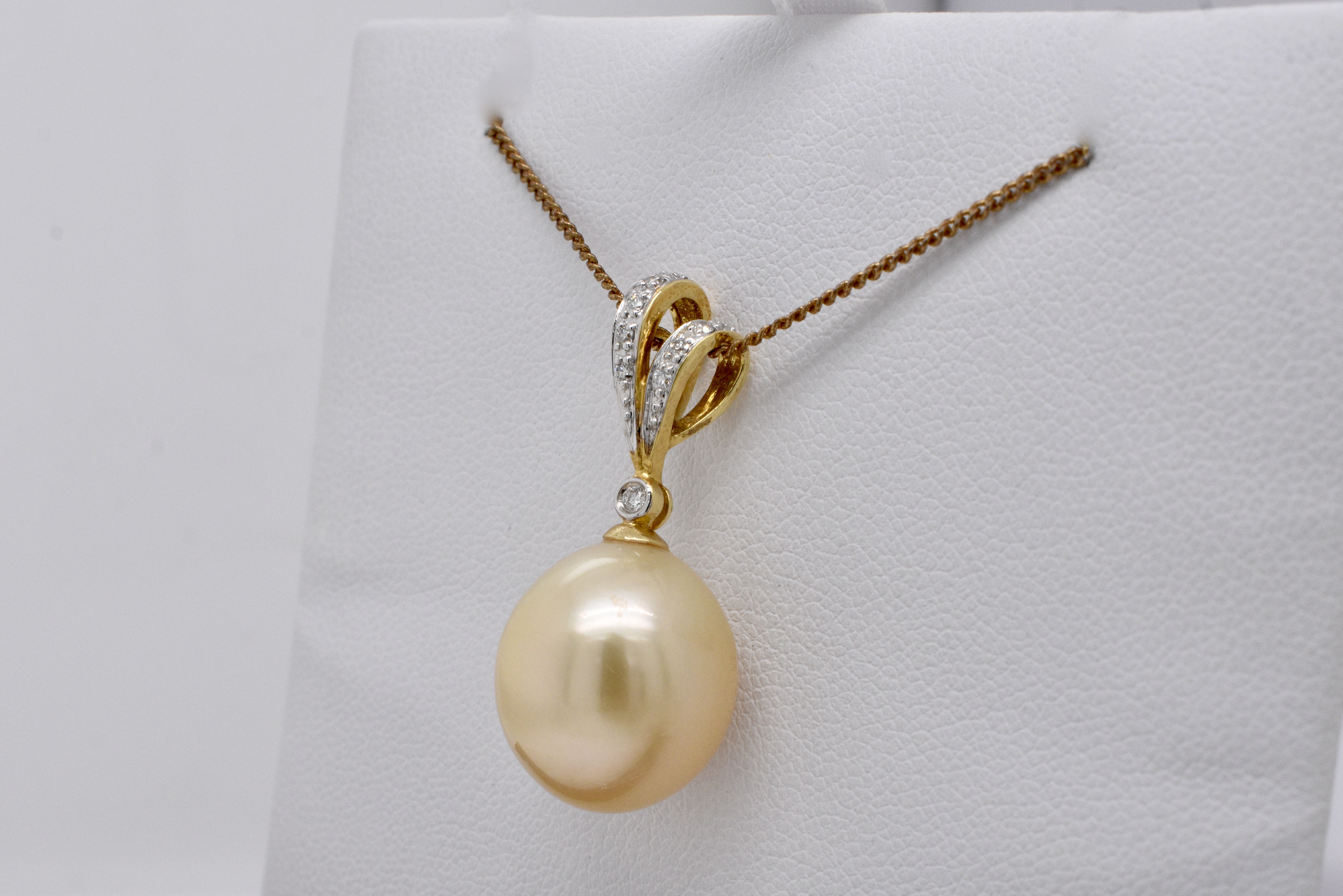 A stunning 18ct yellow gold pendant with a feminine diamond encrusted bale and featuring a gorgeous drop golden south sea pearl. Measuring 13-13.5mm and with 0.08cts of diamonds this pretty pendant looks beautiful when paired with a fine gold chain. Independent Valuation Supplied