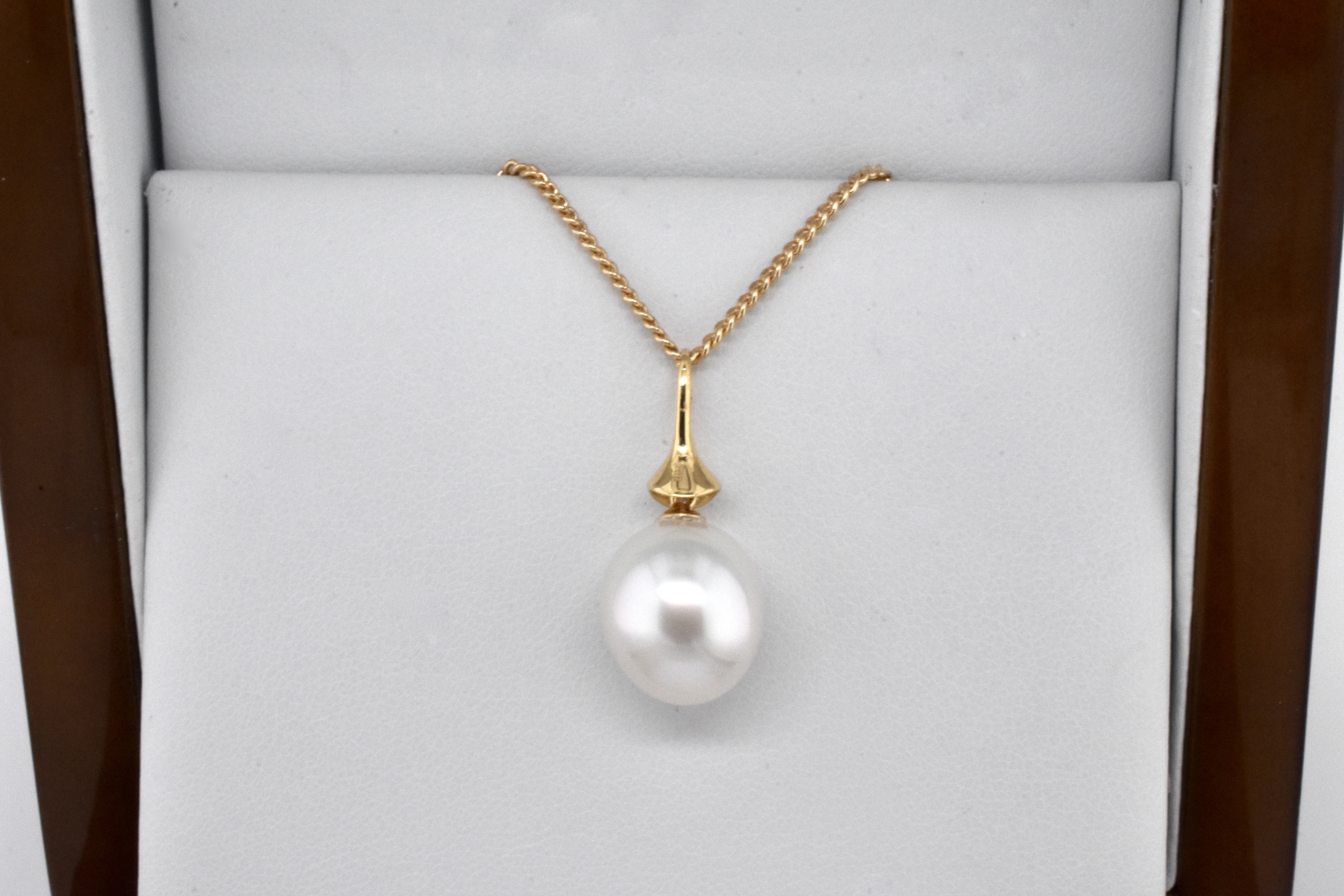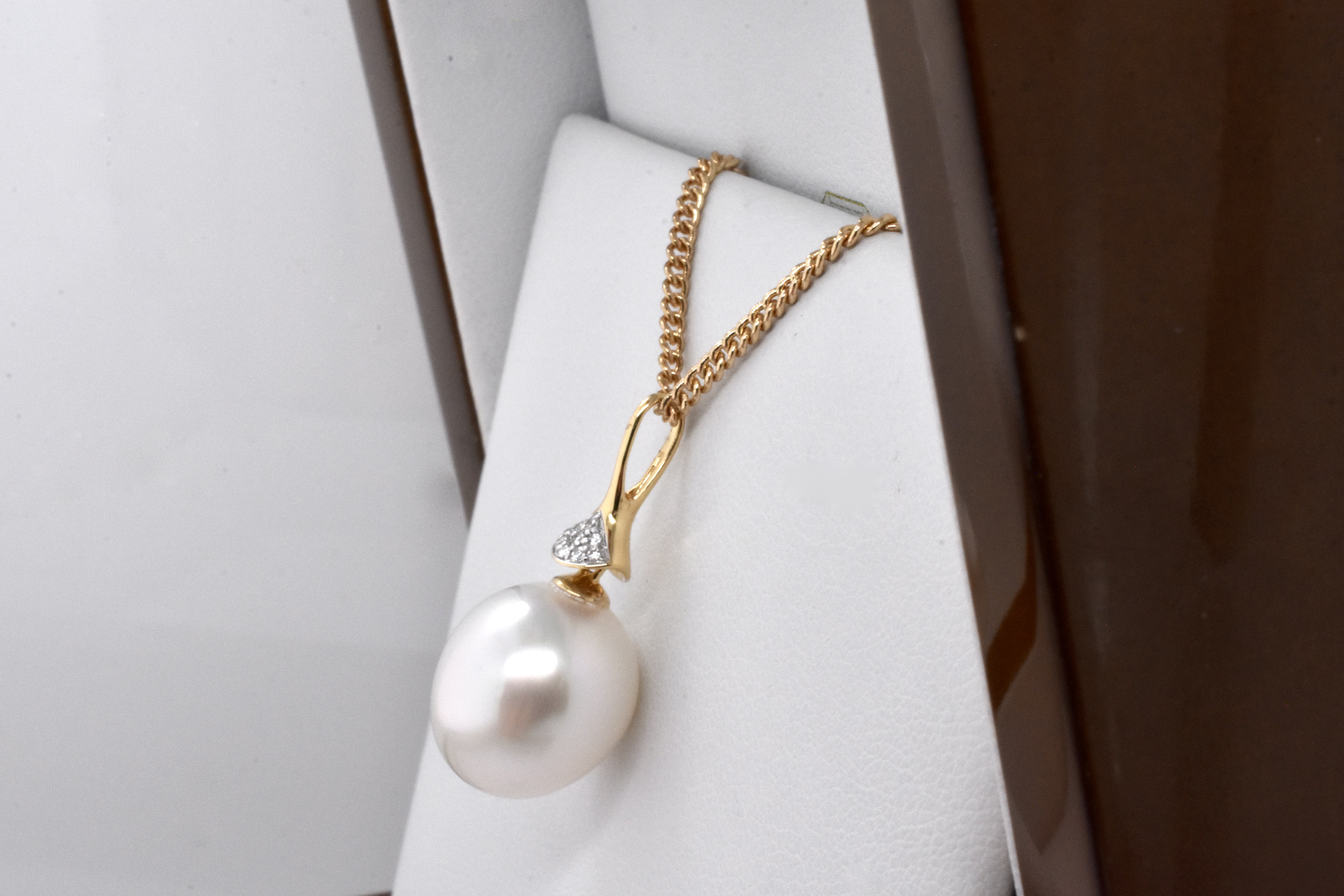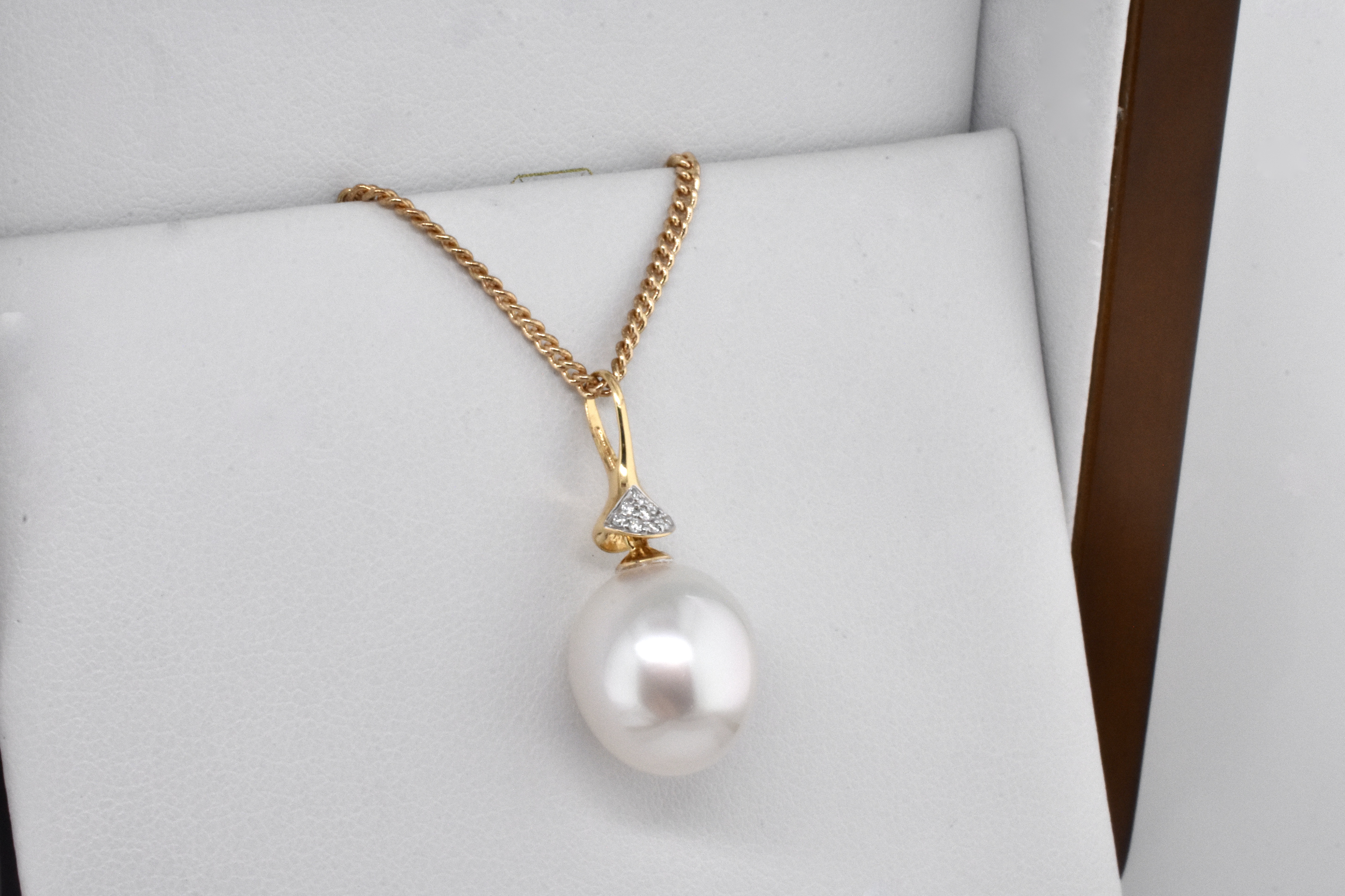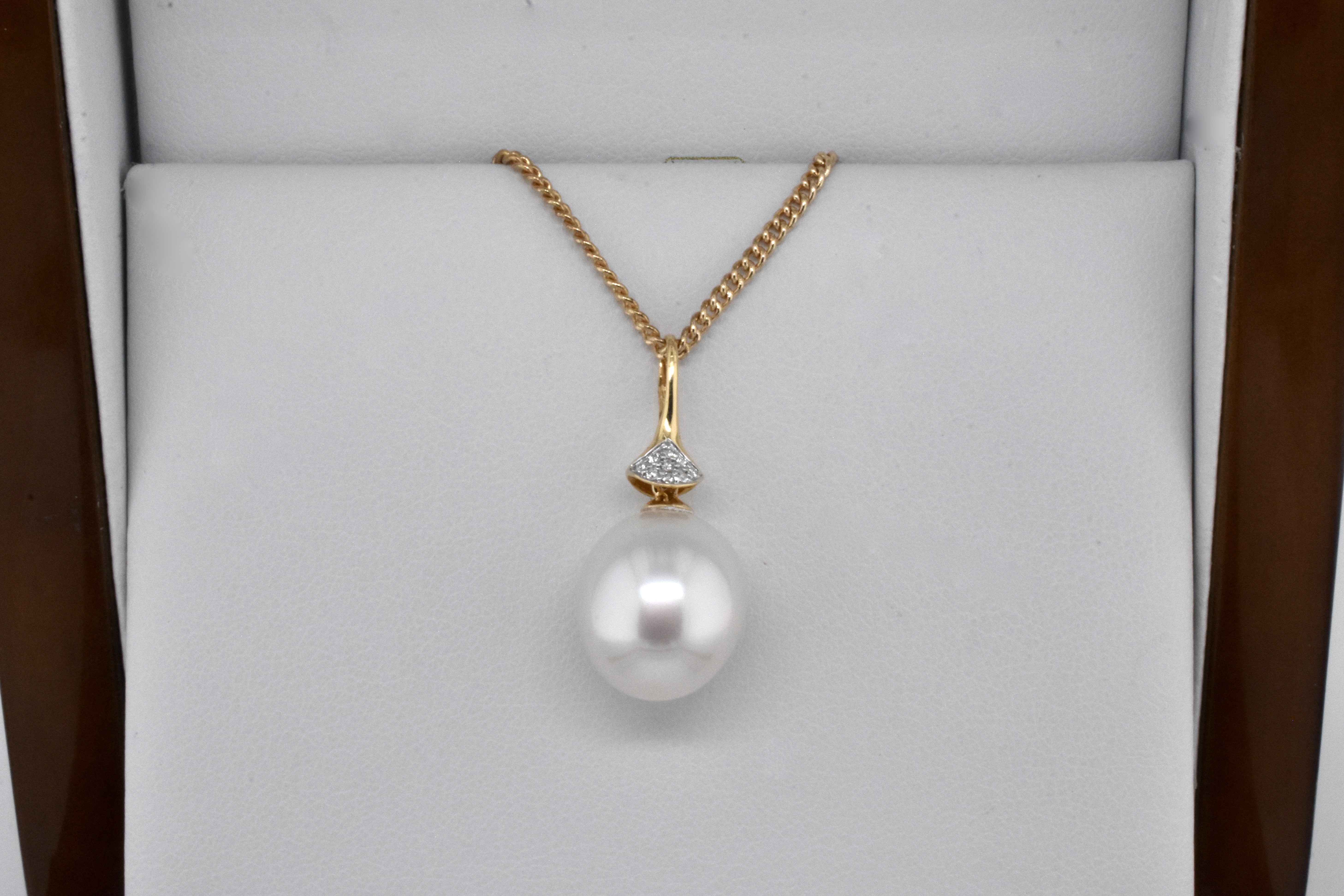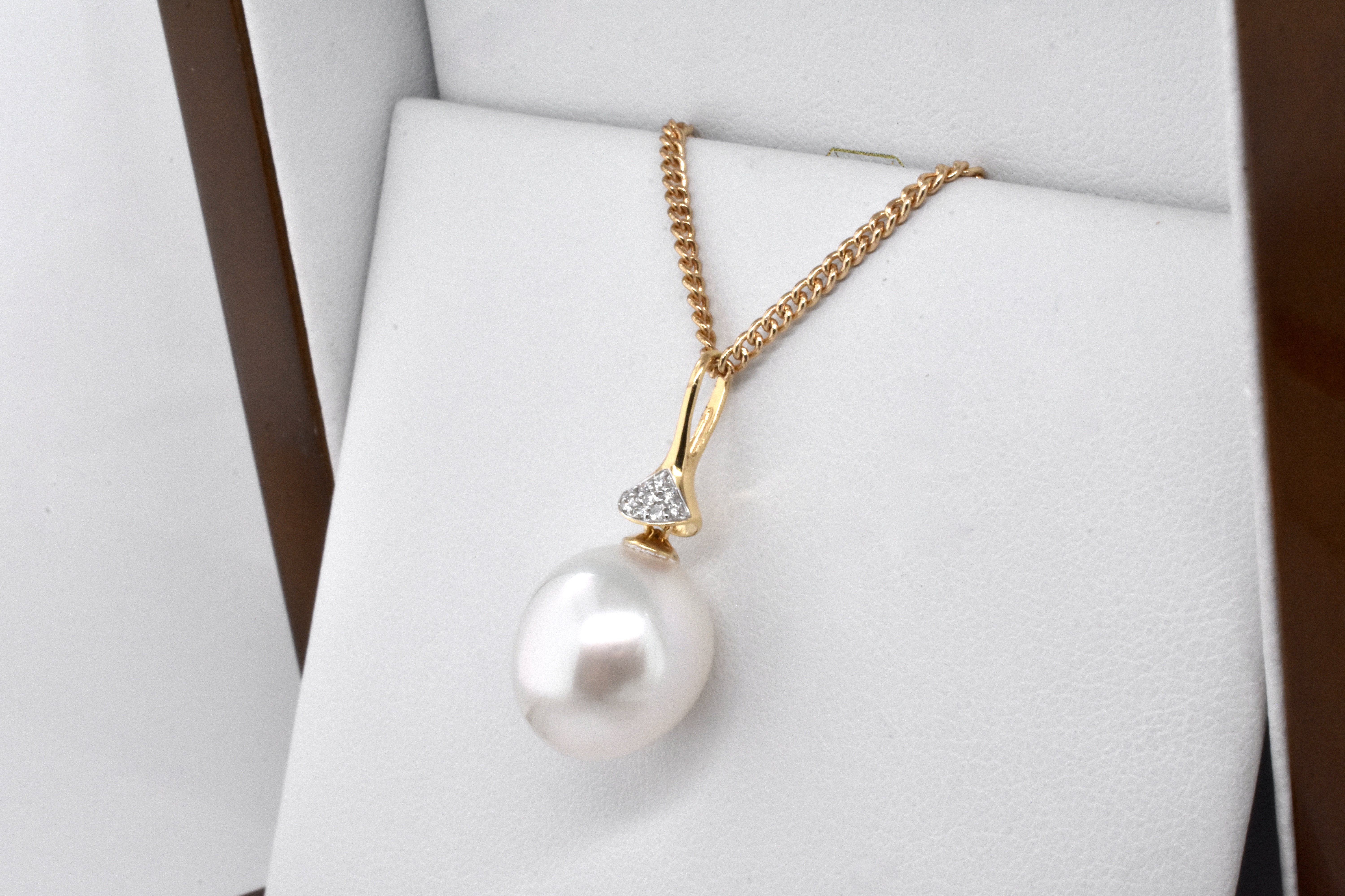 A charming and timeless pair of earrings crafted in 18ct yellow gold with 11-11.5mm slightly off round white south sea pearls with good lustre, suspended from fine shepherd hooks set with a total of 18=0.07ct FG/VS-SI sparkly white diamonds
