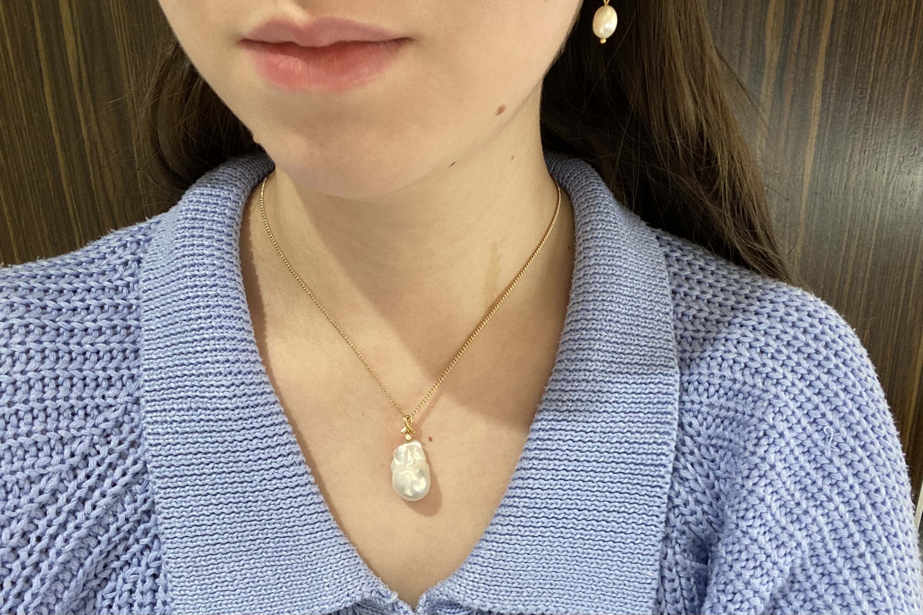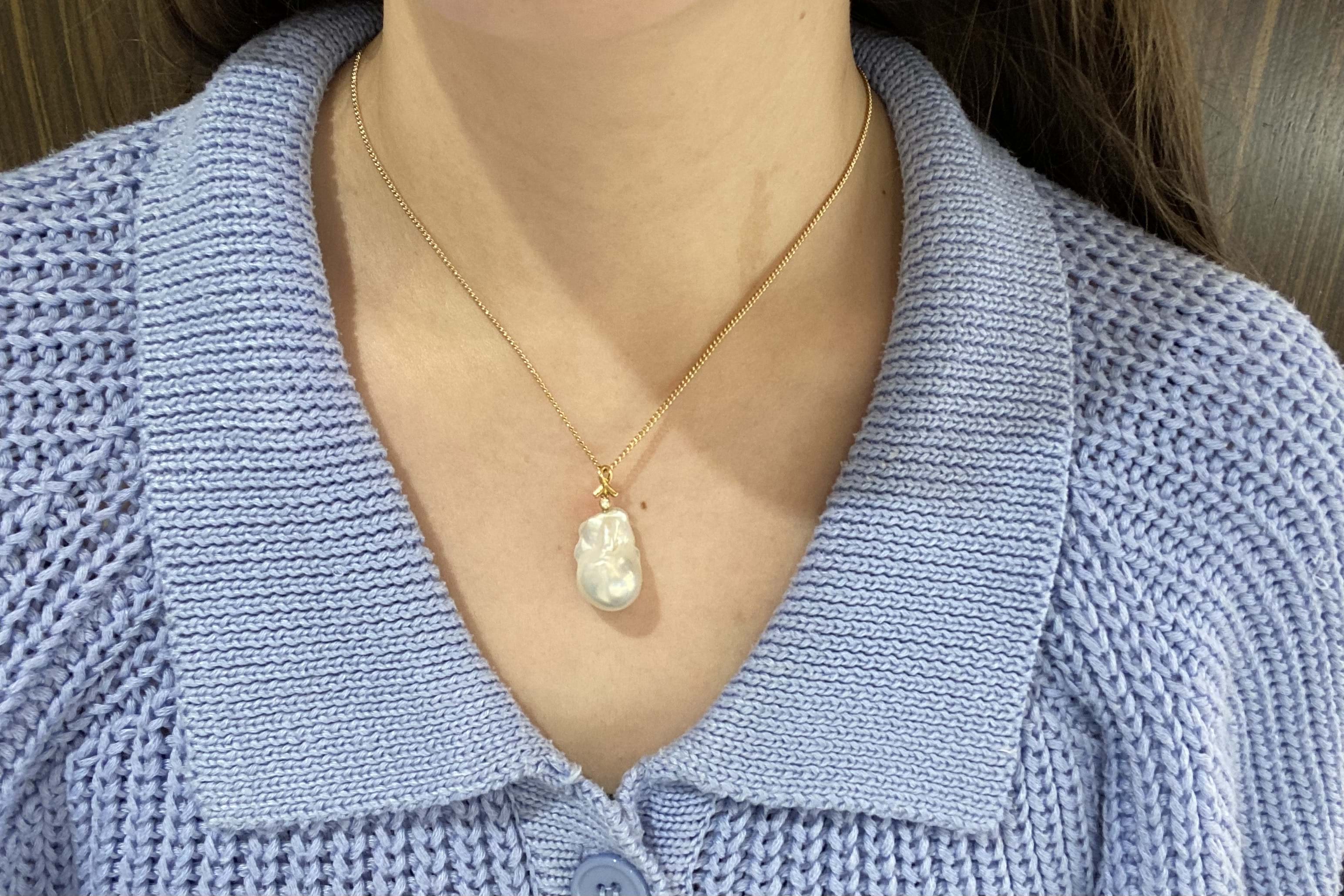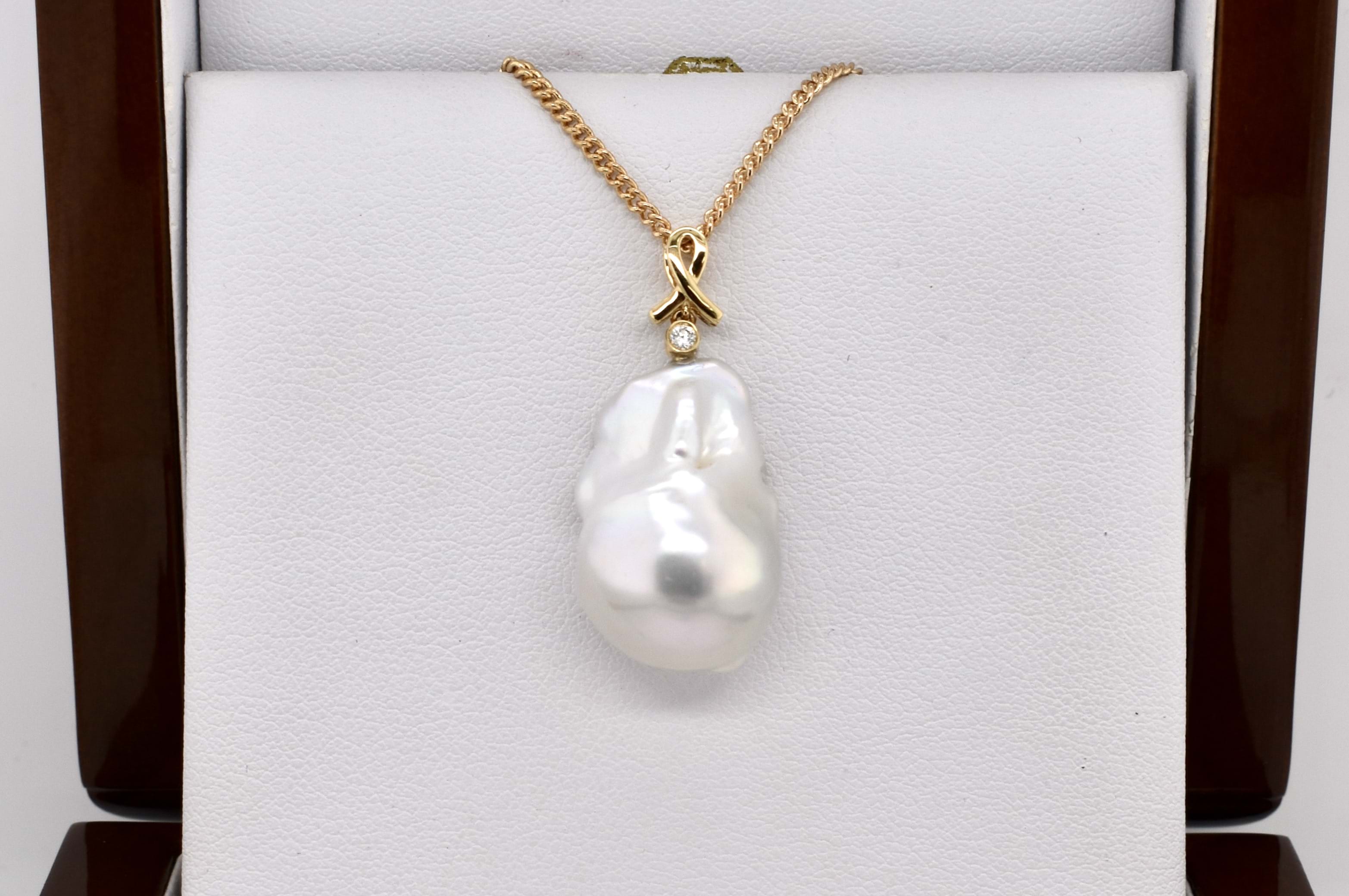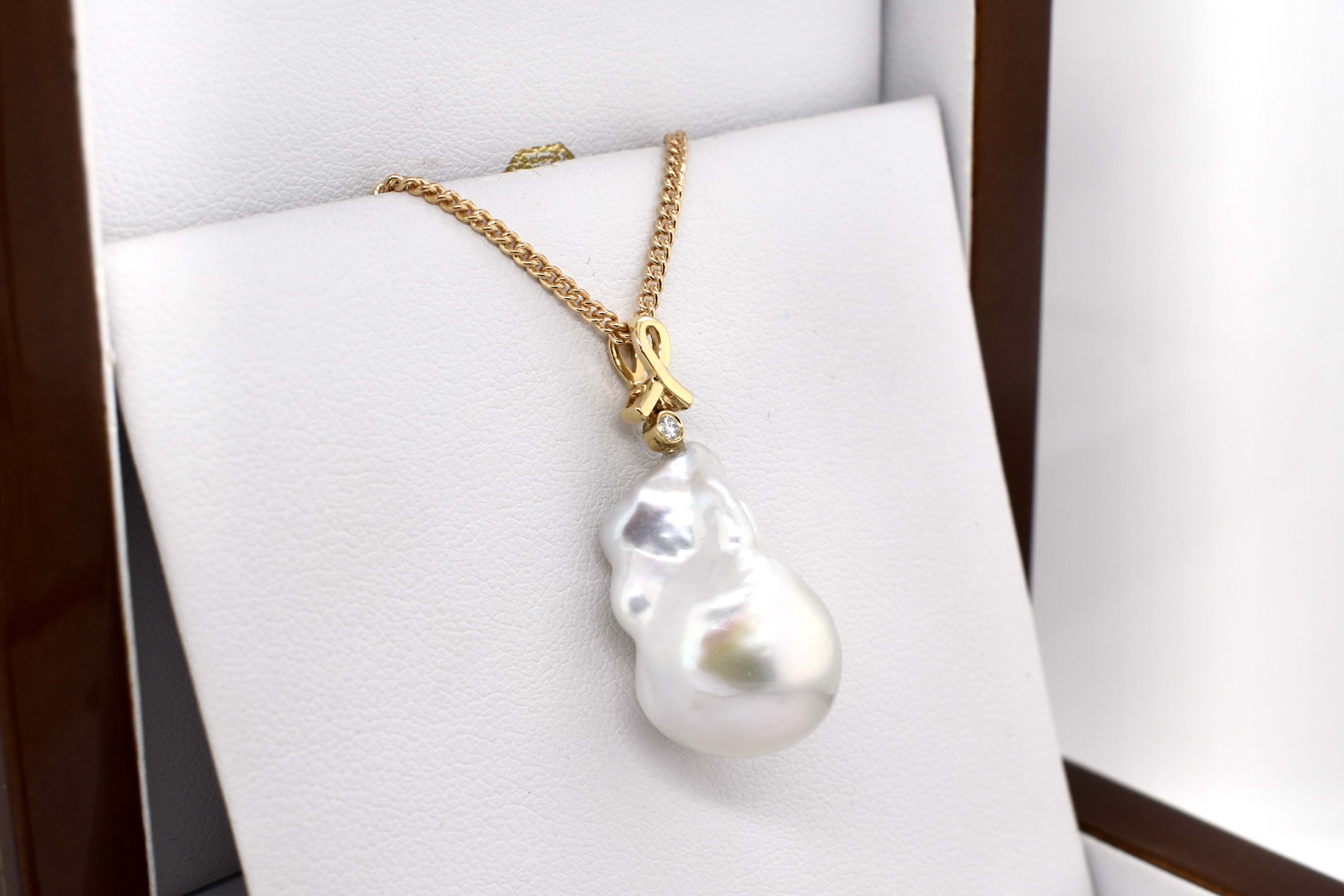 Lustrous and stunning baroque freshwater pearl measuring approx. 22x14.5mm set with an 18ct yellow gold ribbon design bale and a shimmering 0.02ct round brilliant cut diamond accent. Chains are available for separate purchase