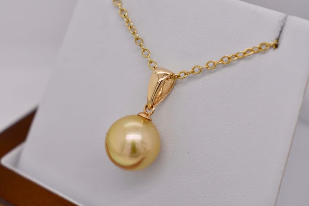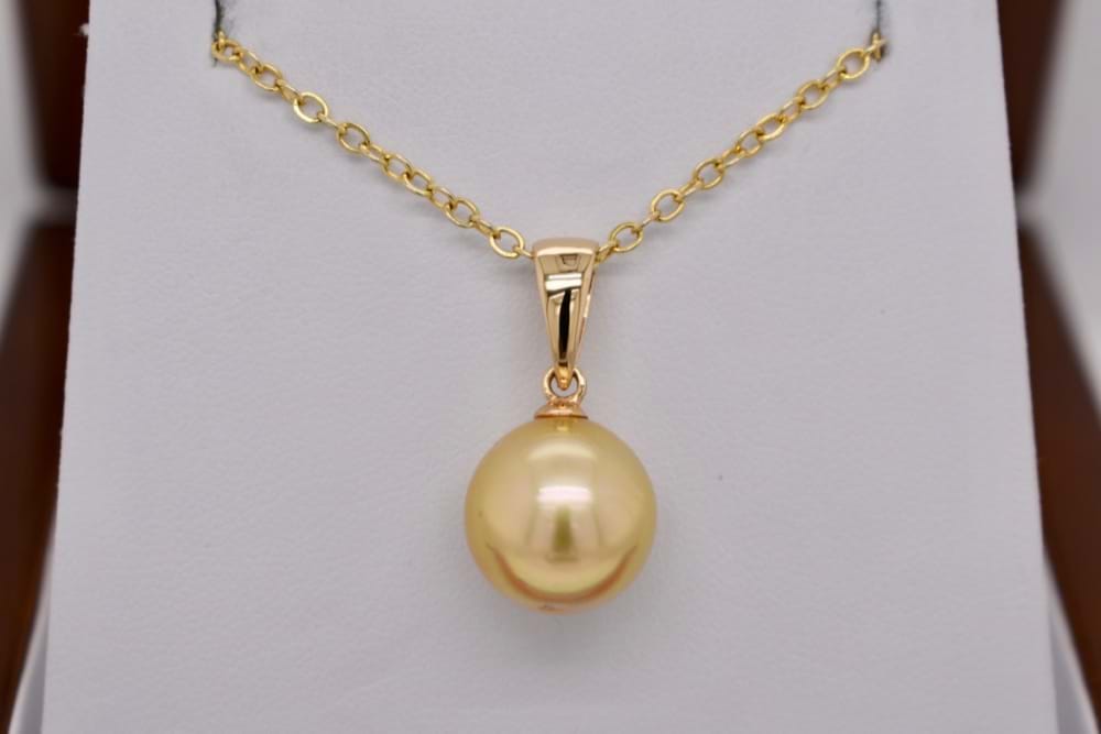 18ct yellow gold pendant set with a single 12.5-13mm golden South Sea Pearl. Chains available for purchase separately