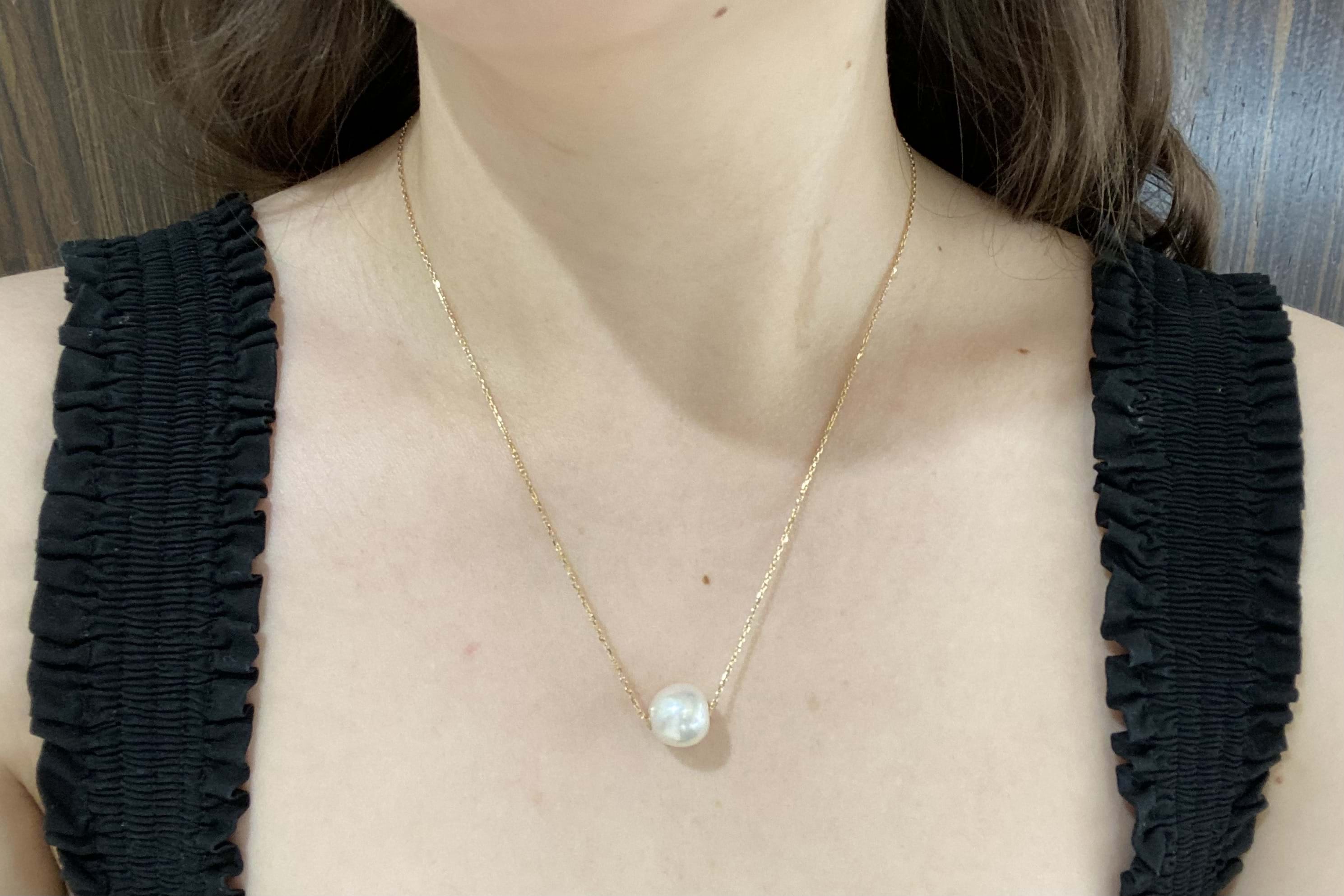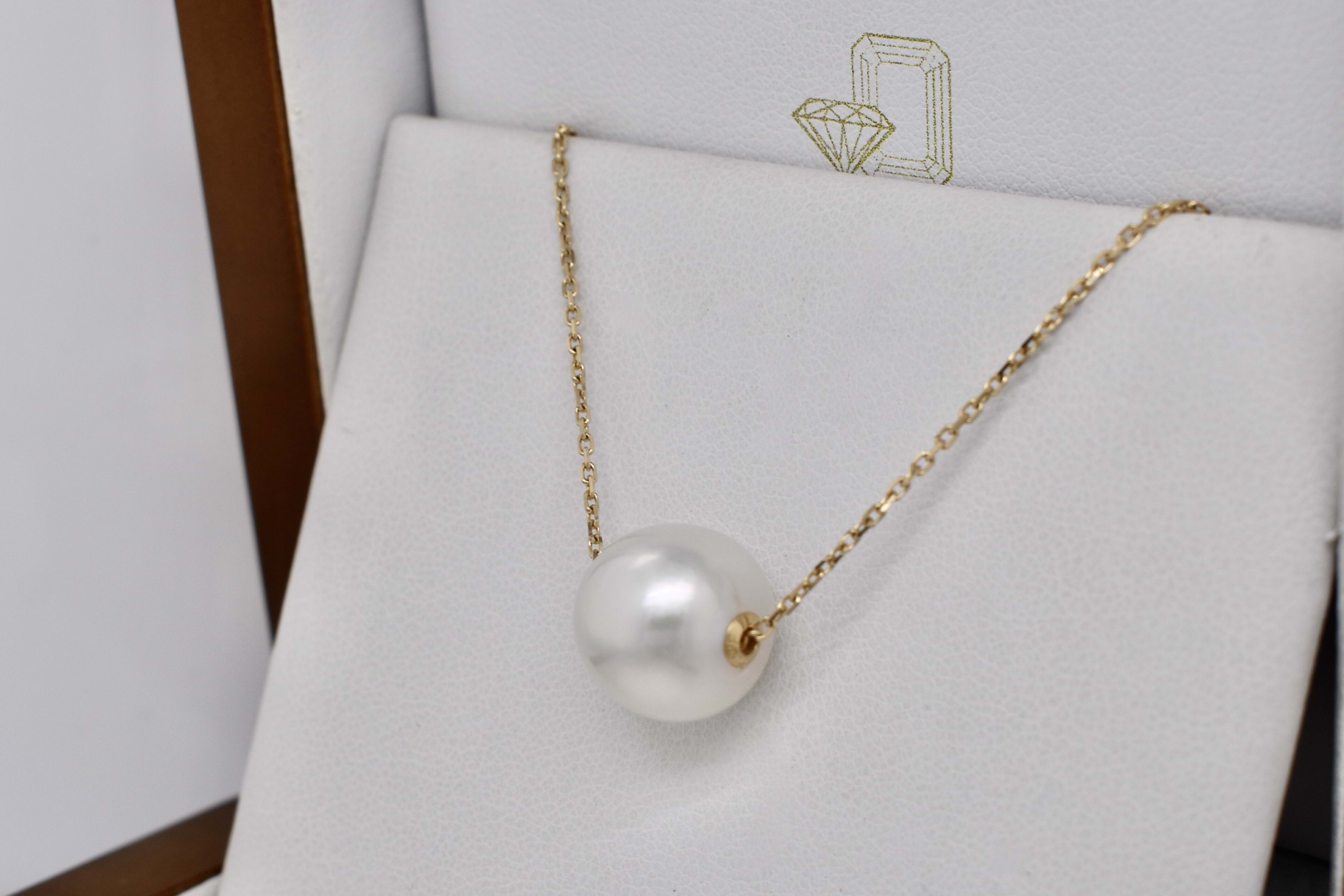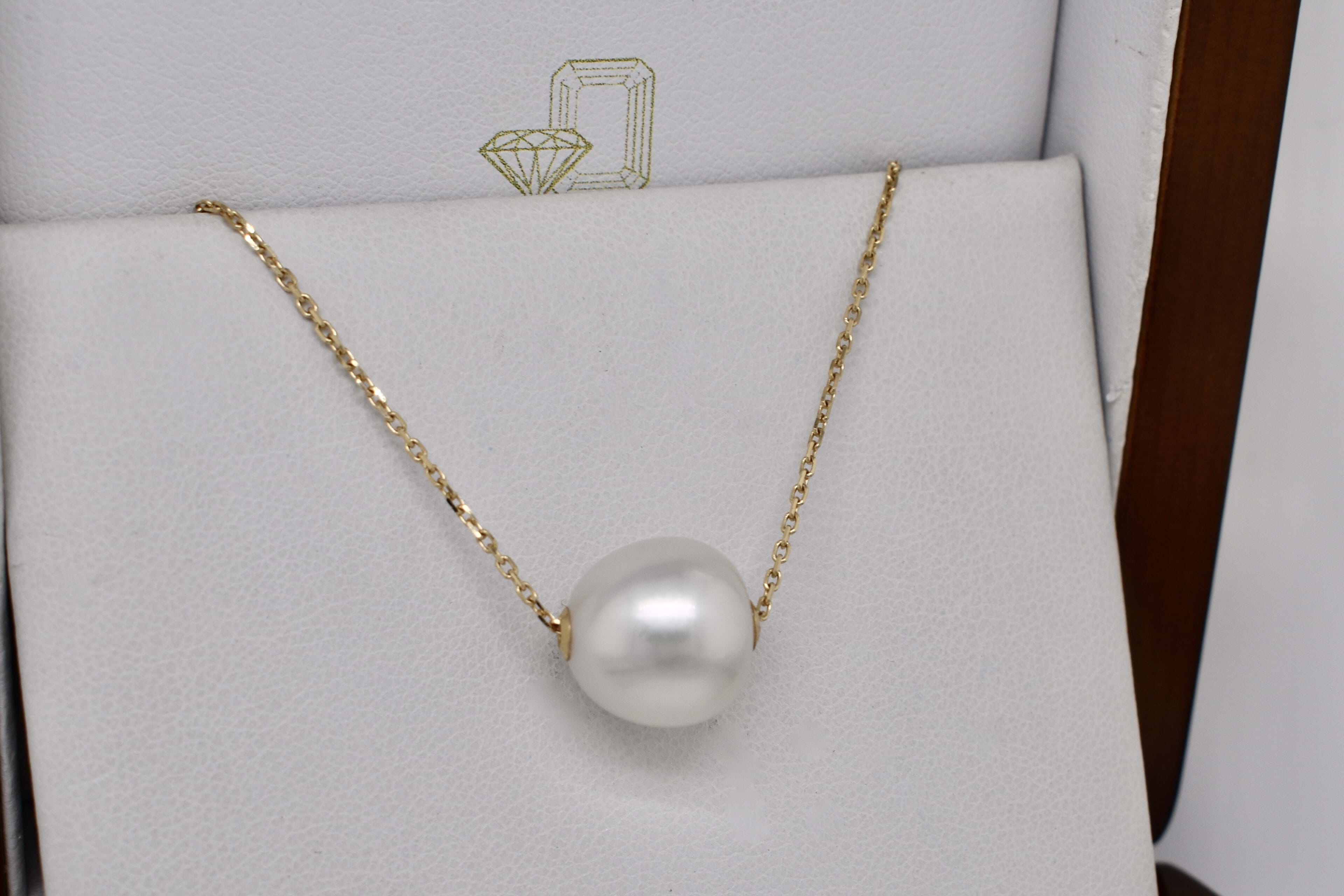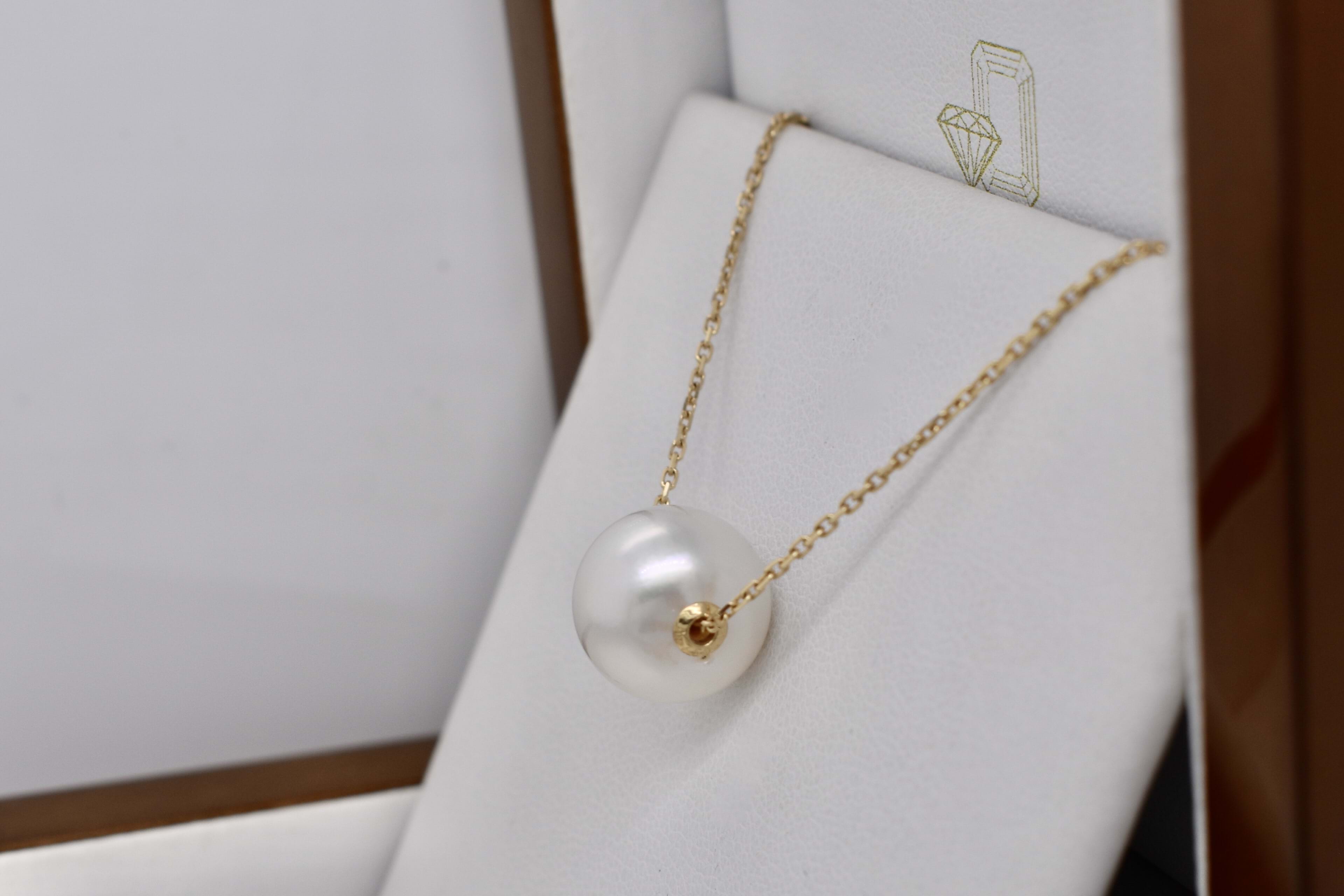 The prettiest south sea pearl necklet, featuring one white 12-12.5mm near round, good lustre pearl on an 18ct yellow gold diamond cut cable link chain. Chain goes through a drilled whole in the centre of the pearl to give a floating effect. Necklace measures 50cm long but is adjustable. Independent Valuation Supplied.