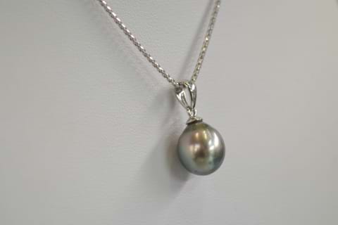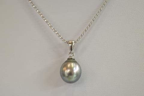 A lustrous and baroque drop Tahitian pearl with silver undertones. Measuring 10.5-11mm this pearl is suspended from a 9ct white gold bale. Chains available for separate purchase