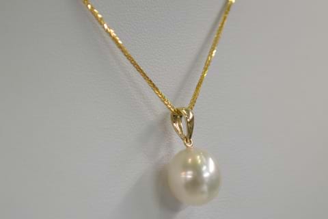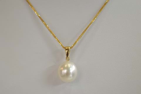 A drop shape white south sea pearl measuring 10.5-11mm with a lovely lustre and suspended from 9ct yellow gold bale. Chains available for separate purchase