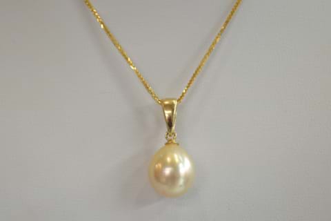 With a stunning champagne hue and lustre this south sea pearl is a drop shape and measures 11.5-12mm and is set with a 9ct yellow gold bale. Chains available for separate purchase