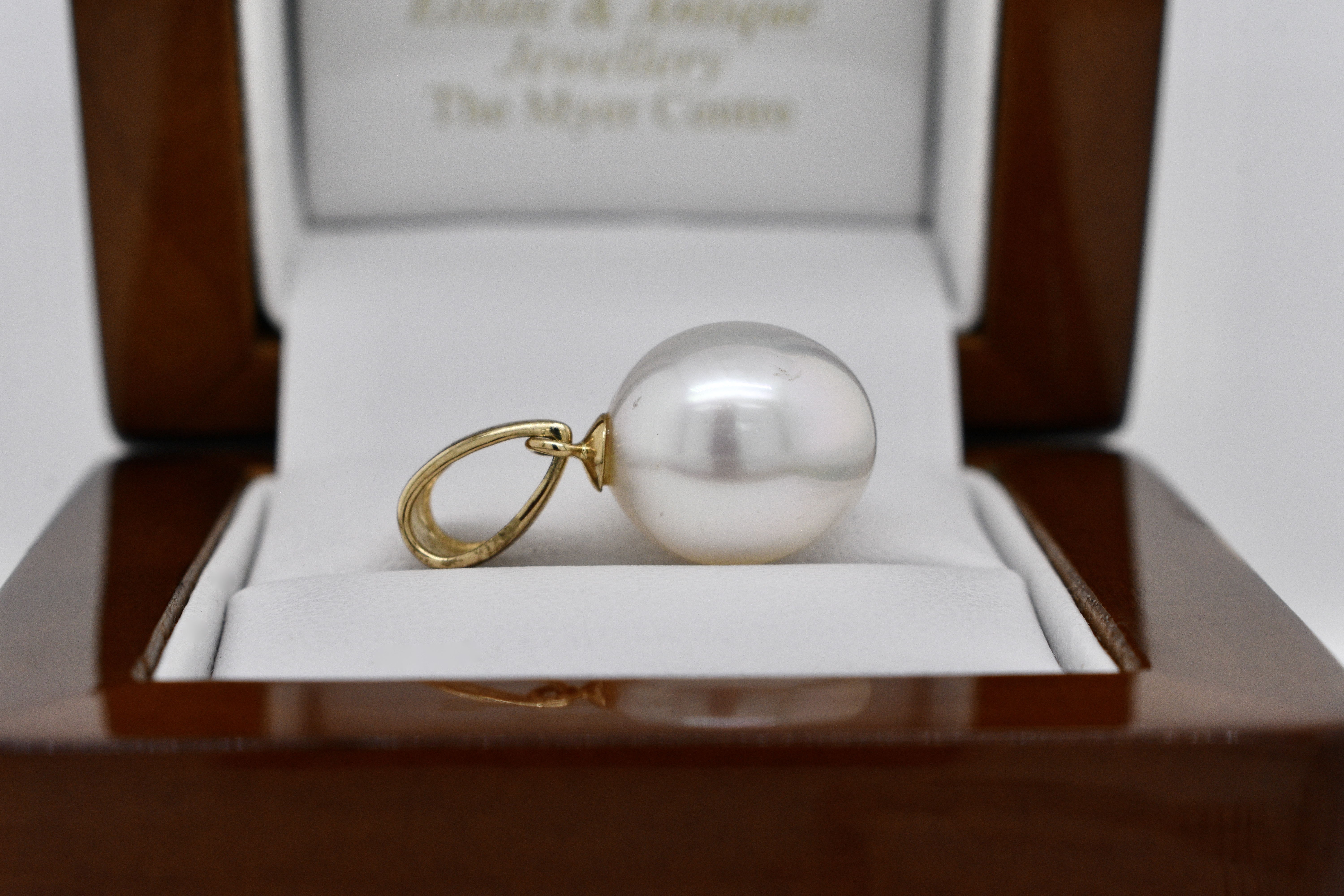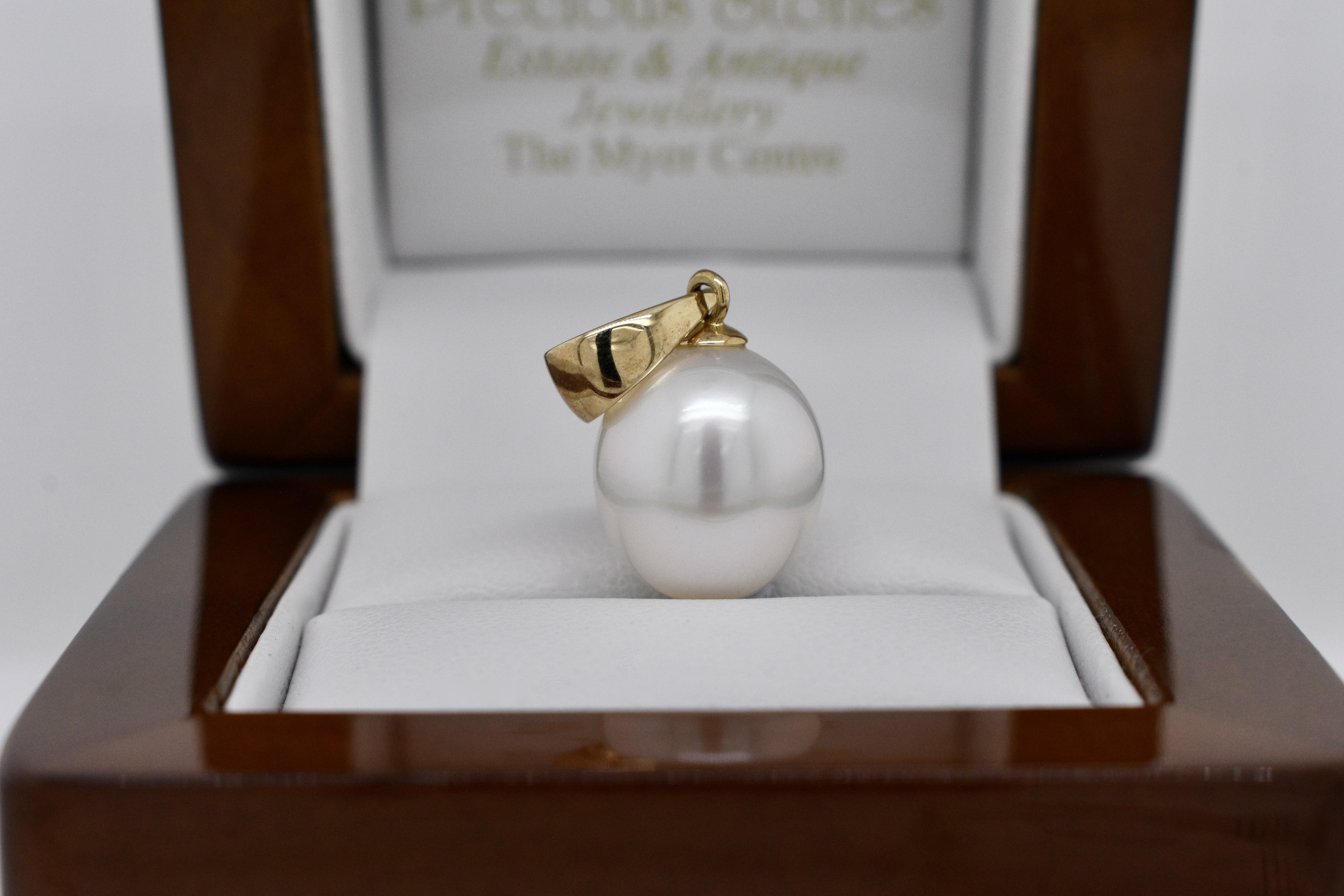 Set with a 9ct yellow gold bale this white, oval shape, south sea pearl measures 12-12.5mm. Chains available for separate purchase