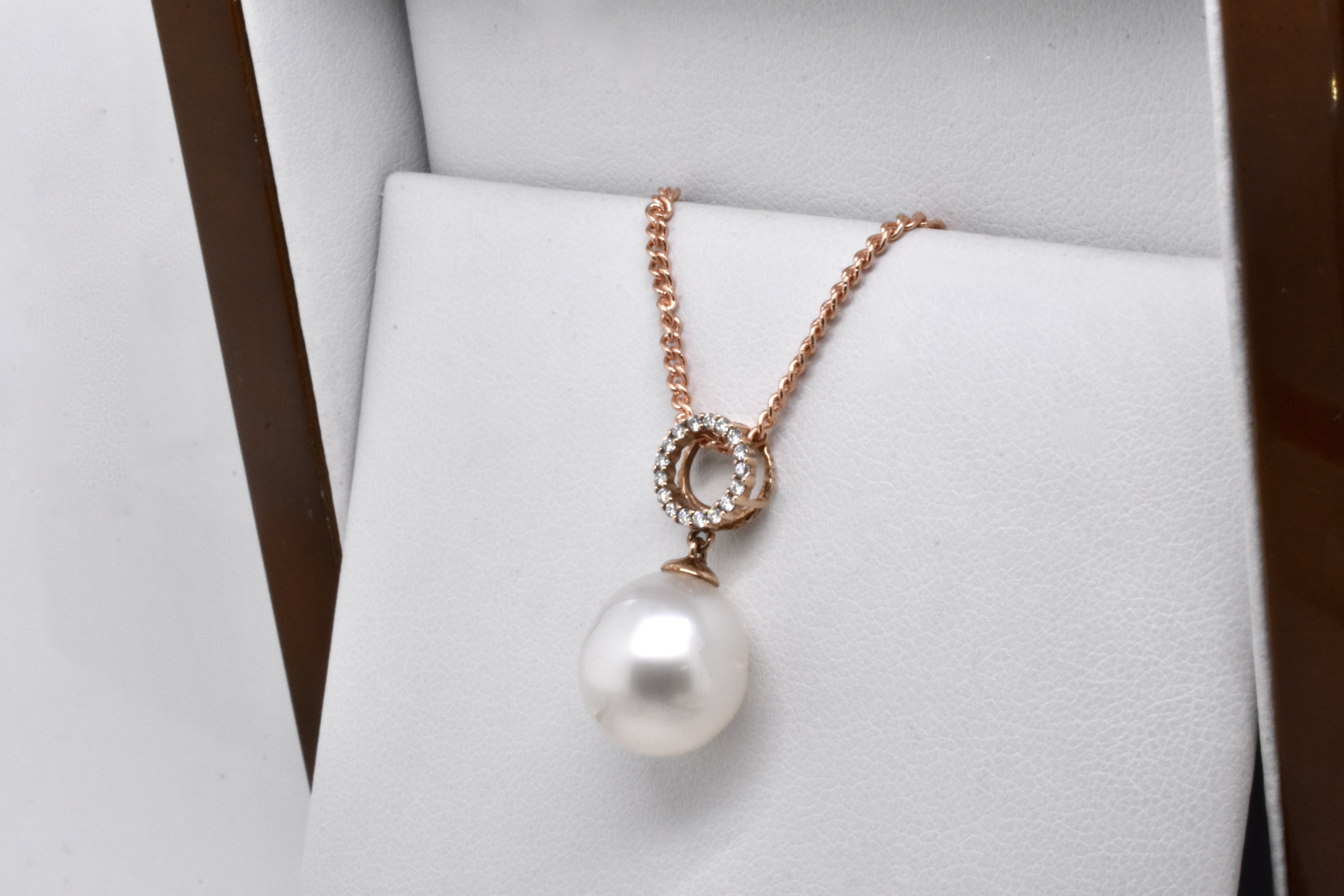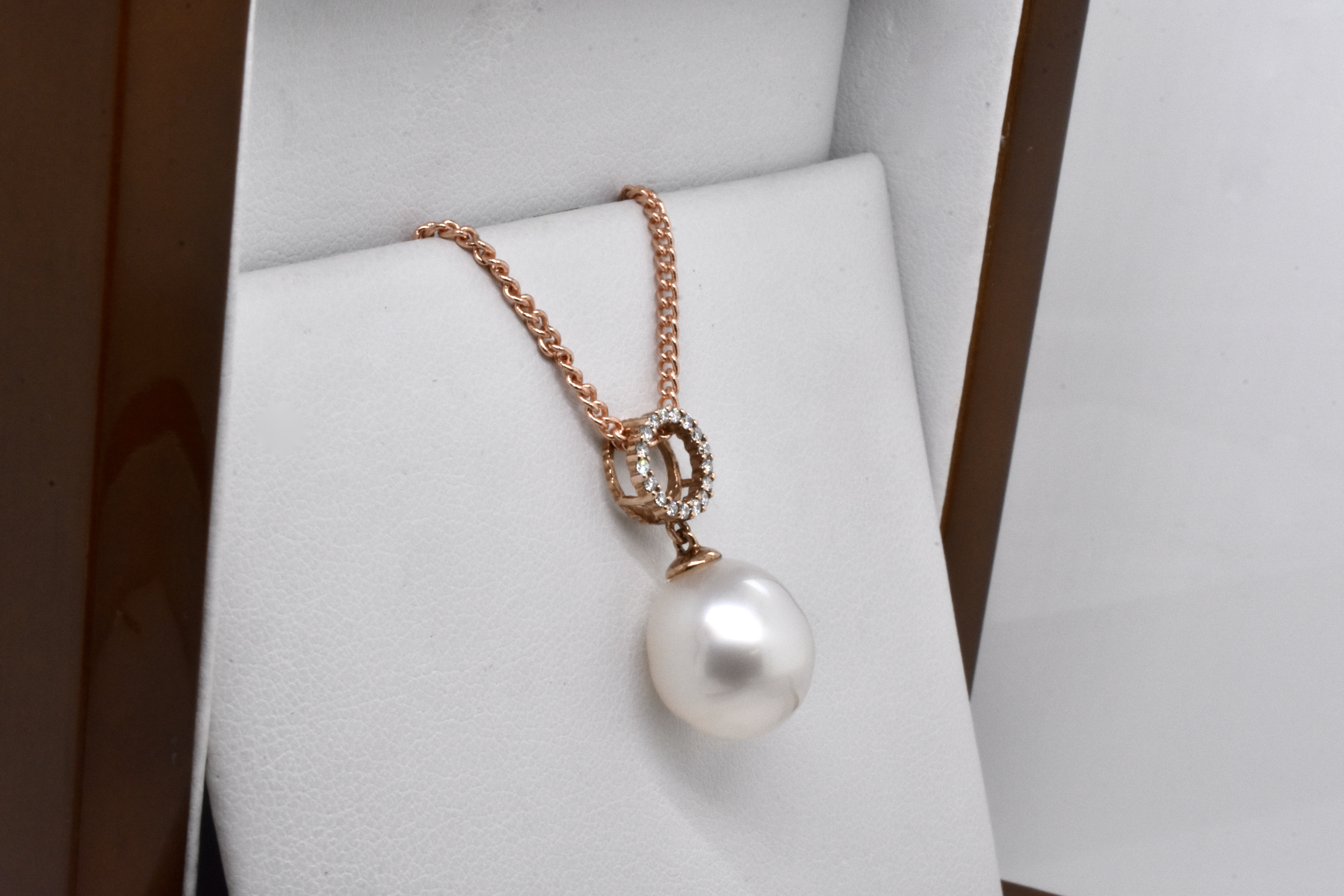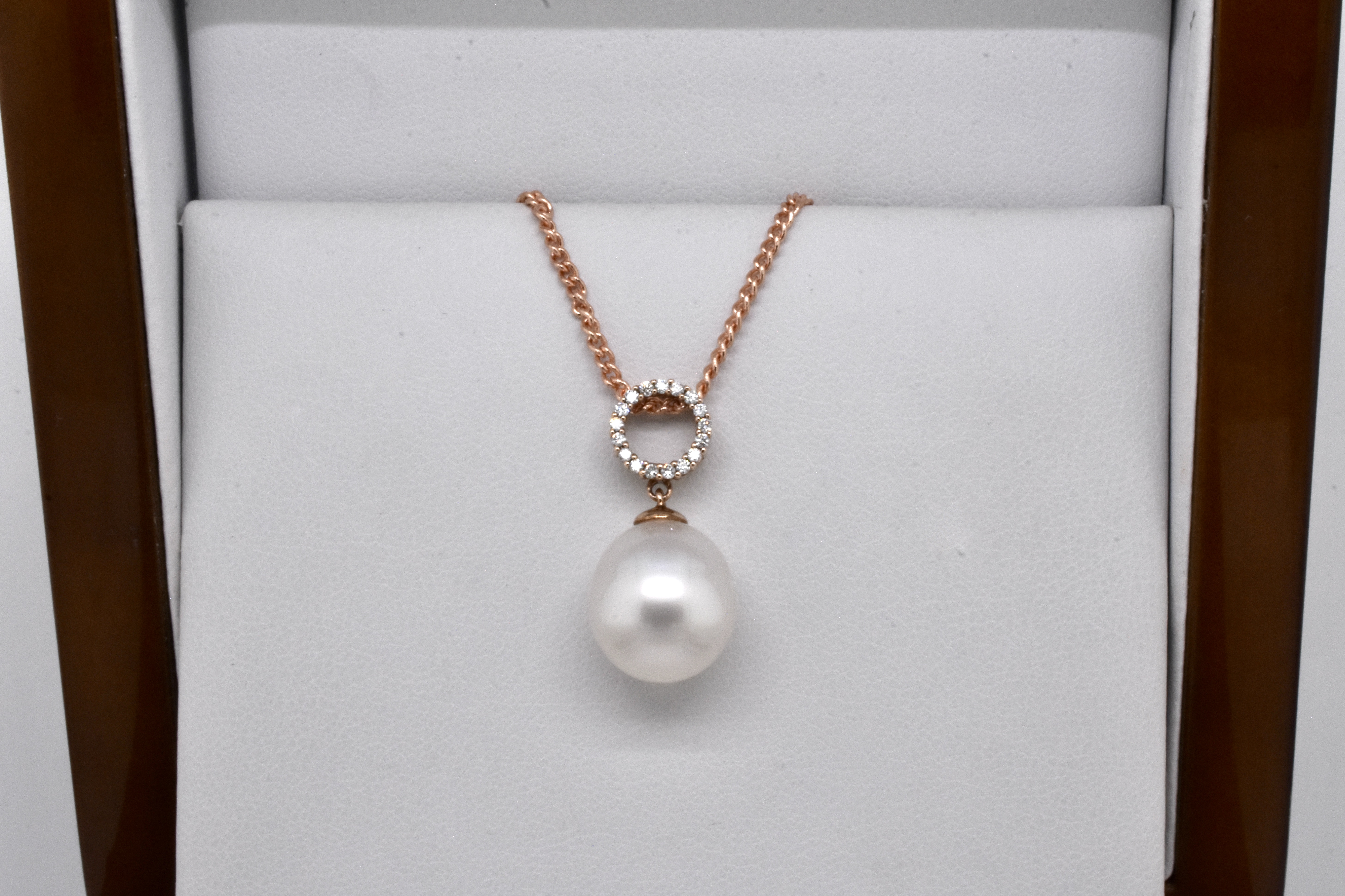 The perfect combination of modern and classic, this 9ct rose gold pendant has a circle of 17 equalling 0.102ct G/VS-SI white, sparkly diamonds with a 11-12mm near round, white south sea pearl with good lustre drop. Chains available for separate purchase. Independent Valuation Supplied