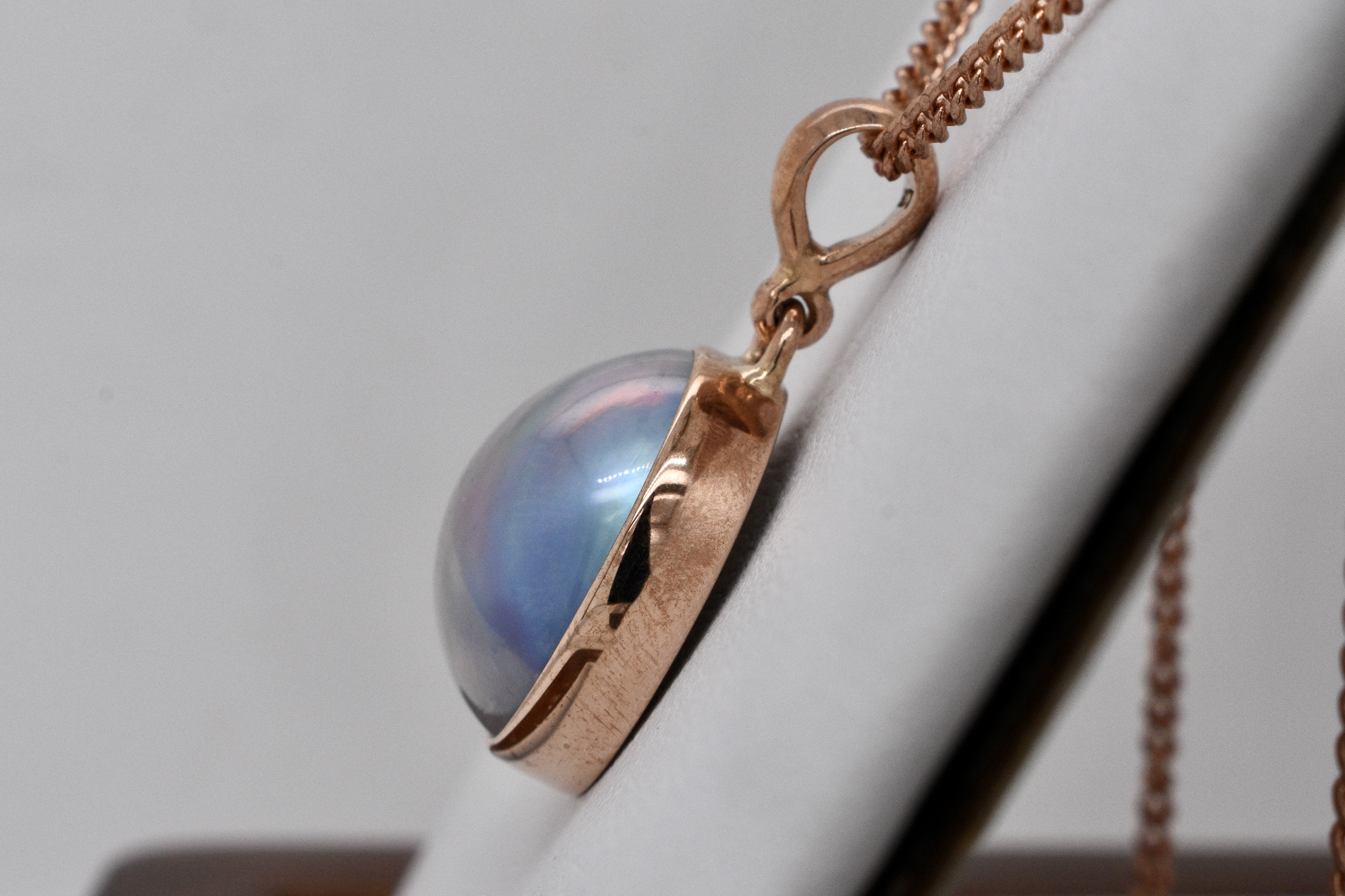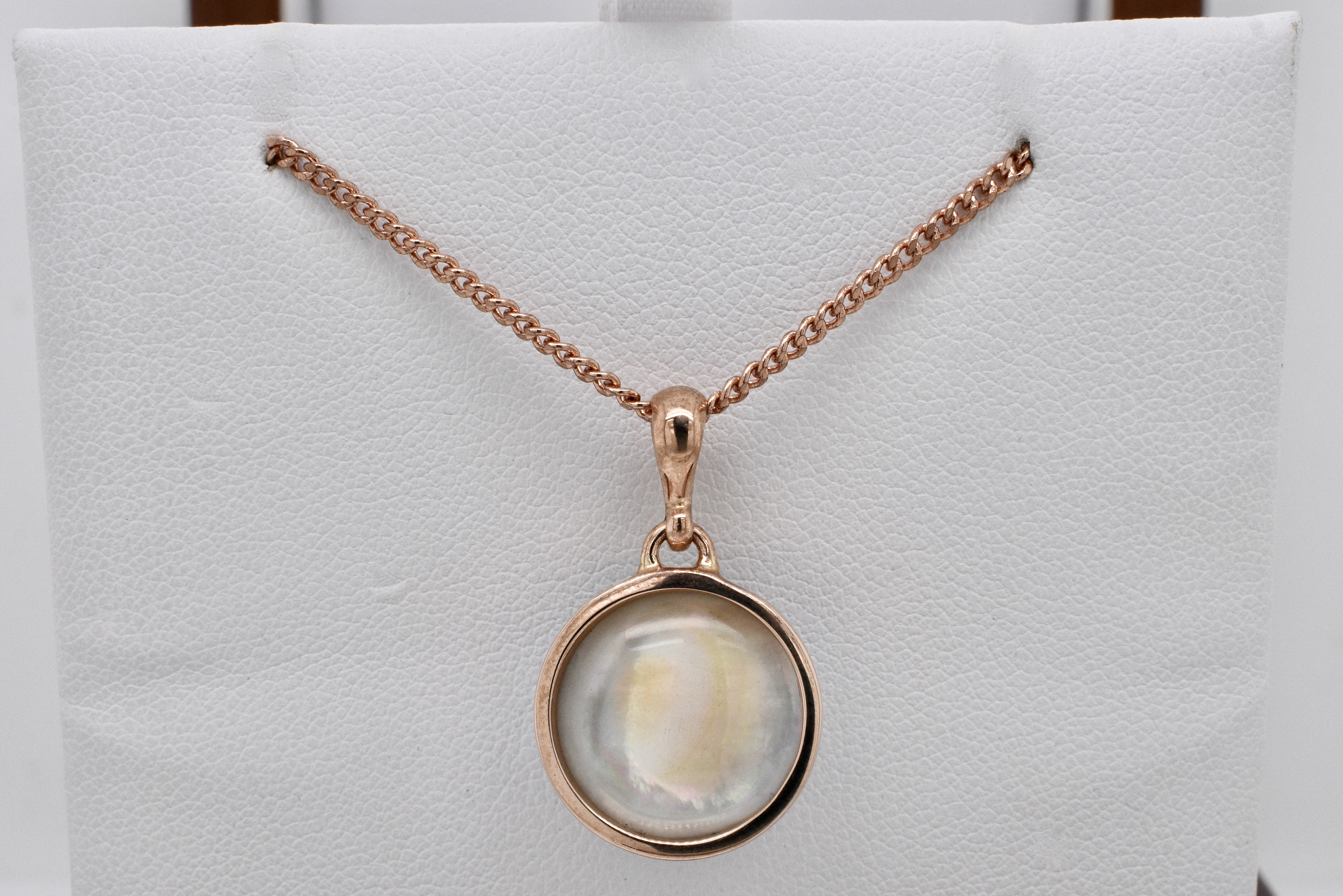 9ct rose gold handmade pendant featuring a 15mm dyed black Mabe pearl in a bezel setting. Chains are available for separate purchase