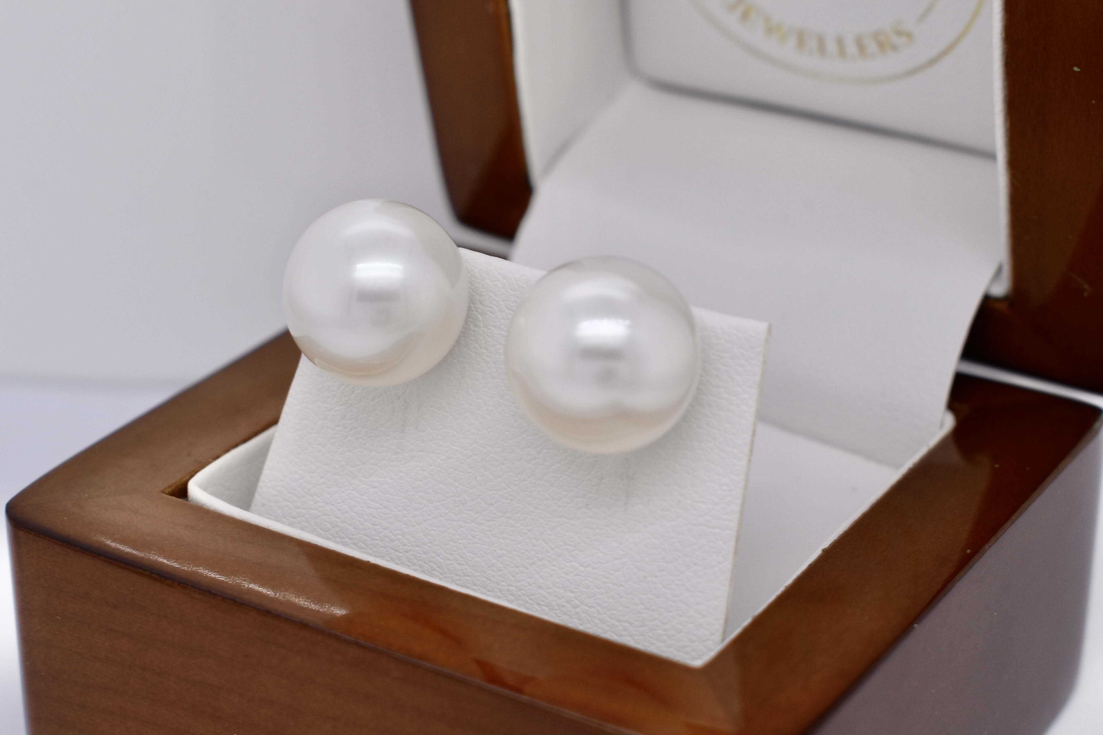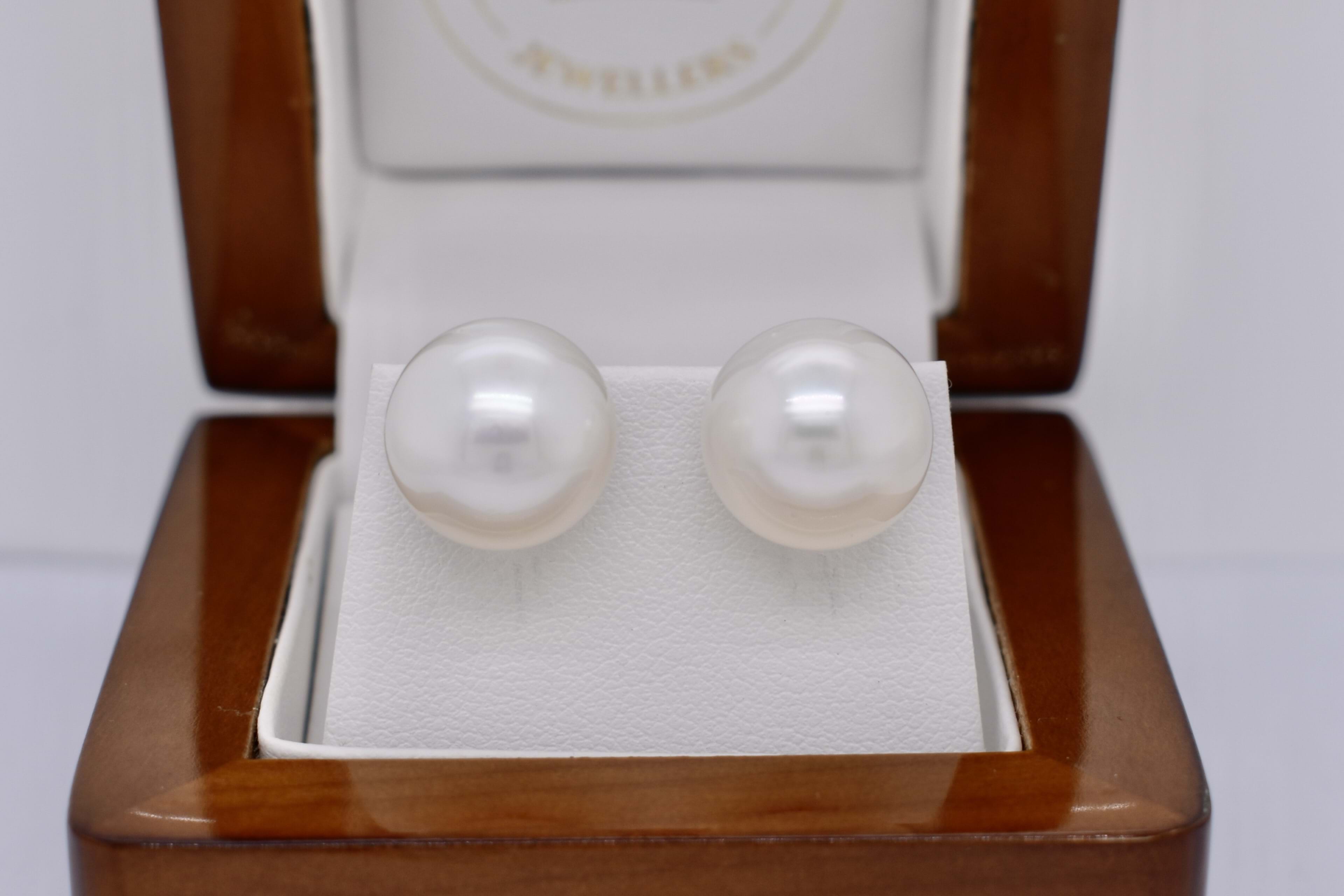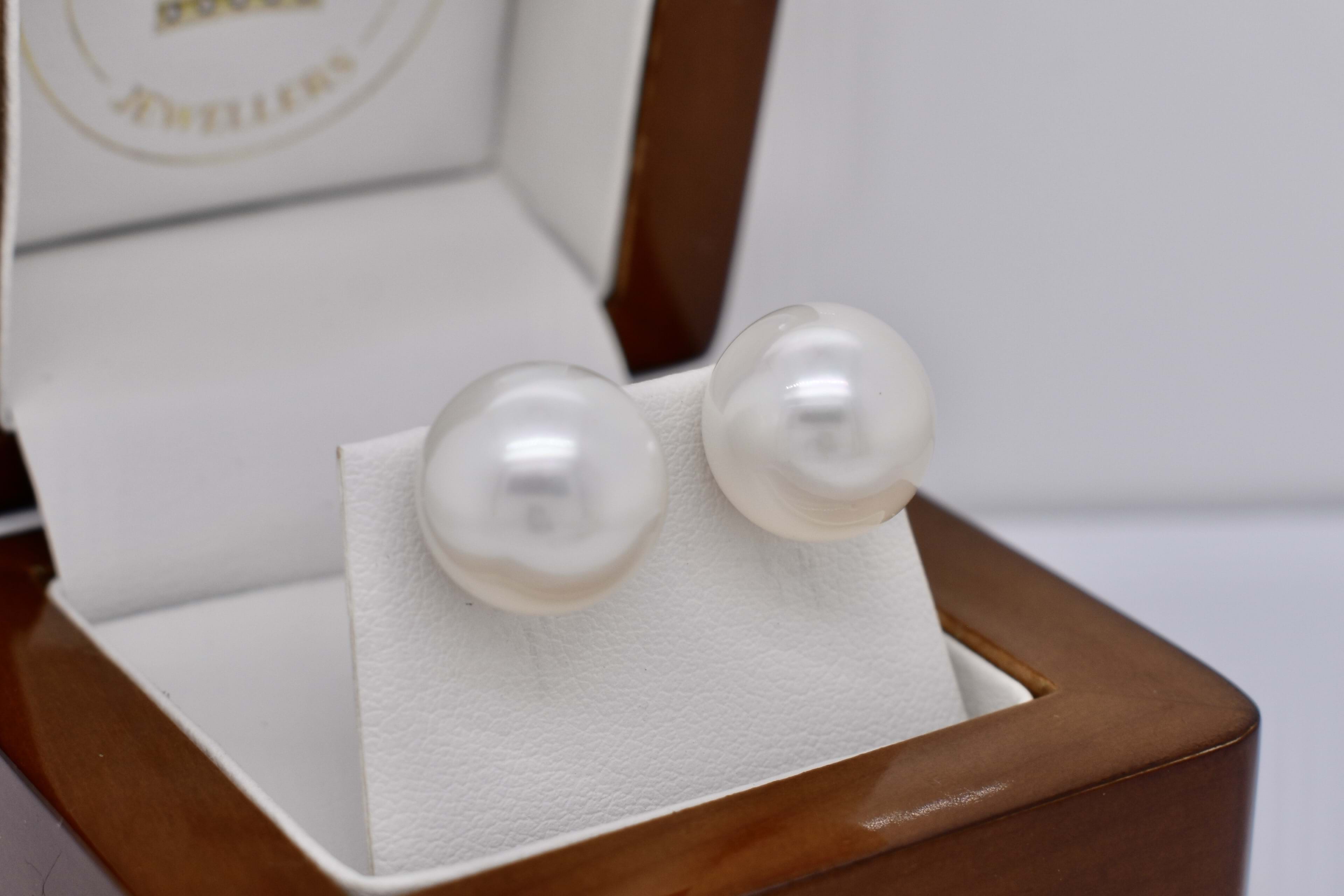 This lovely pair of pearl studs feature large 12.5-13mm near round, white south sea pearls, with a good lustre, in 9ct white gold settings with post and butterfly fittings. Independent Valuation Supplied.