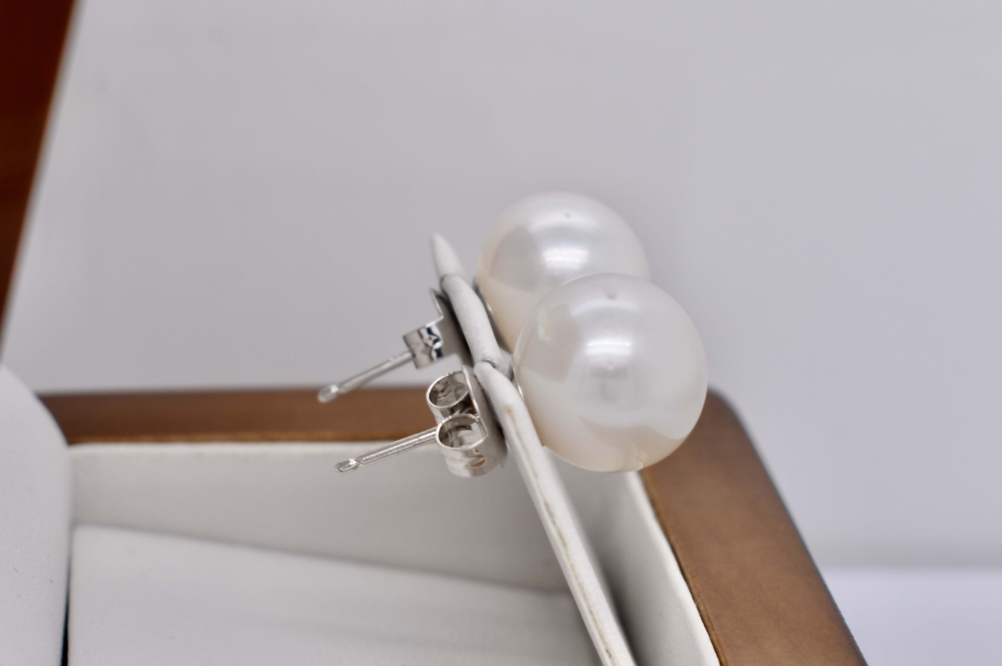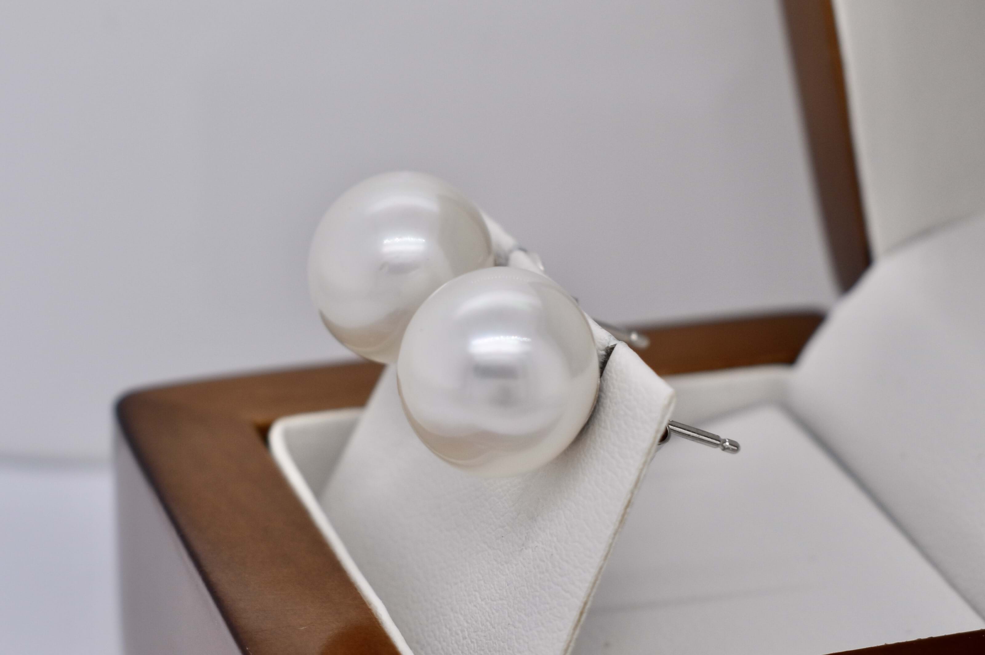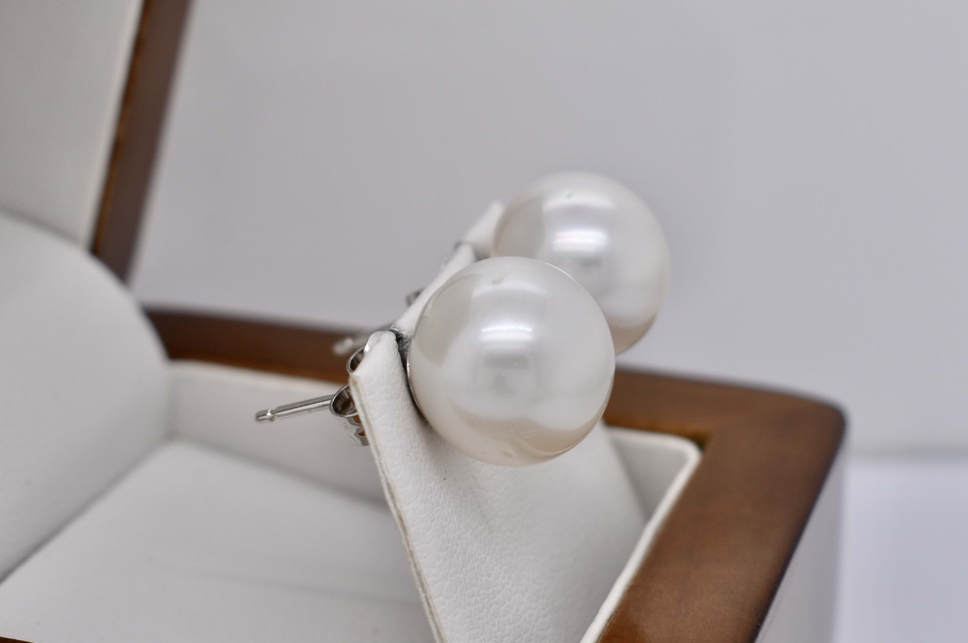 This lovely pair of pearl studs feature large 12.5-13mm near round, white south sea pearls, with a good lustre, in 9ct white gold settings with post and butterfly fittings. Independent Valuation Supplied.