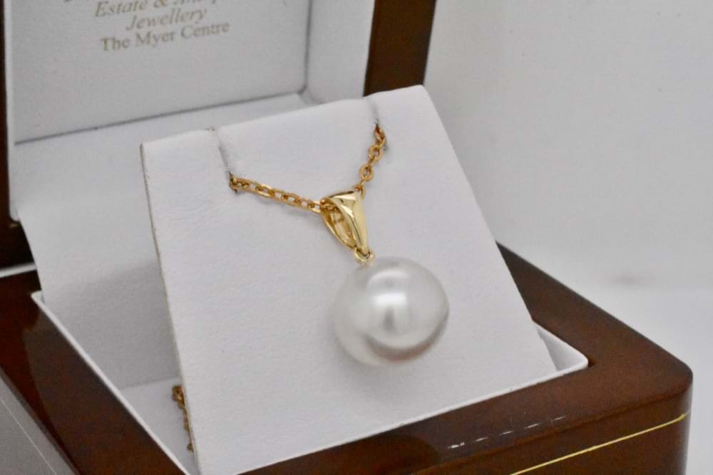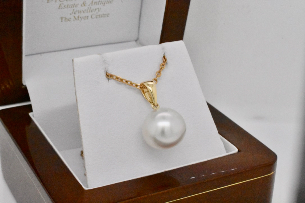 Stunning gift idea! This beautiful Australian white south sea pearl is a button shape and measures 11-11.5mm with a lovely lustre. It has been set onto a plain and classic 9ct yellow gold pendant bale. Chains available for separate purchase