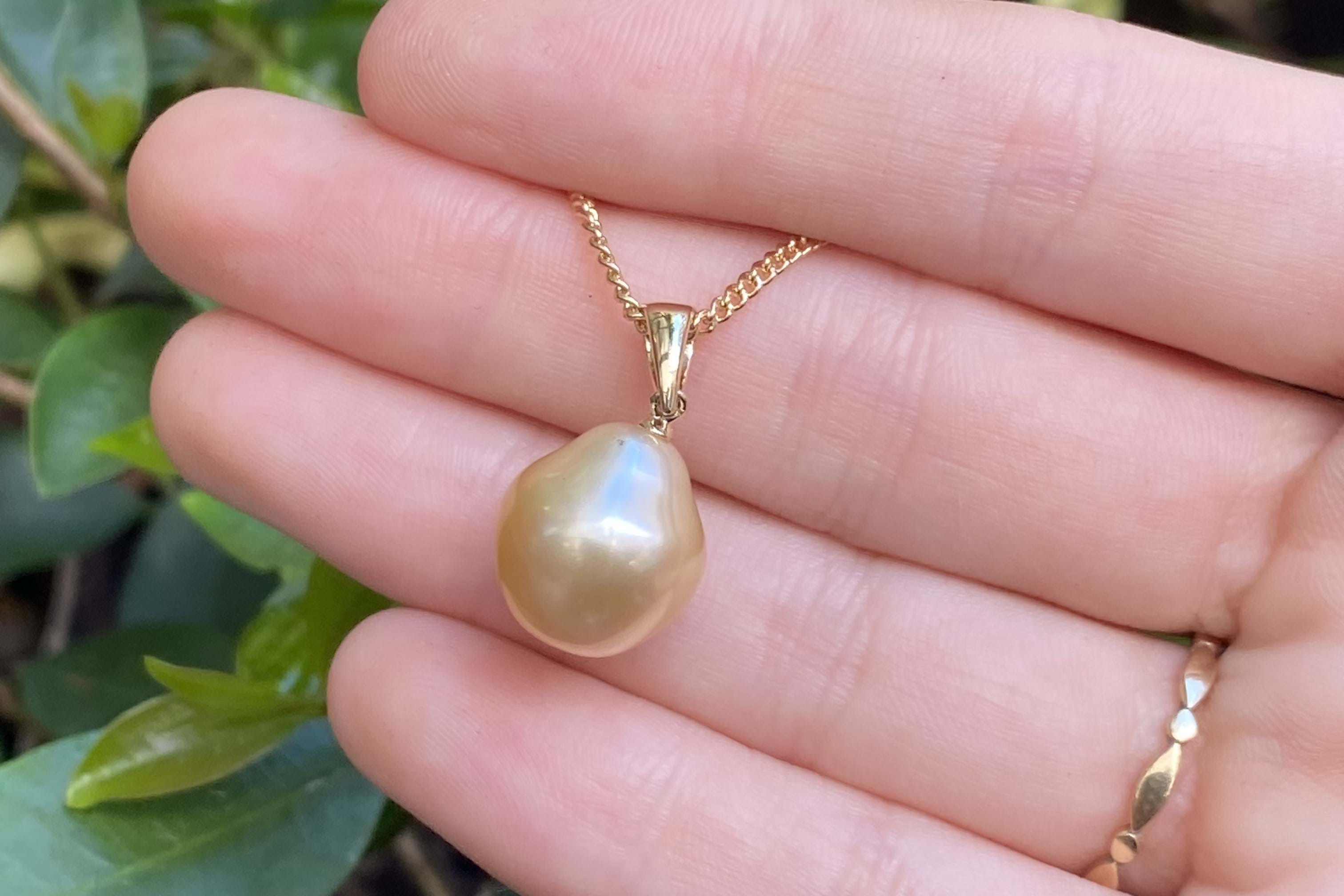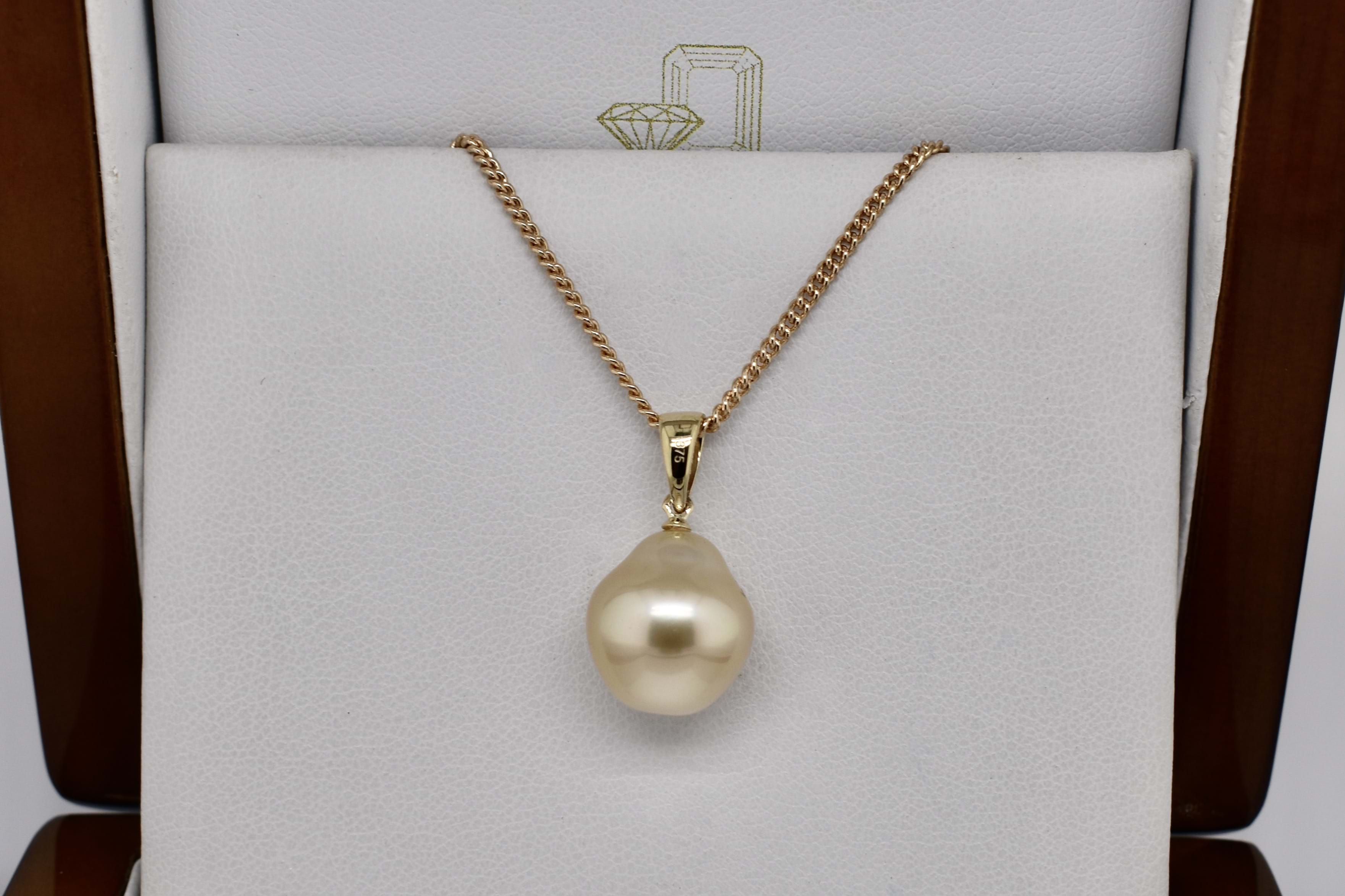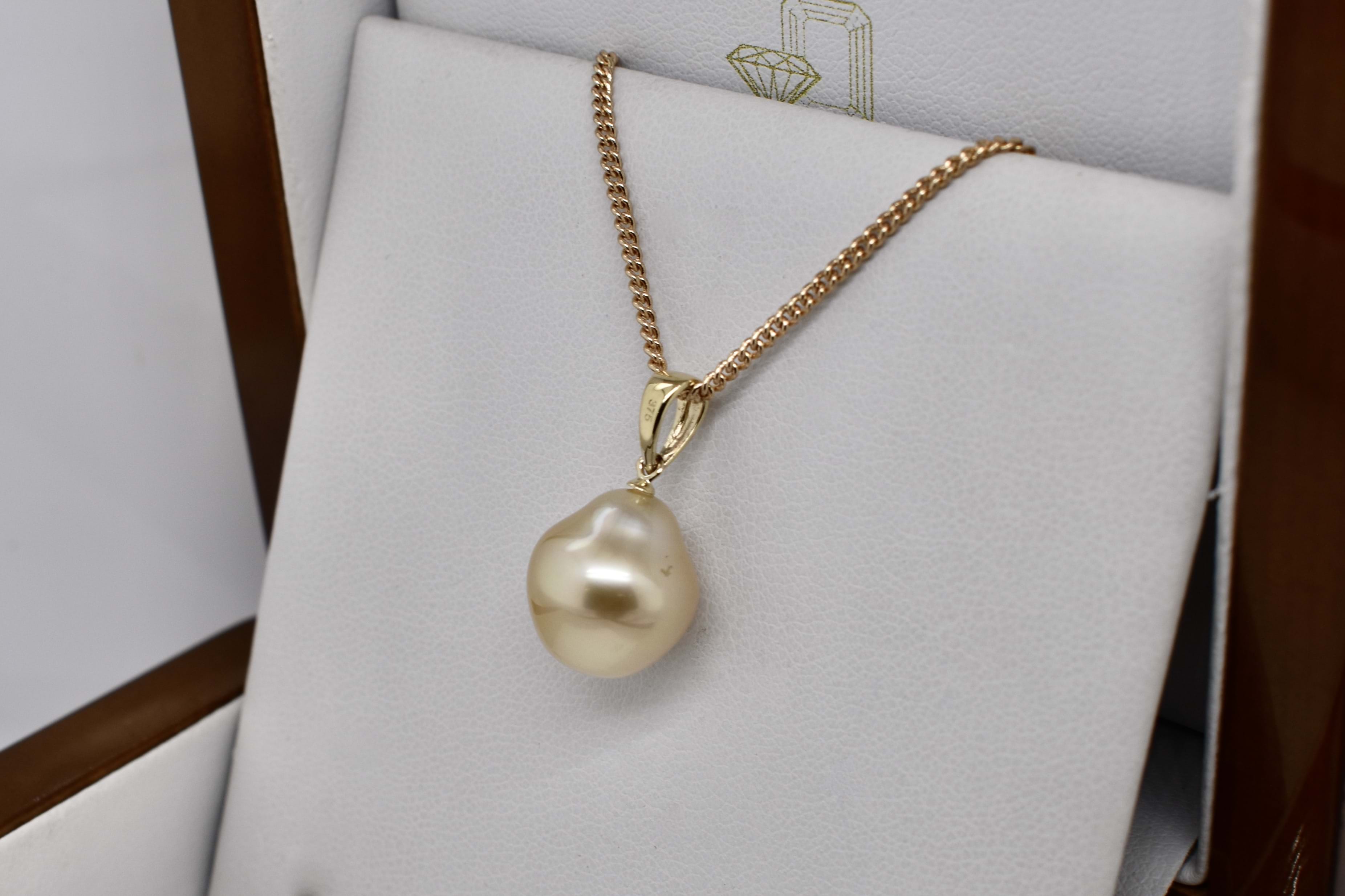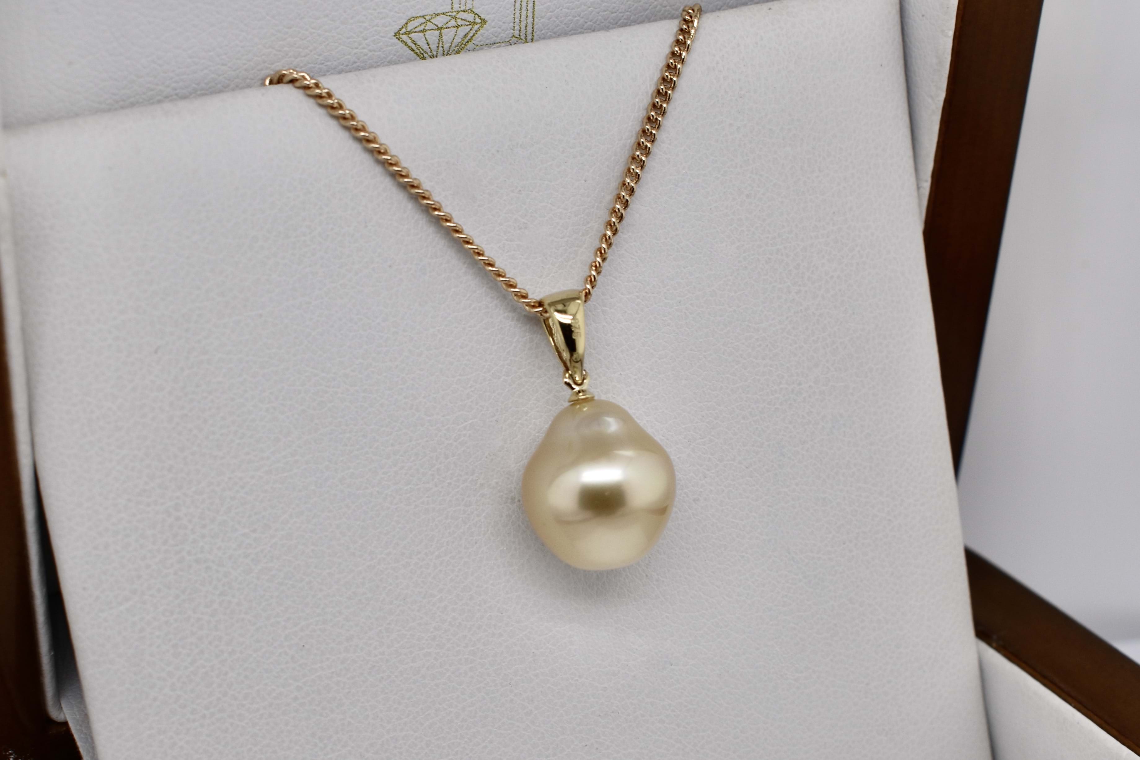 Stunning mid golden hue south sea pearl in a drop shape measuring 12-13mm and set with an articulated tapered 9ct yellow gold pendant bale. Chains are available for separate purchase