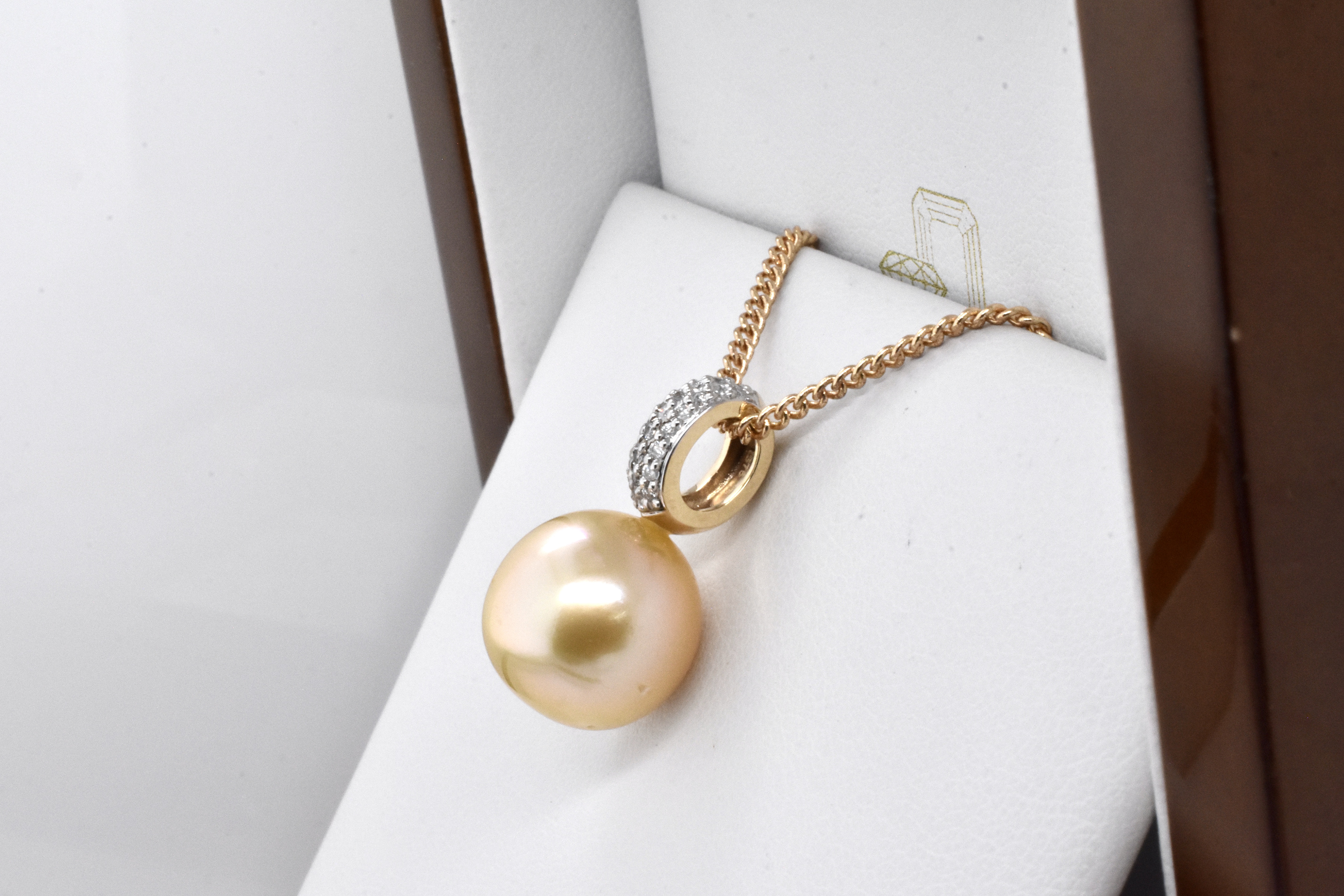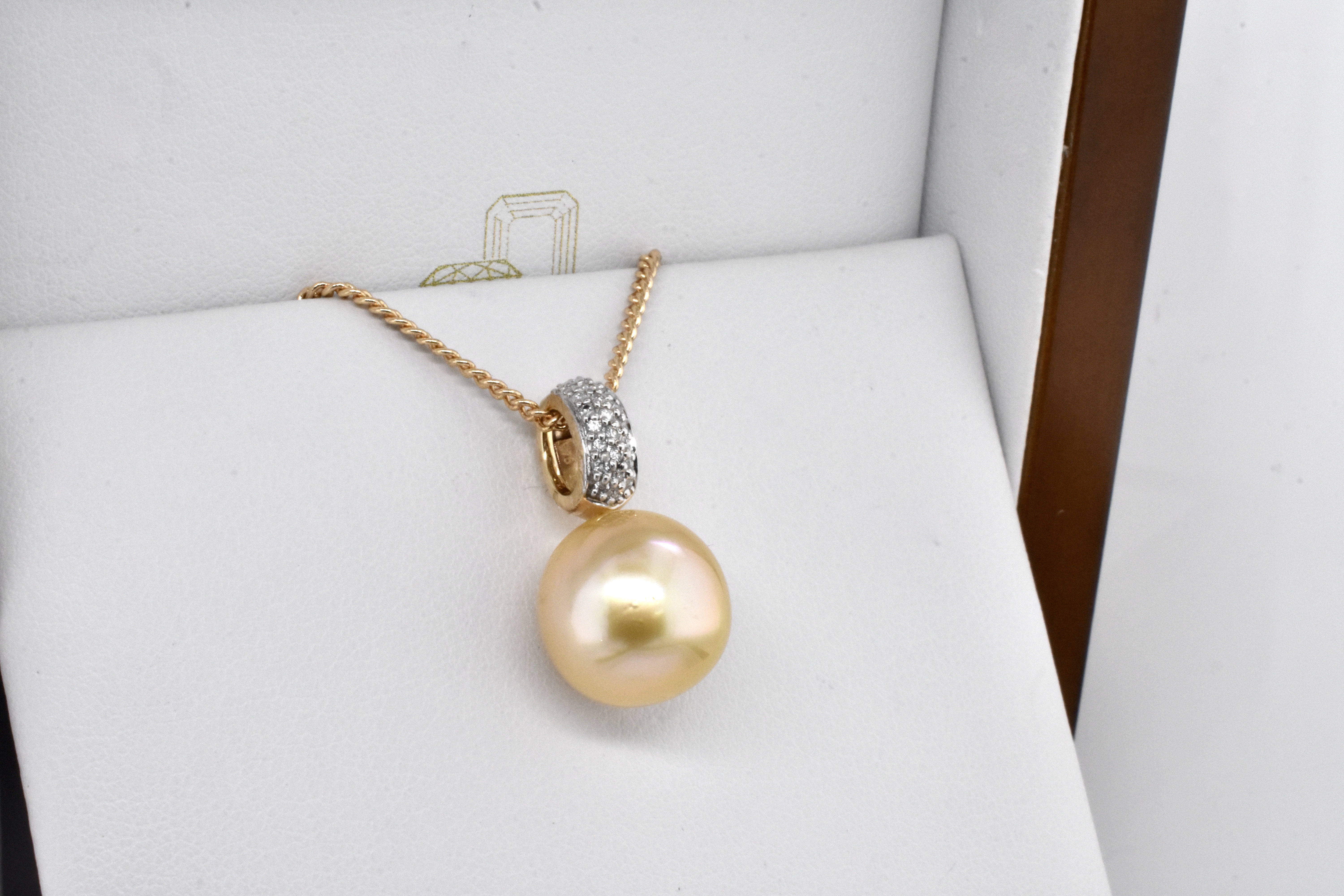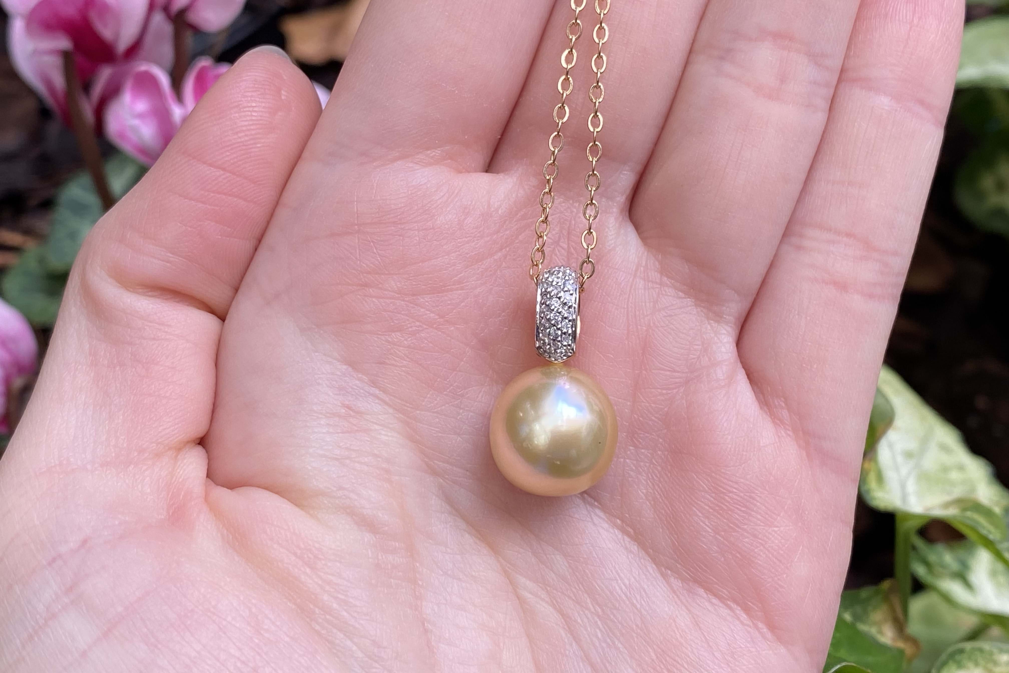 A gorgeously sparkly pearl and diamond pendant made in 9ct yellow gold, set with a 12.5-13mm golden south sea pearl with good lustre, with a white pave diamond encrusted bail of 25 RBCs totalling 0.13ct G/SI. Chains available for separate purchase