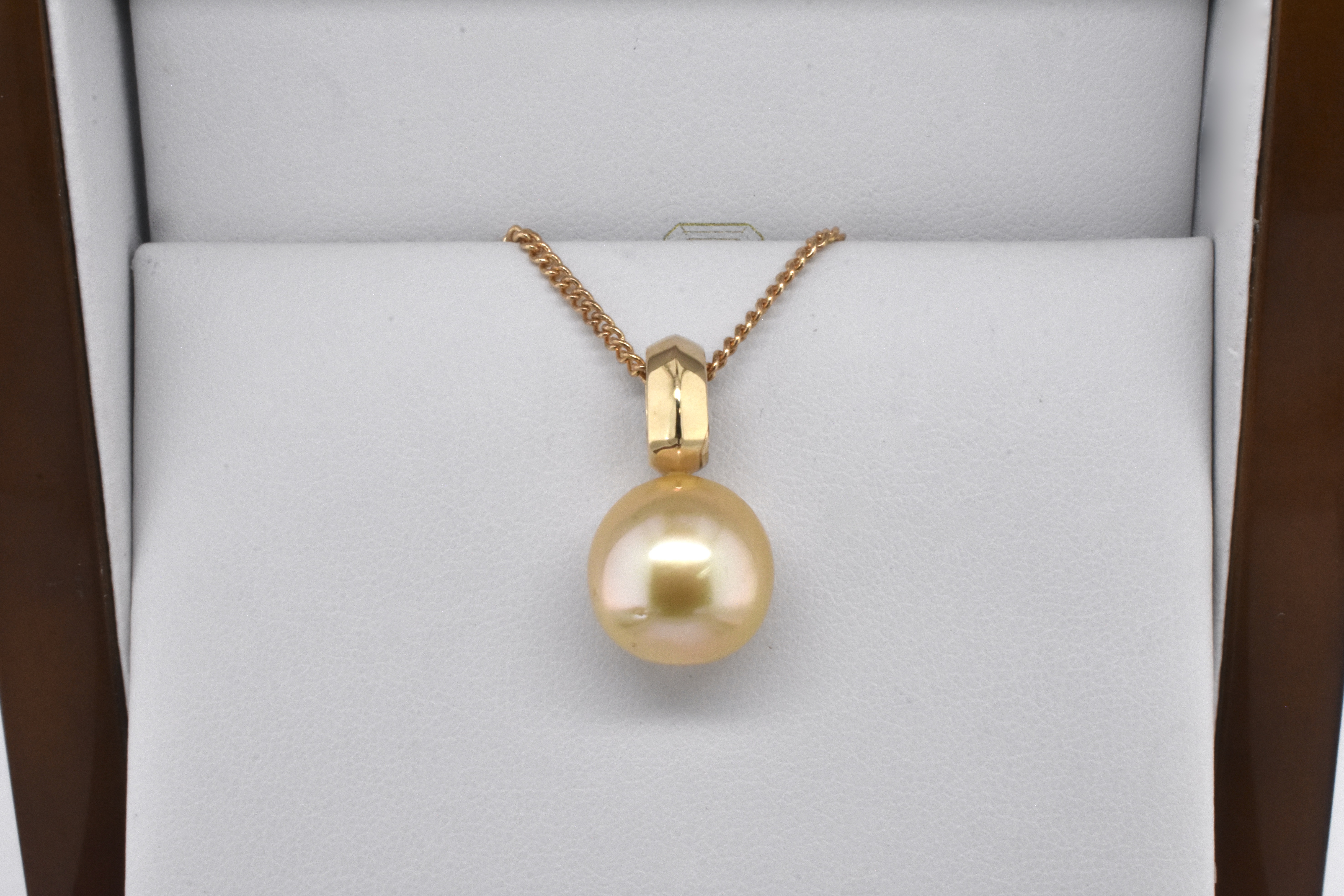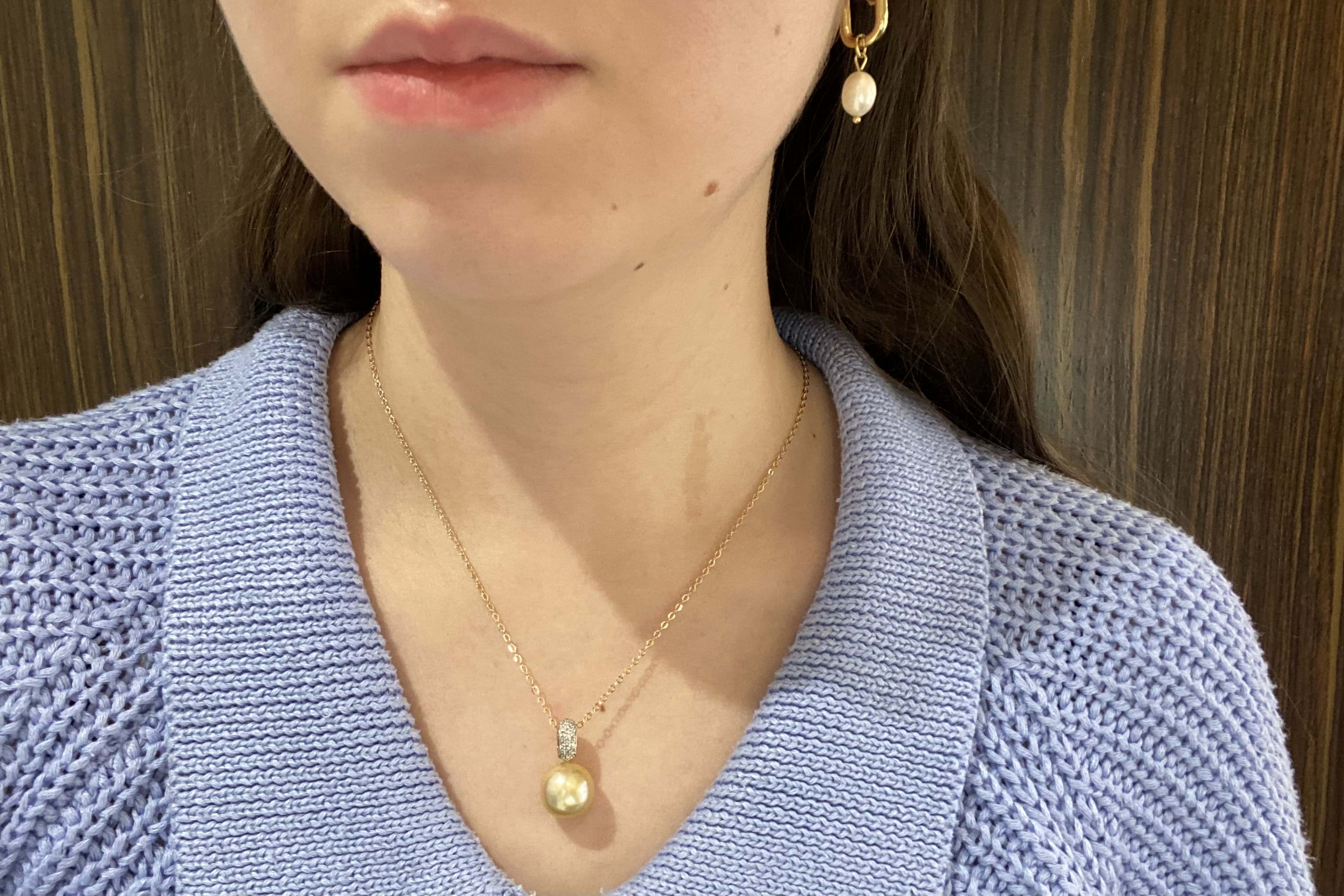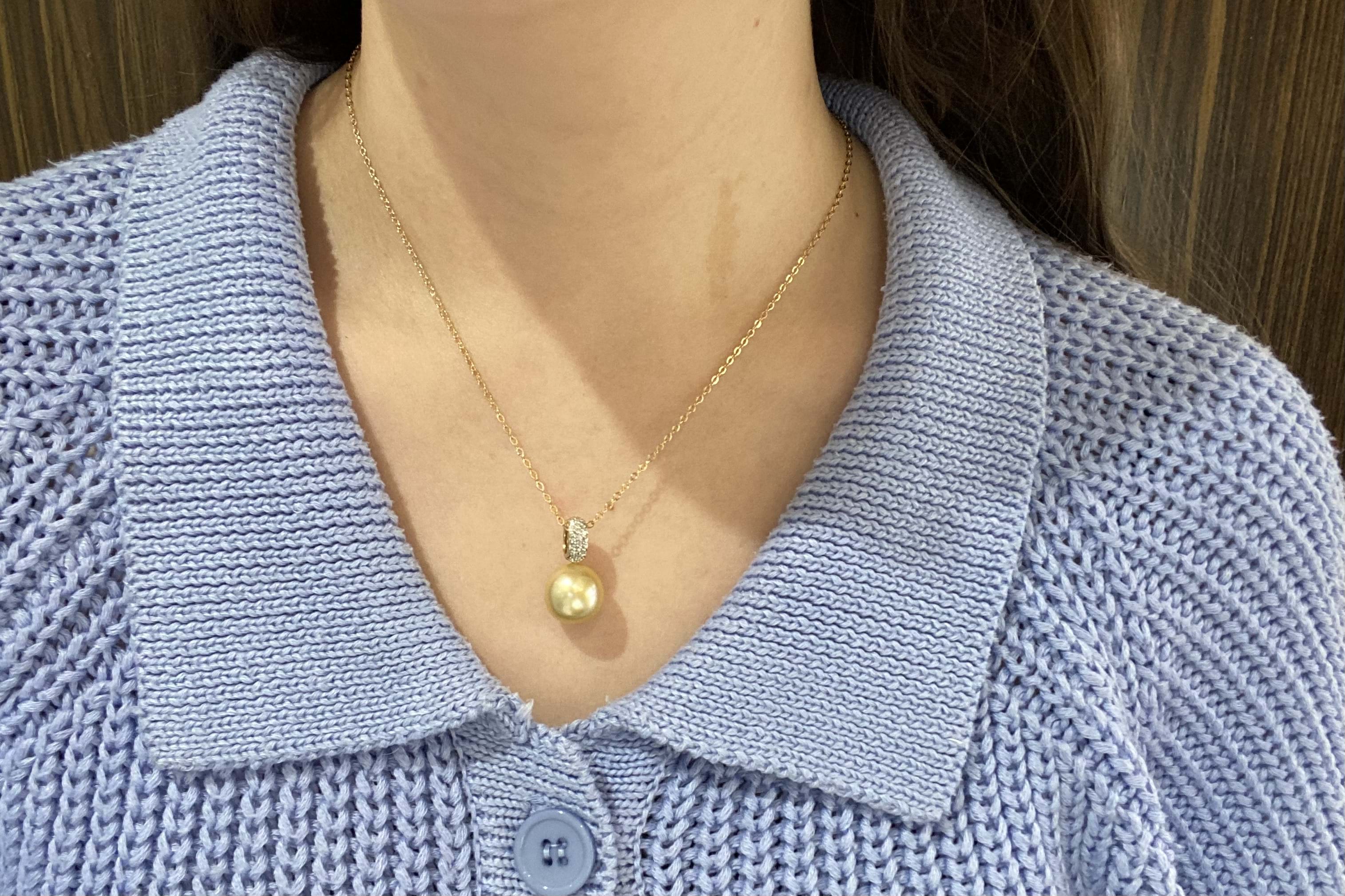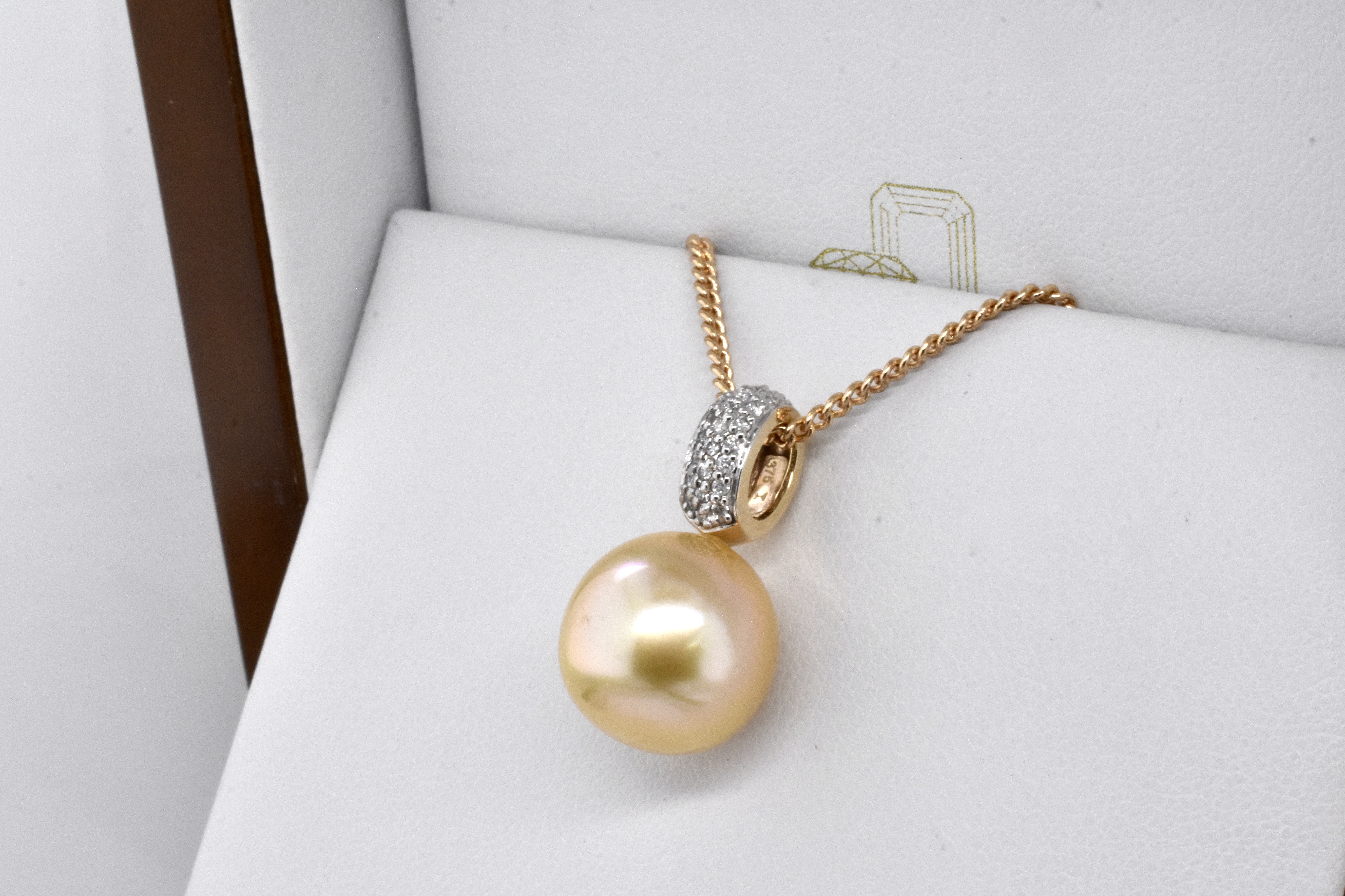 A gorgeously sparkly pearl and diamond pendant made in 9ct yellow gold, set with a 12.5-13mm golden south sea pearl with good lustre, with a white pave diamond encrusted bail of 25 RBCs totalling 0.13ct G/SI. Chains available for separate purchase