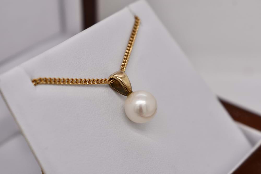A plain 9ct yellow gold pendant with a cream/white freshwater pearl measuring 9-9.5mm. Chains are available for separate purchase