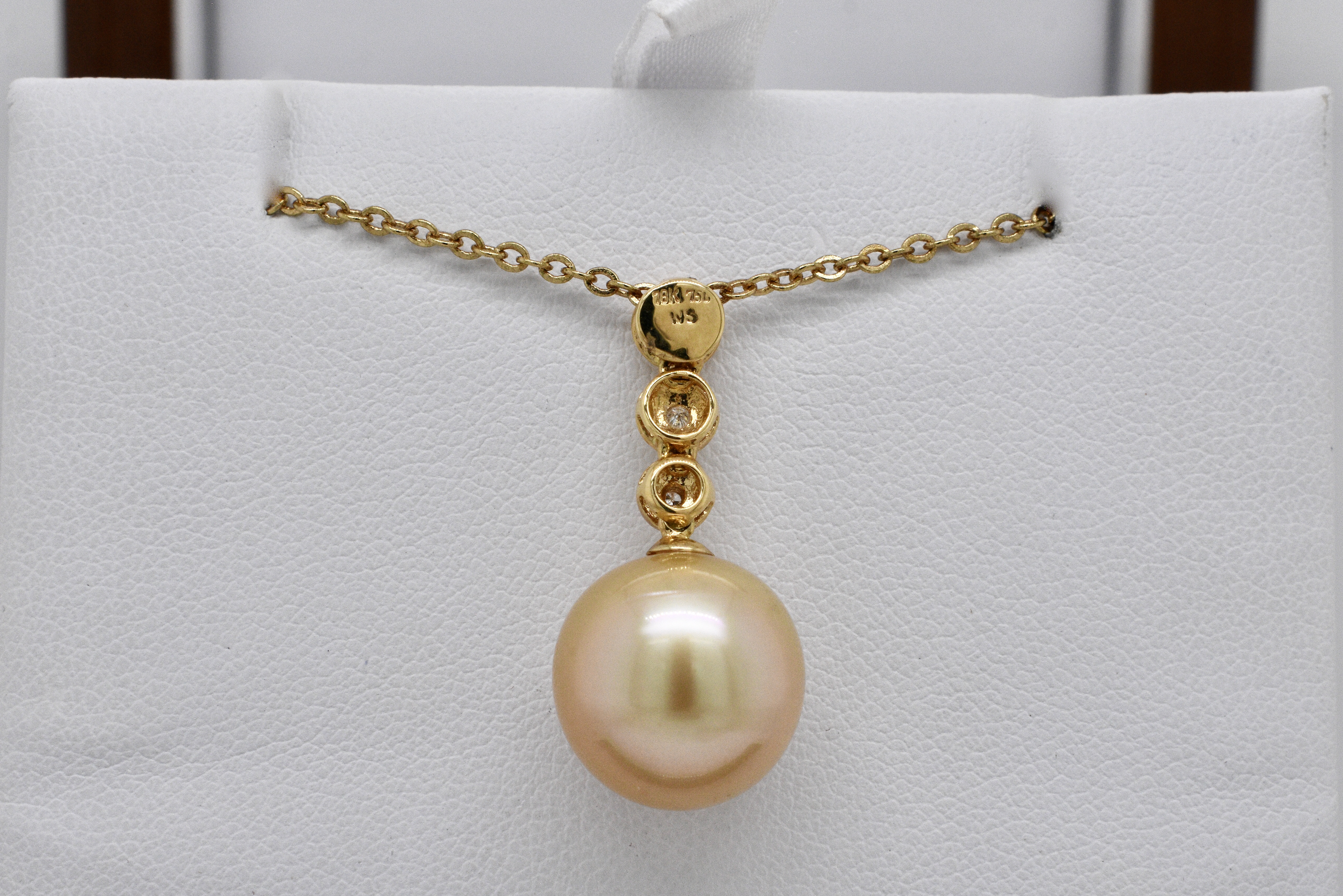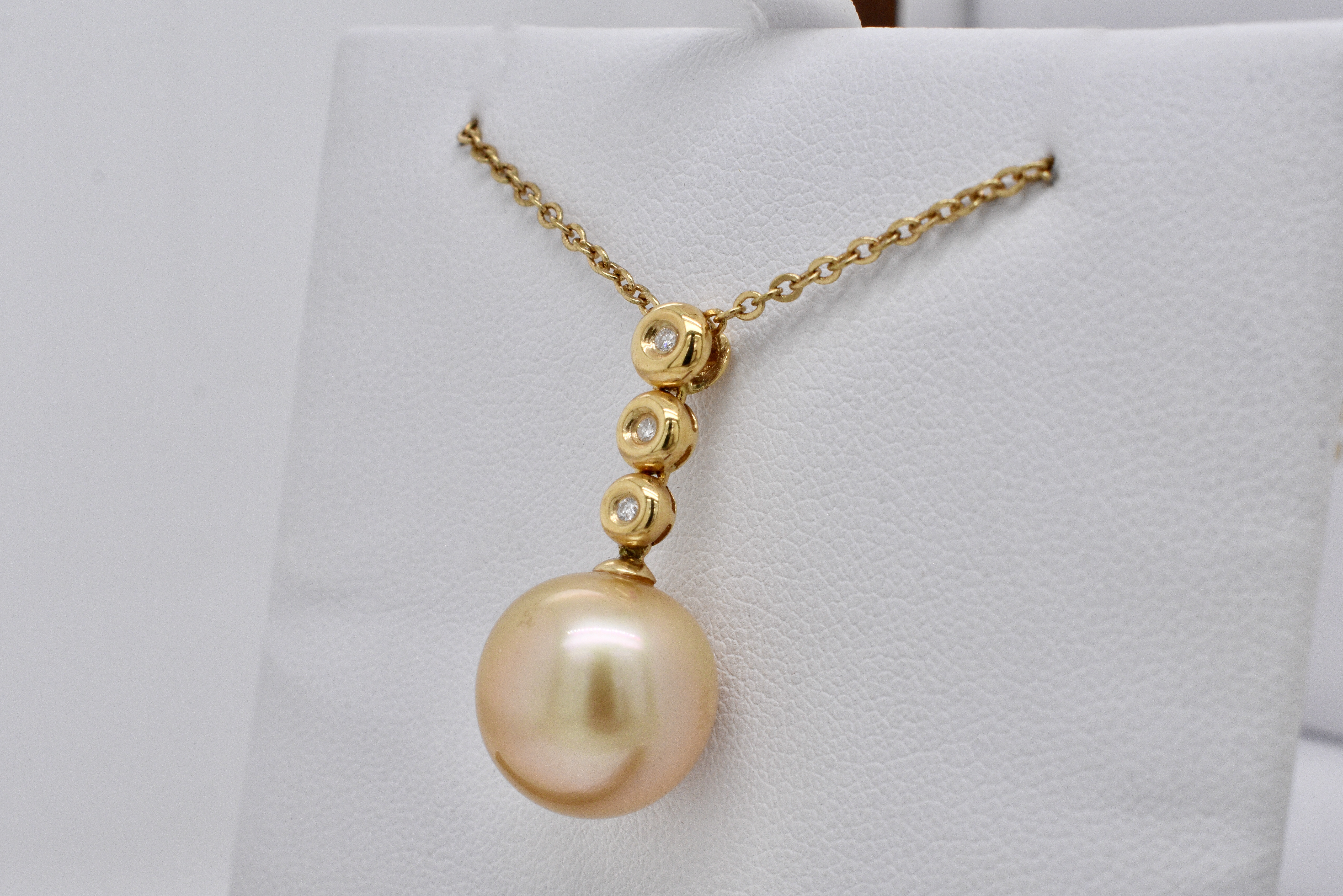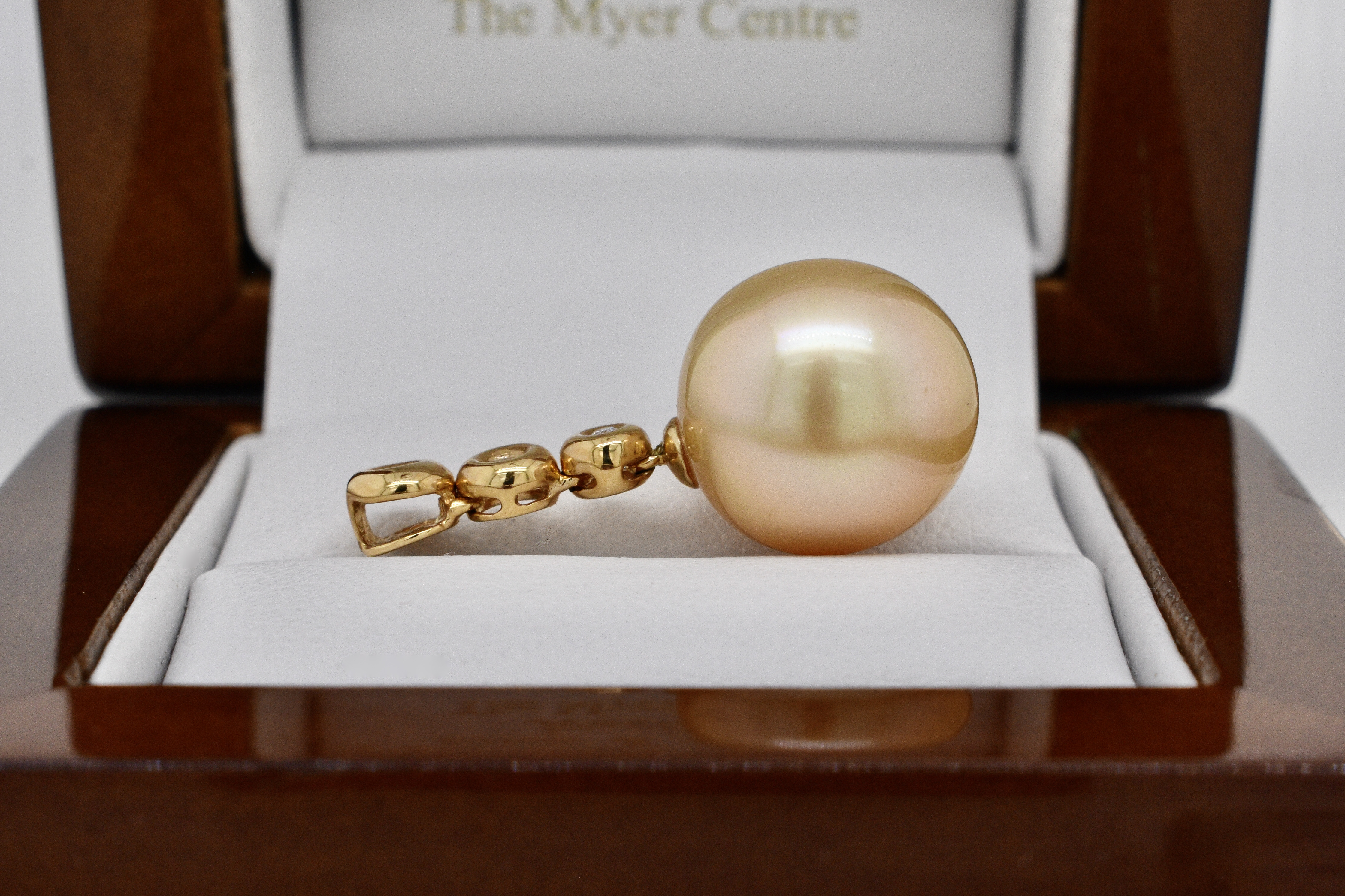 Bezel set into 18ct yellow gold these three small shimmering diamonds lead the eye down to a stunning lustrous golden south sea pearl measuring 12.5-13mm. Independent Valuation Supplied