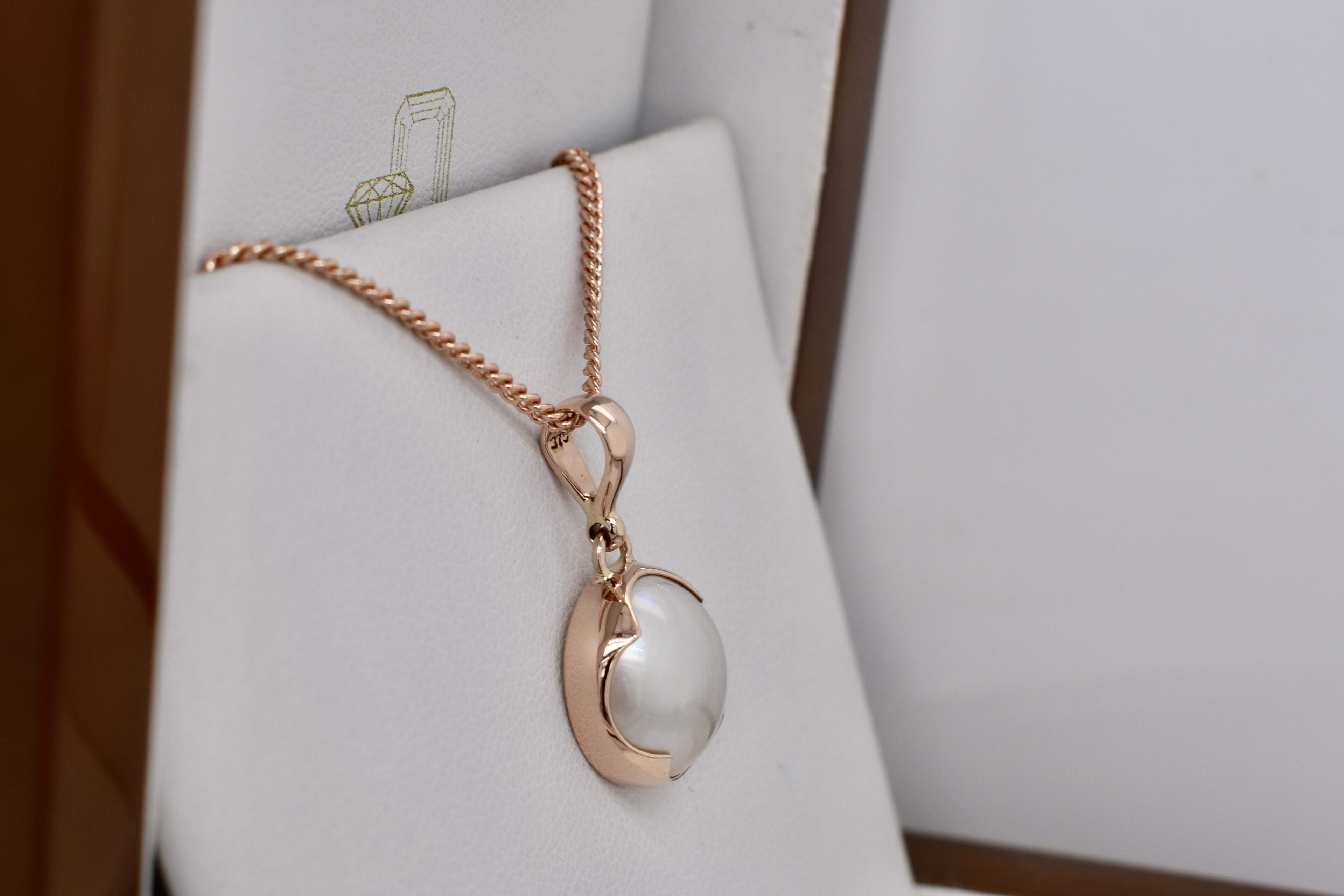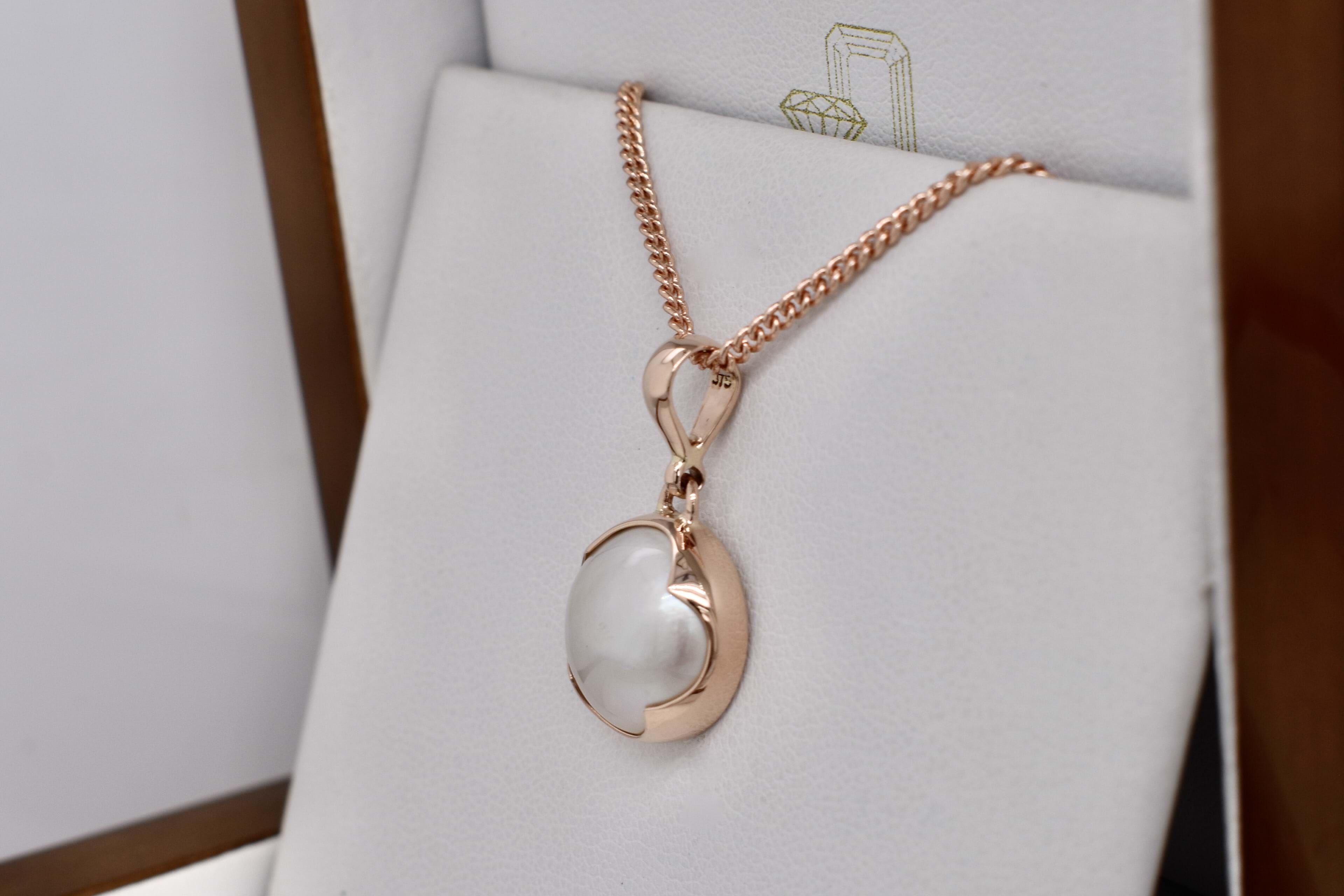 Beautiful handmade 9ct rose gold pendant featuring a 14mm round white lustrous mabe pearl in a scalloped bezel setting with a plain bale. Chains are available for separate puchase