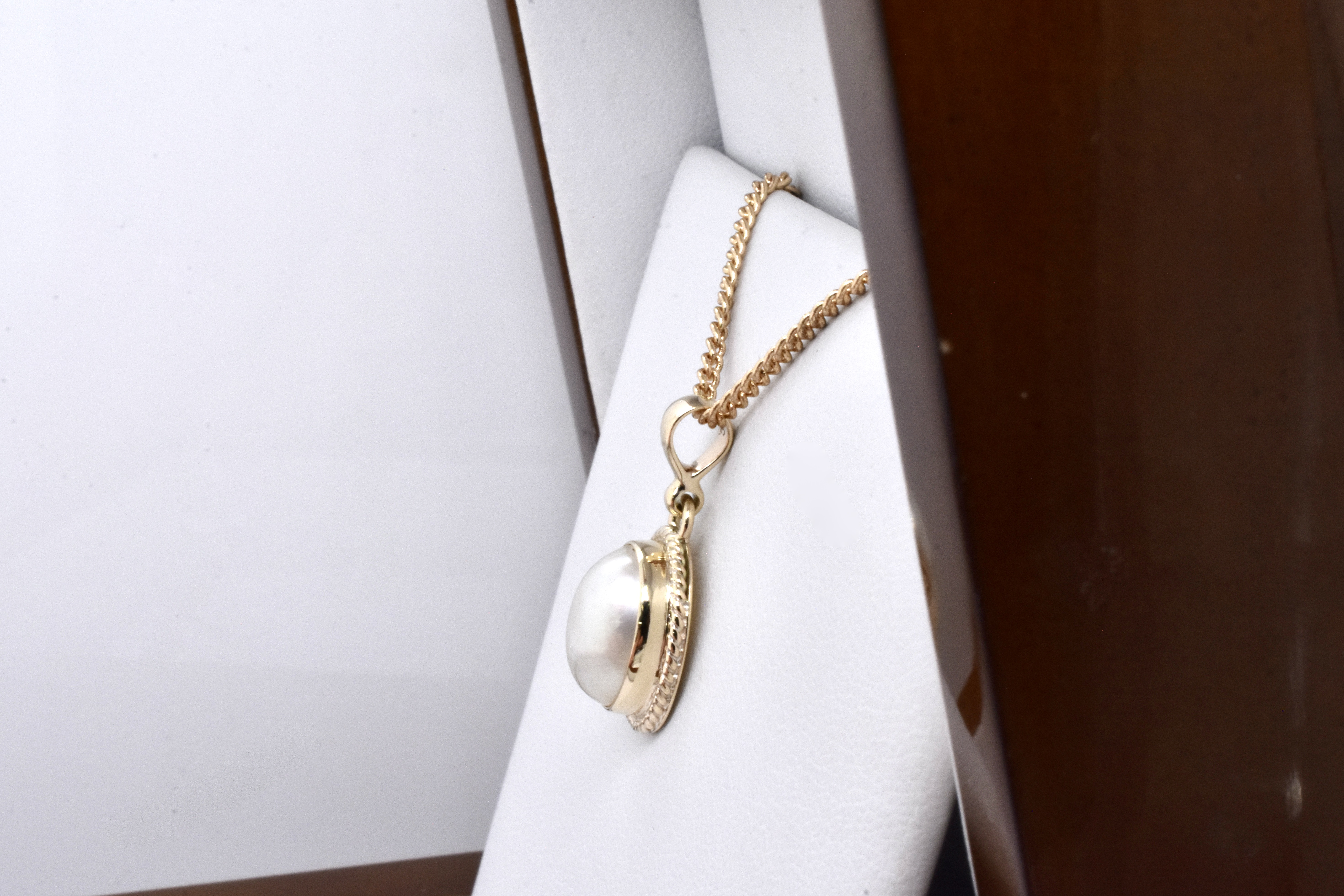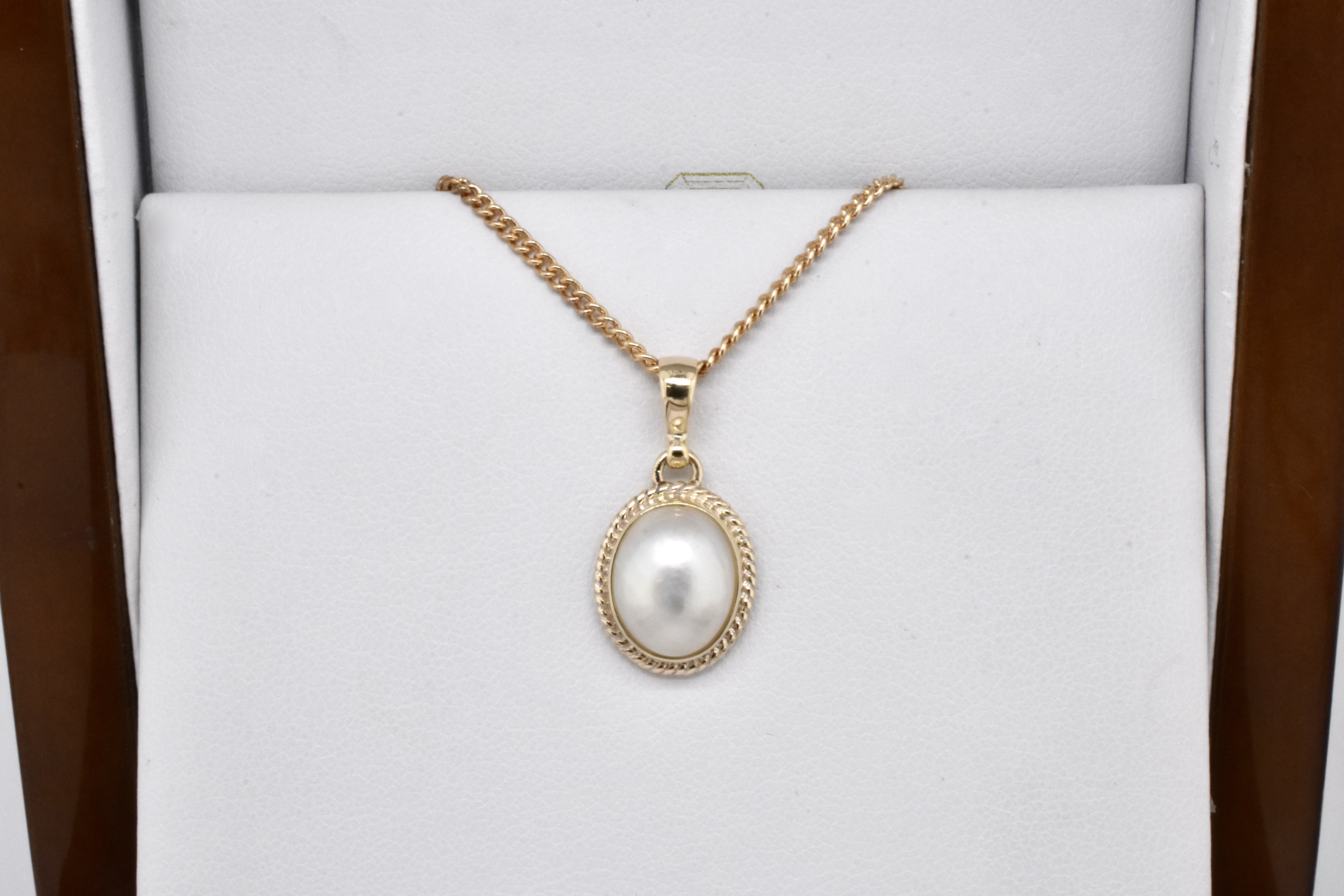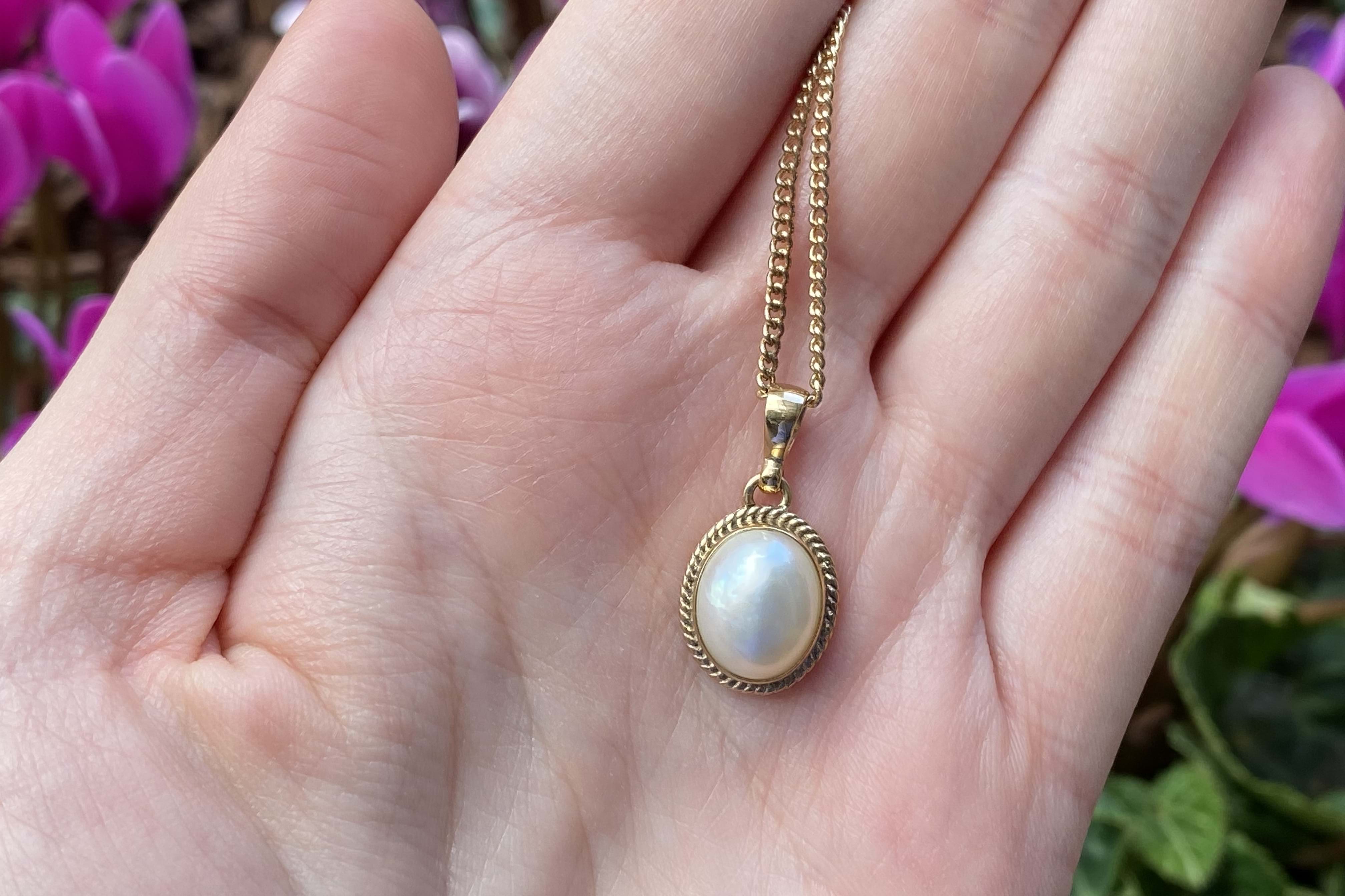 Modern and elegant, this pendant has been handmade in 9ct yellow gold and features an oval, white mabe pearl in a pretty rope style bezel with a plain tapered bail. Pendant measures approx. 12 x 9.5mm. Chains available for separate purchase