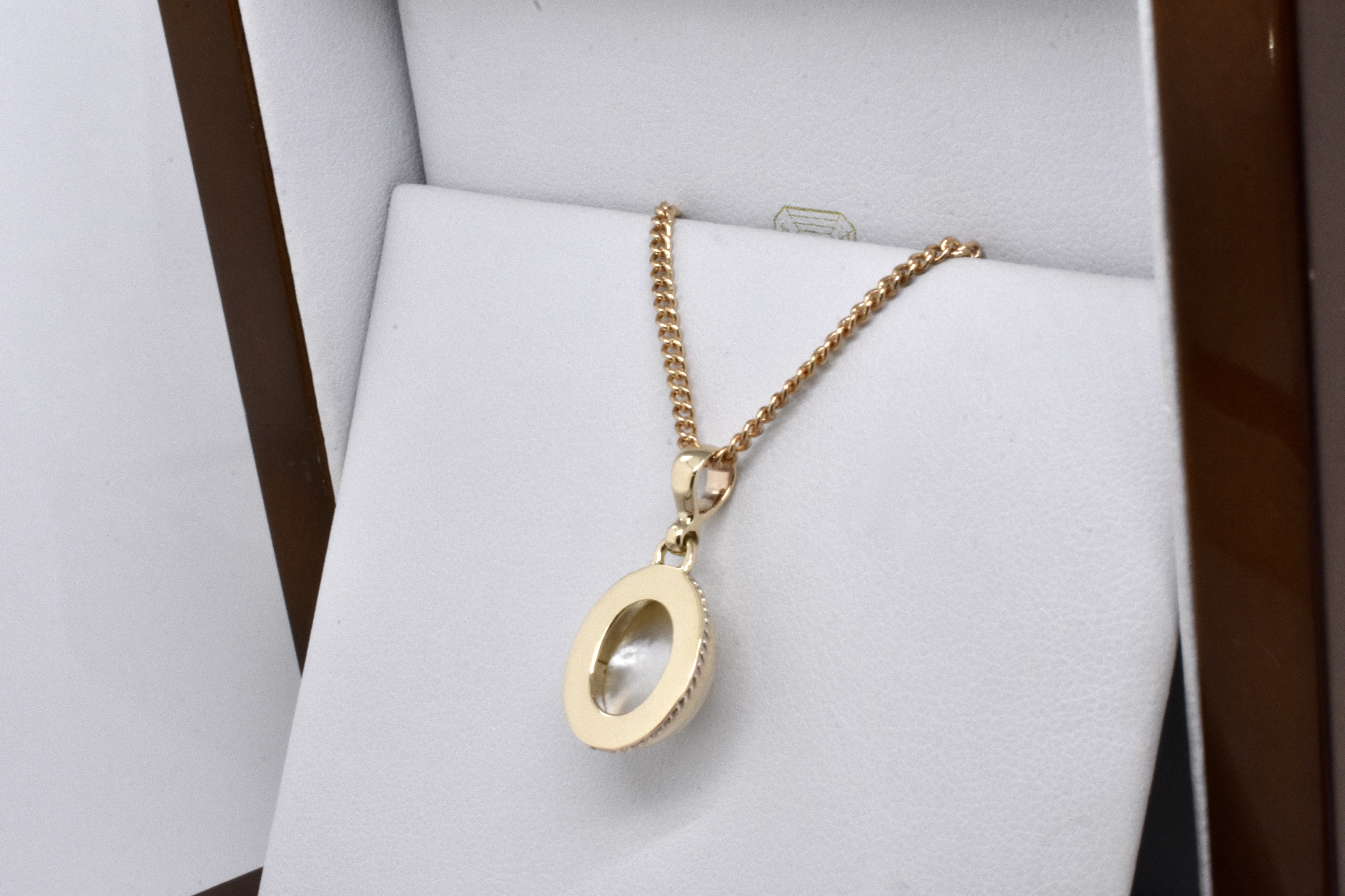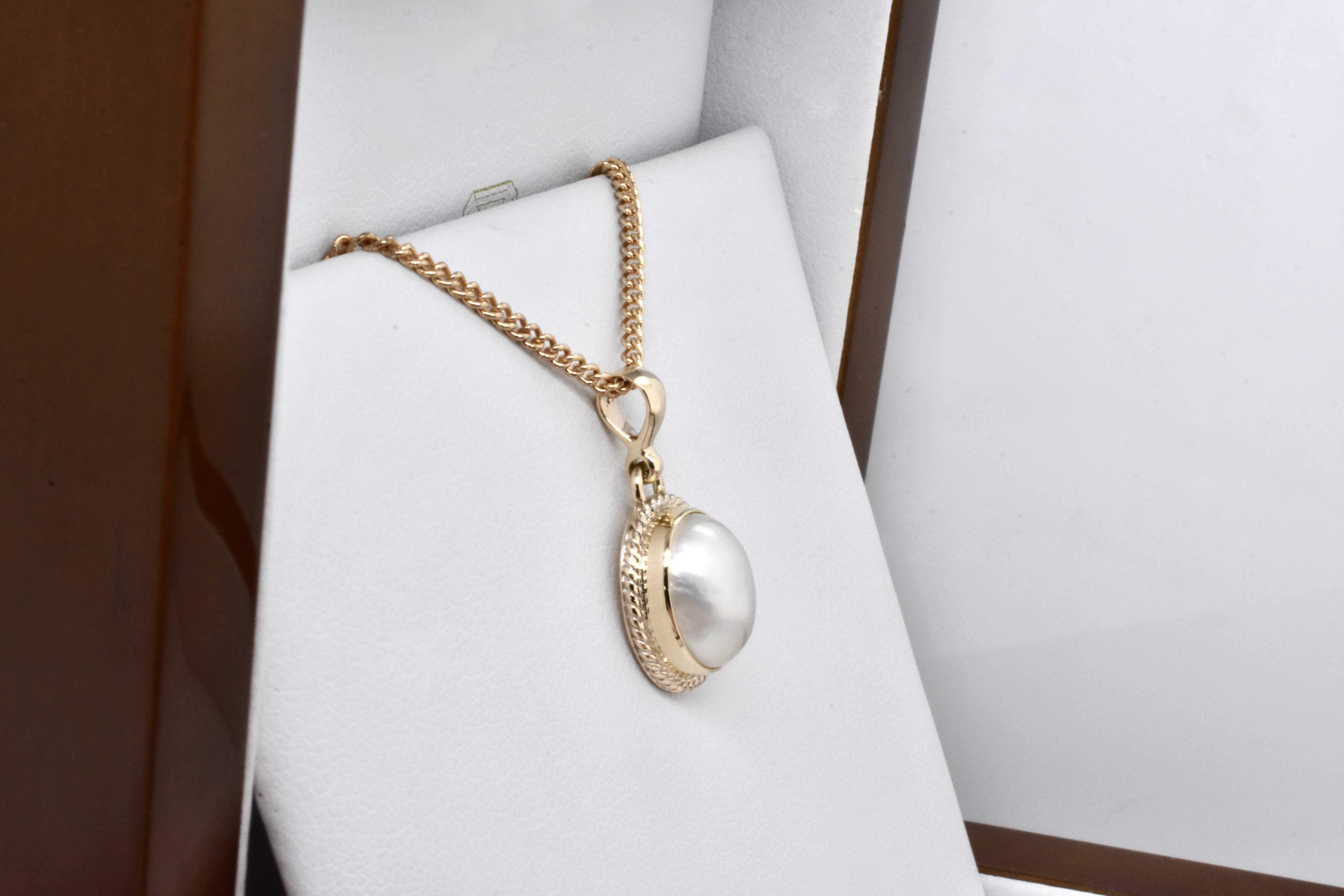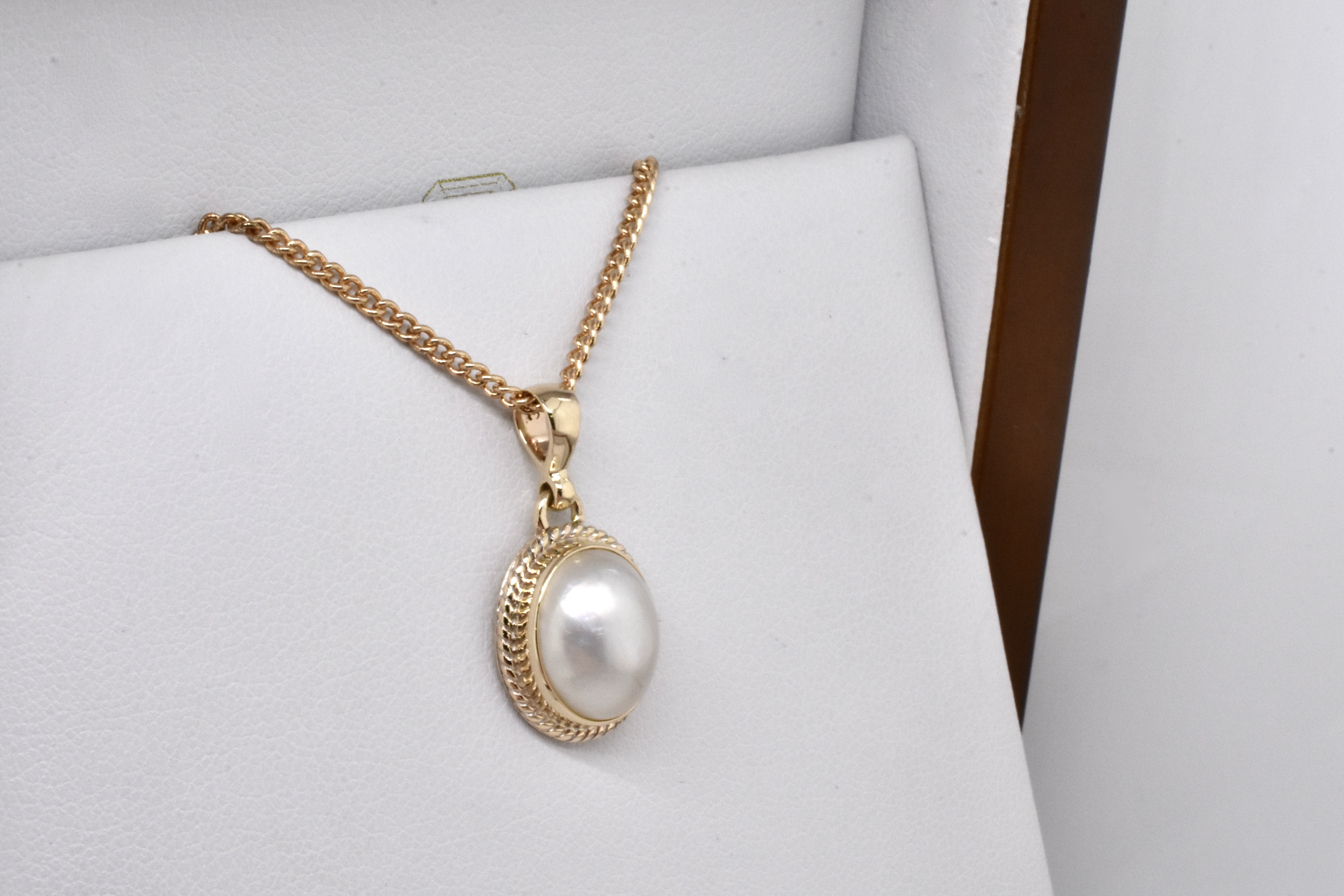 Modern and elegant, this pendant has been handmade in 9ct yellow gold and features an oval, white mabe pearl in a pretty rope style bezel with a plain tapered bail. Pendant measures approx. 12 x 9.5mm. Chains available for separate purchase
