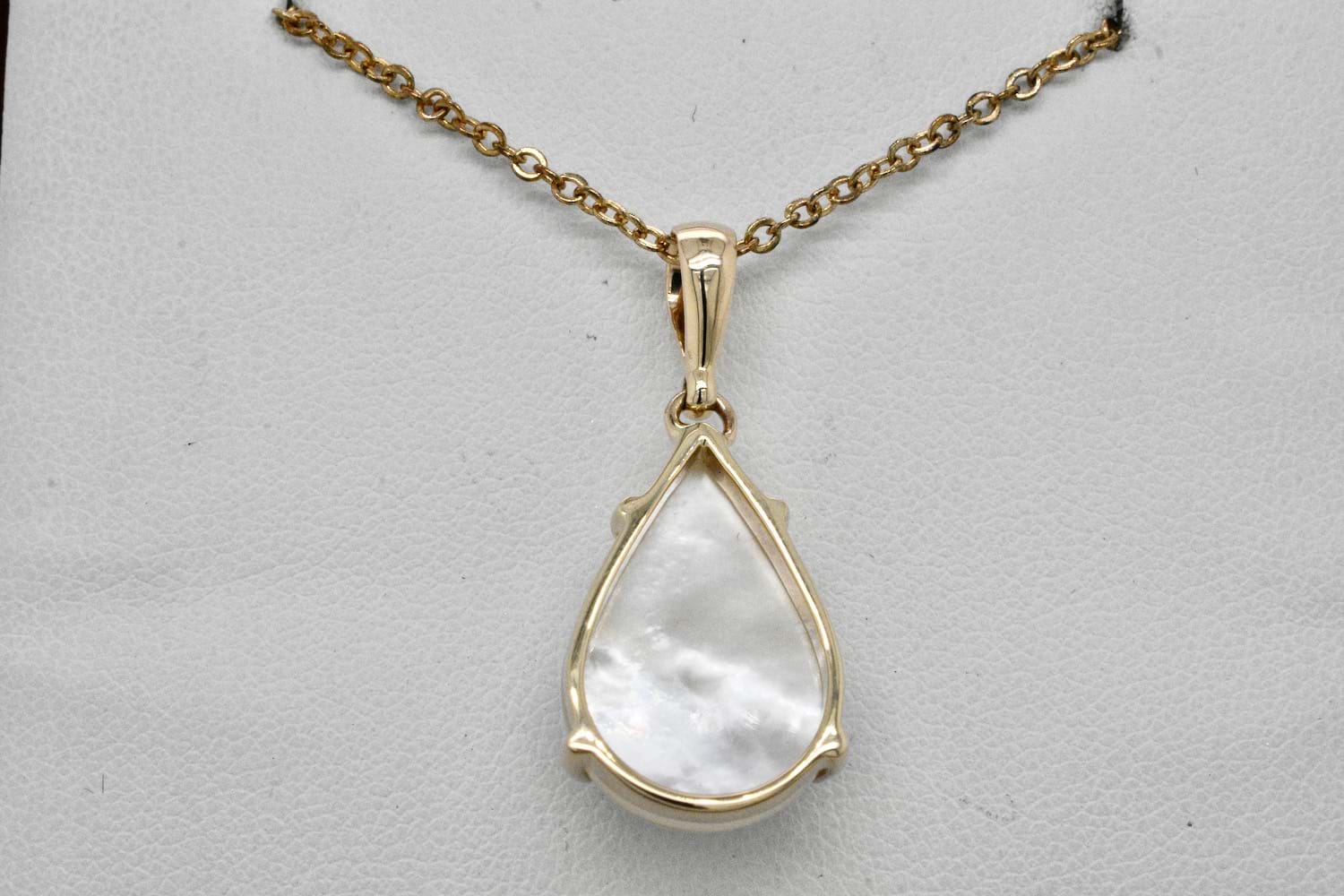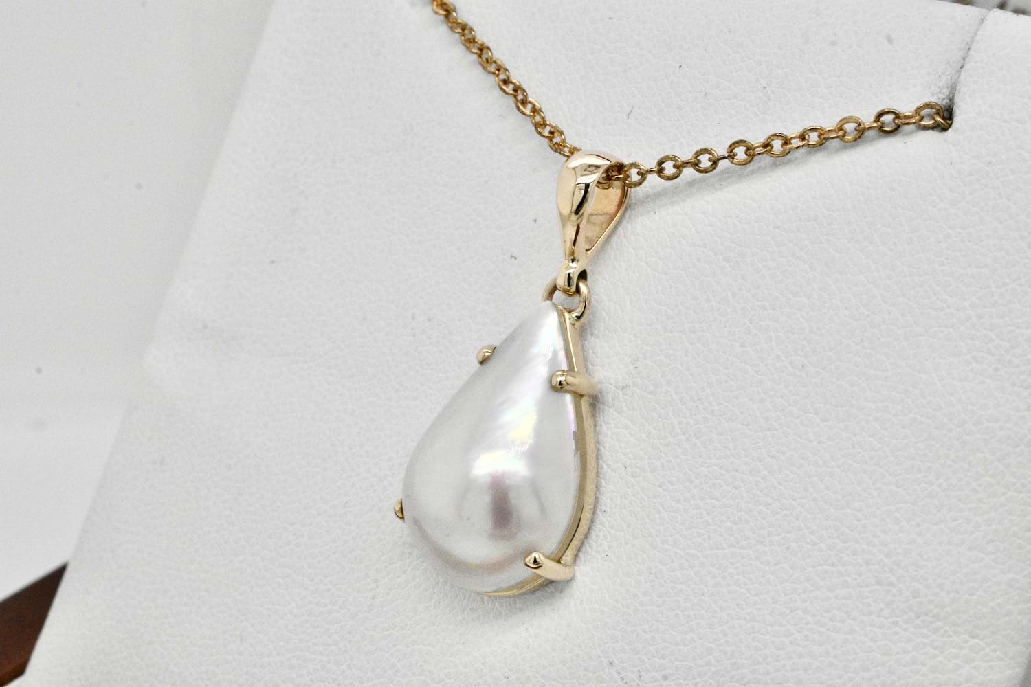 Lustrous white mabe pearl in an unusual pearshape measuring approx. 21x15mm round set into a handmade 9ct yellow gold pendant with four claws and a plain bale. Chains are available for separate purchase