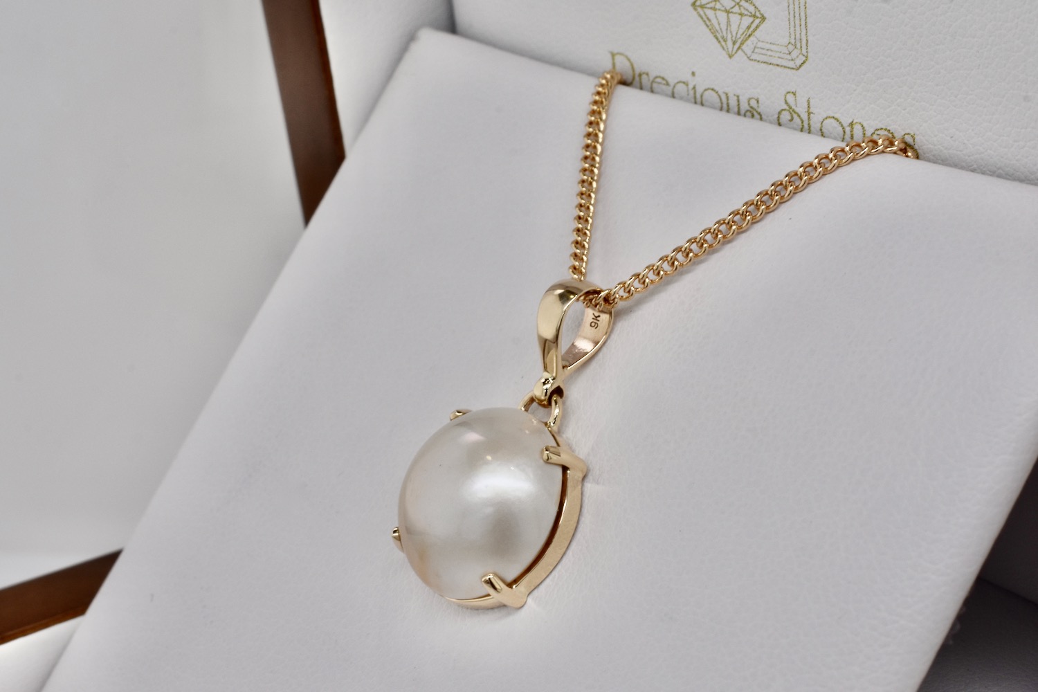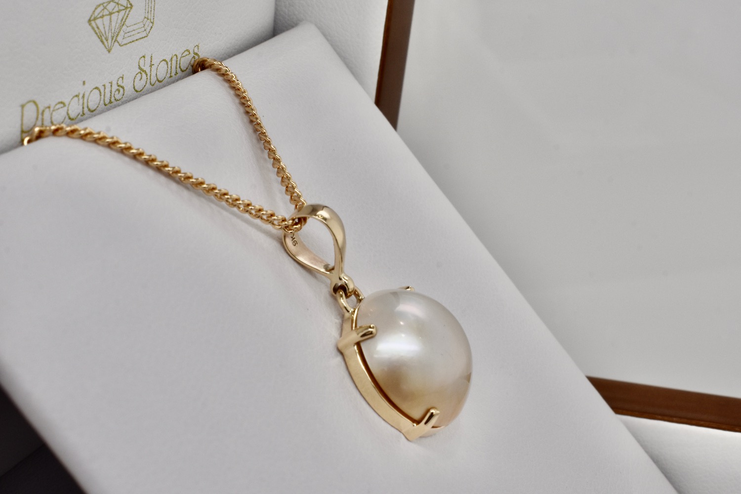 Beautiful handmade 9ct yellow gold four claw pendant featuring a lustrous white round mabe pearl measuring approx. 15.5mm. Chains are available for separate purchase