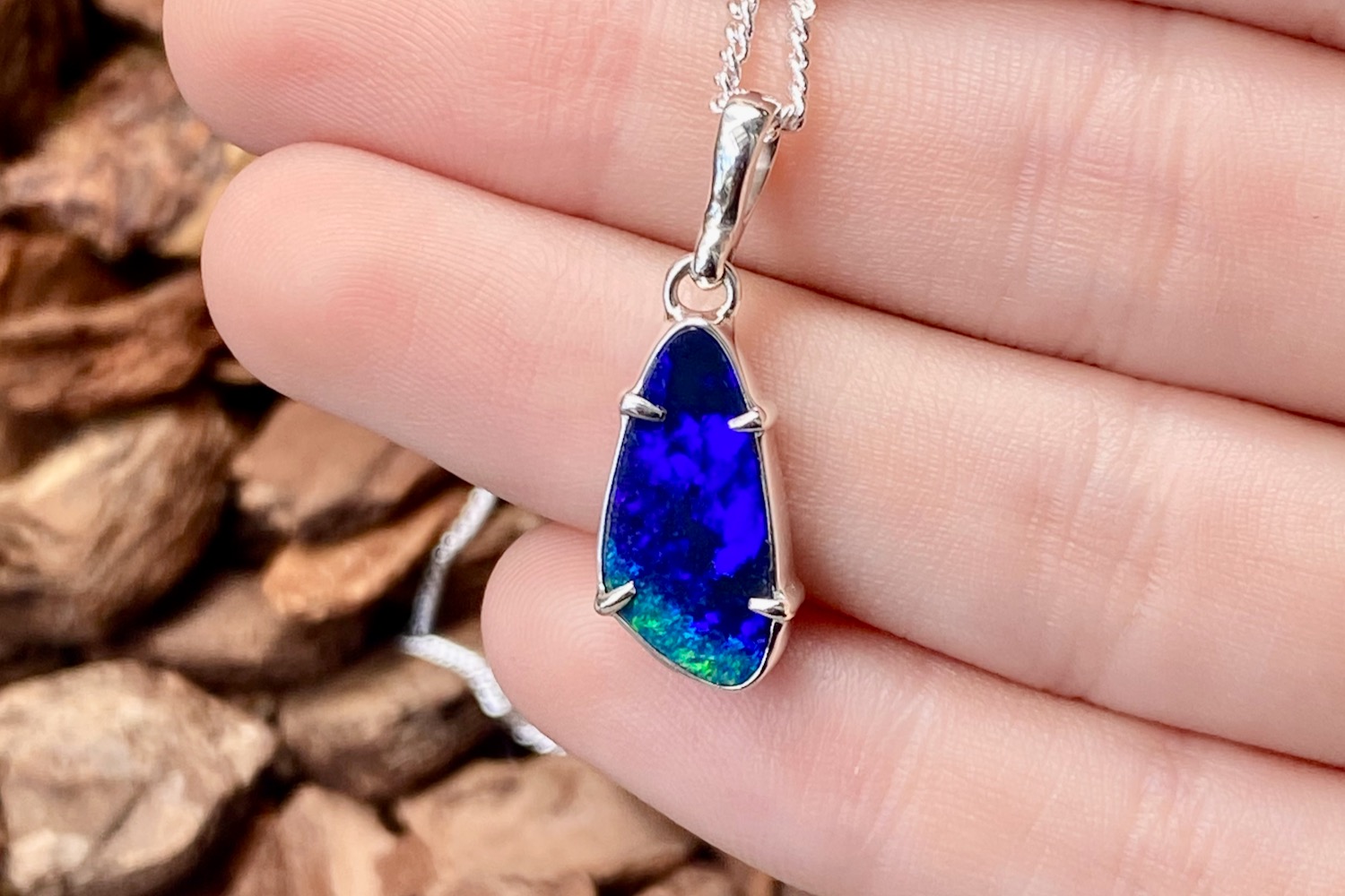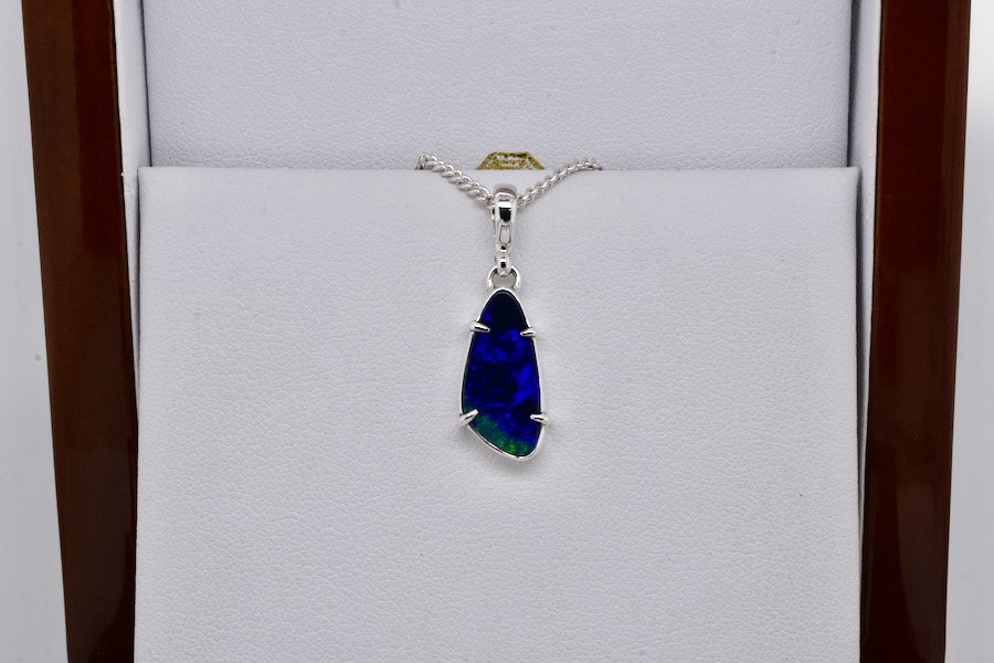 A resplendent freeform opal doublet measuring approx. 17 x 9.5mm is the feature of this pendant, dark blue with flashes of green and blue from Coober Pedy, handmade in sterling silver with four fine claws and a plain bail. Chains available for separate purchase