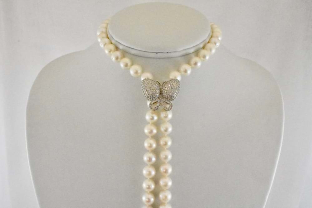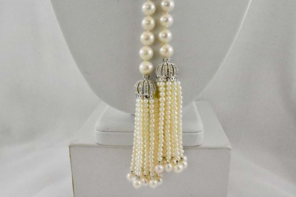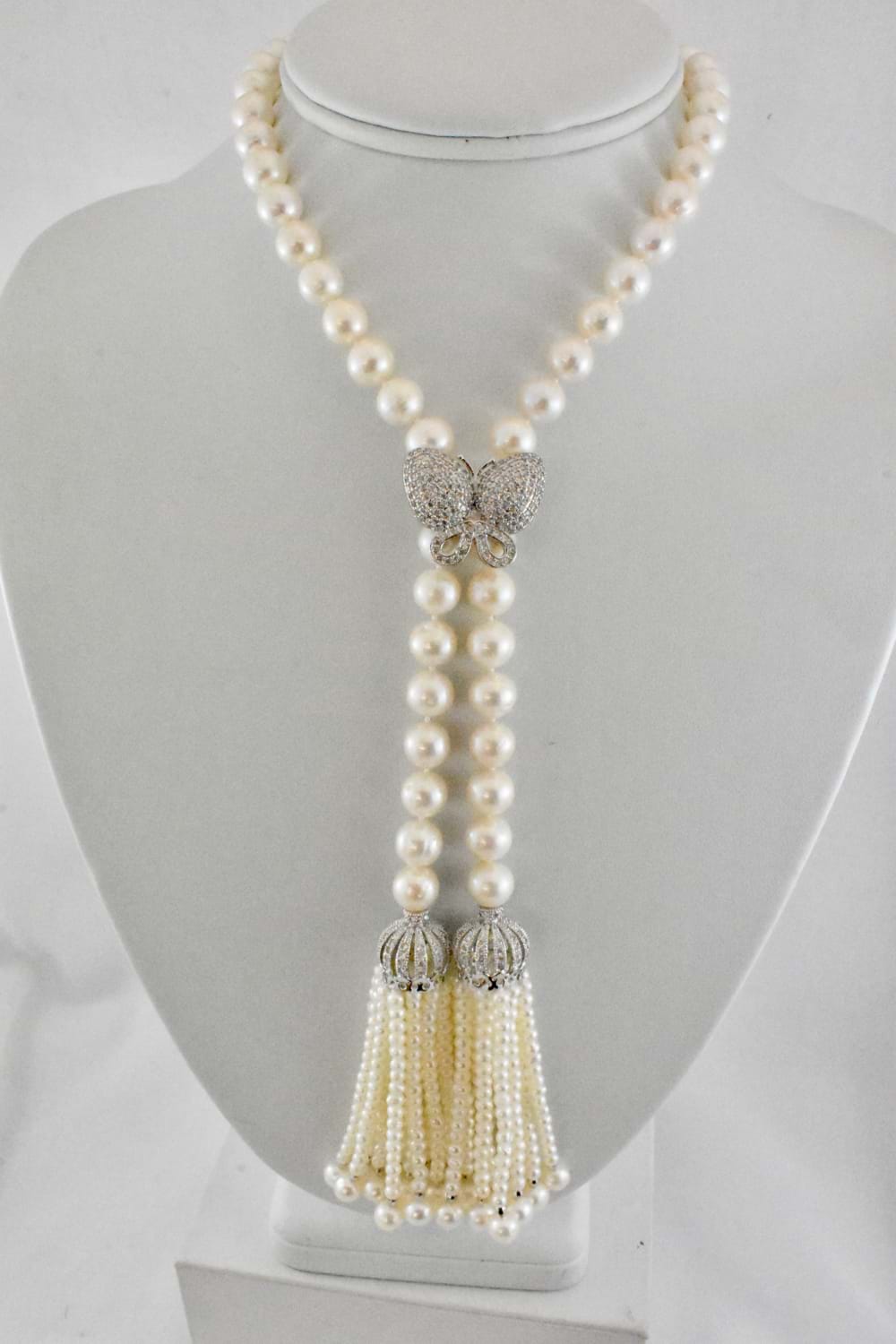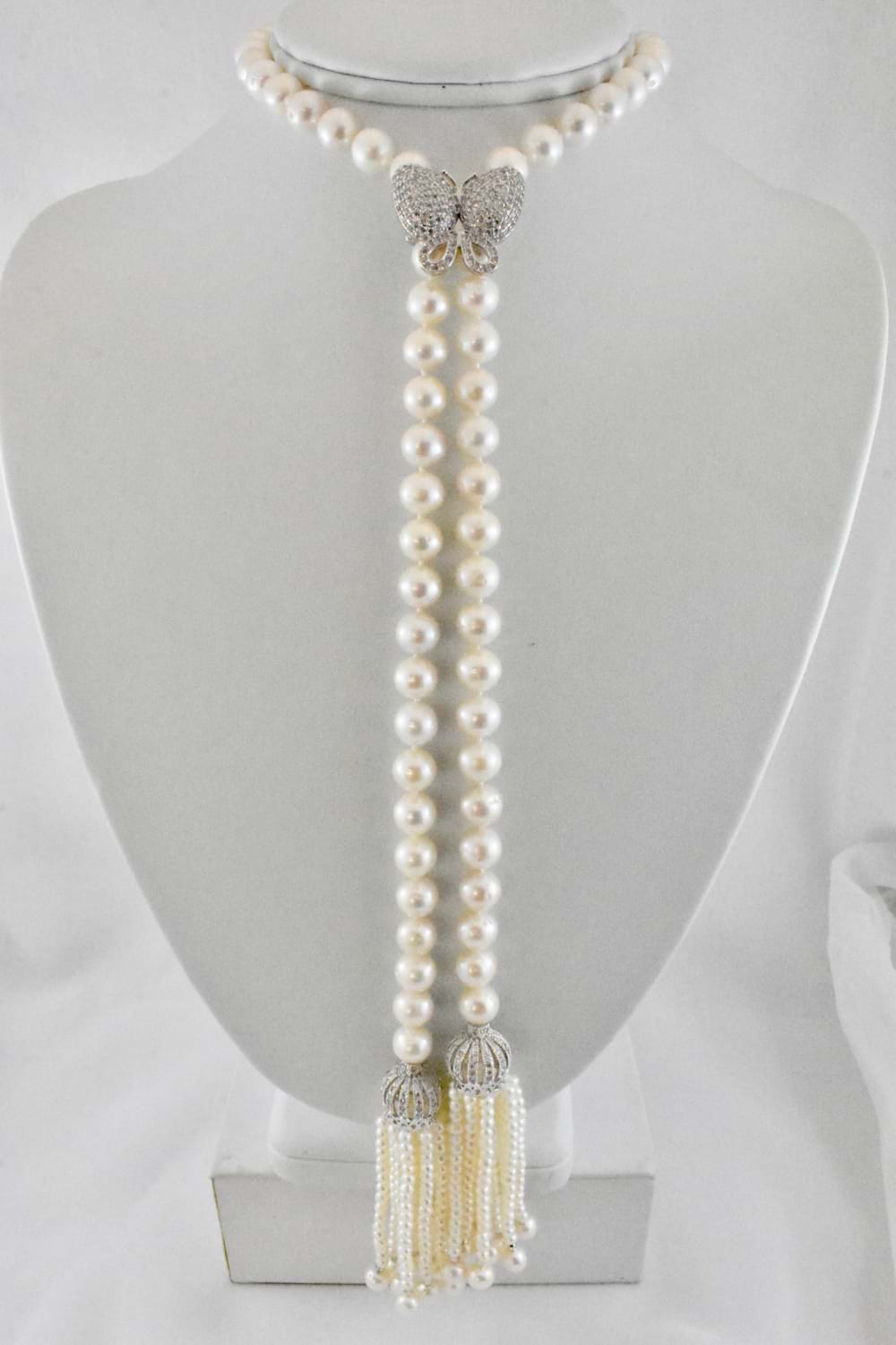 This amazing 92cm necklet is strung using 8.5mm - 9mm freshwater pearls and at each end of this lariet style necklet is a stainless steel cap studded with cubic zirconias and a tassel of 3.5mm freshwater pearl and 6.5mm freshwater pearls. Clipping the lariet togther is a removalable c.z studded stainless steel butterfly feature.