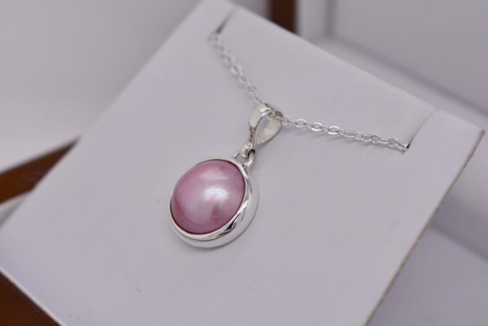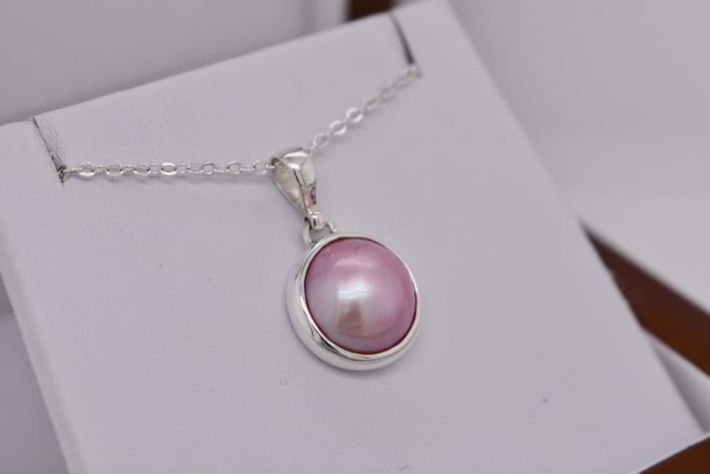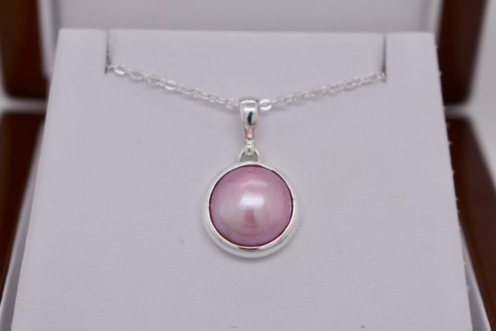 Sterling silver pendant bezel set with a 15mm pink Mabe pearl. Chains are available for separate purchase