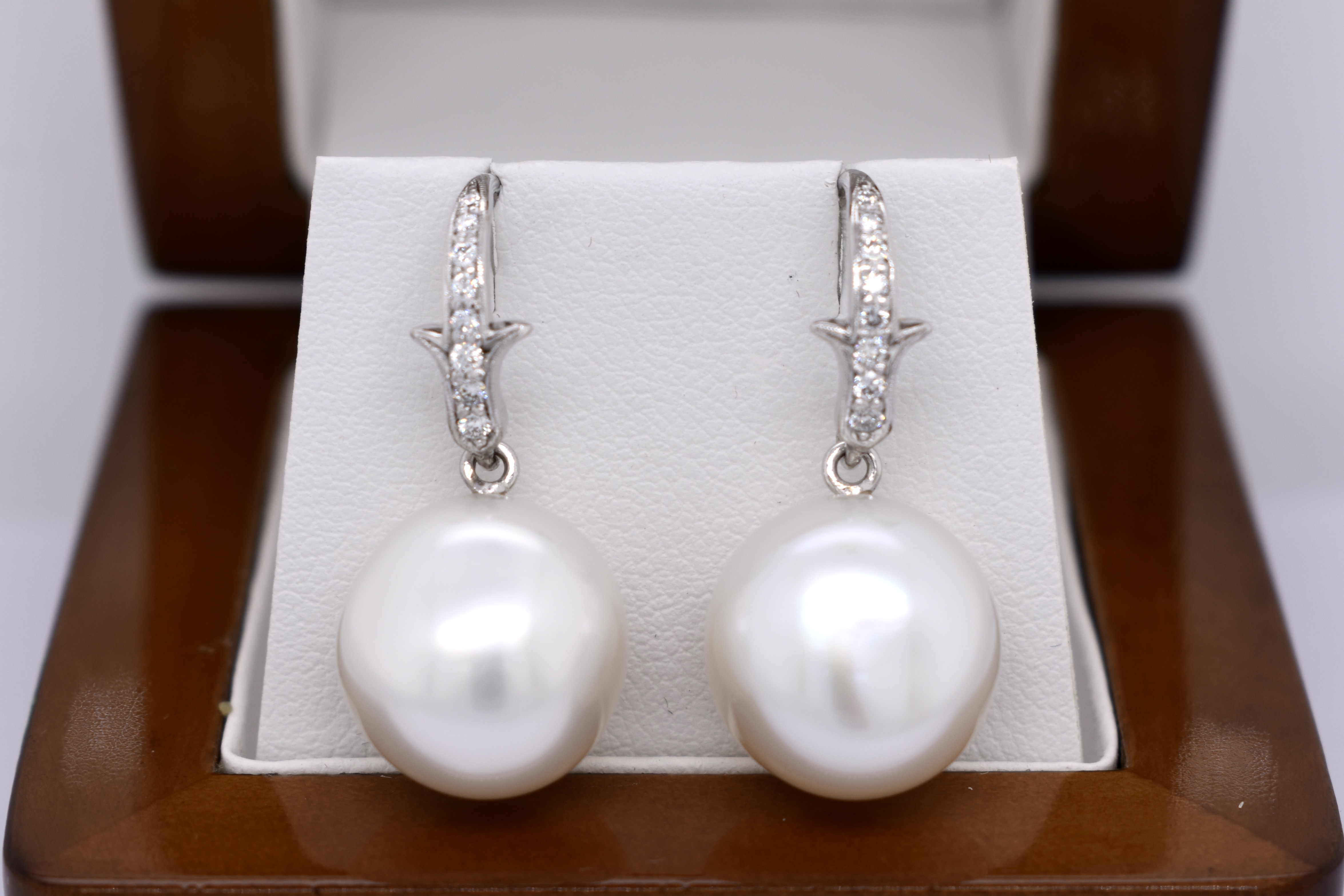 SOLD 18ct White Gold 11-11.5mm White South Sea Pearl & Diamond Earrings