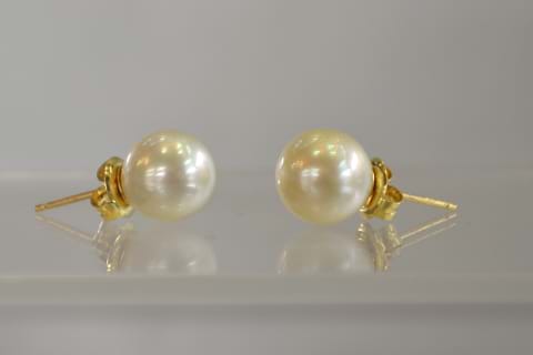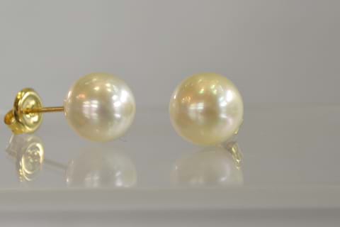 These button, champagne hue, south sea pearls measure 10.5-11mm and are set on 18ct yellow gold post & butterfly fittings