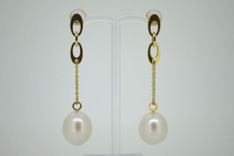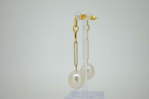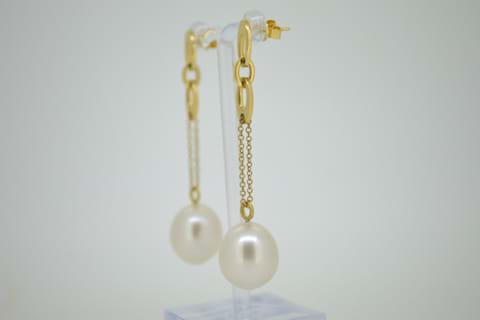 A beautifully matched pair of white, oval, 13-13.5mm Australian south sea pearls suspended from a length of 18ct yellow gold cable chain with fancy oval link features at the top. Independent Valuation Supplied