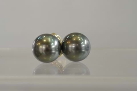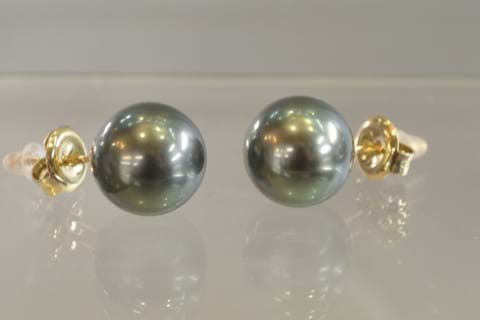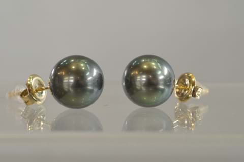A pair of lustrous, round, 11.5-12mm Tahitian pearls set onto 9ct yellow gold post and butterfly fittings