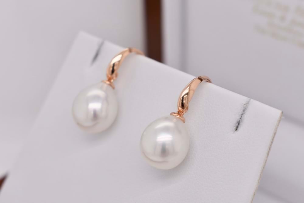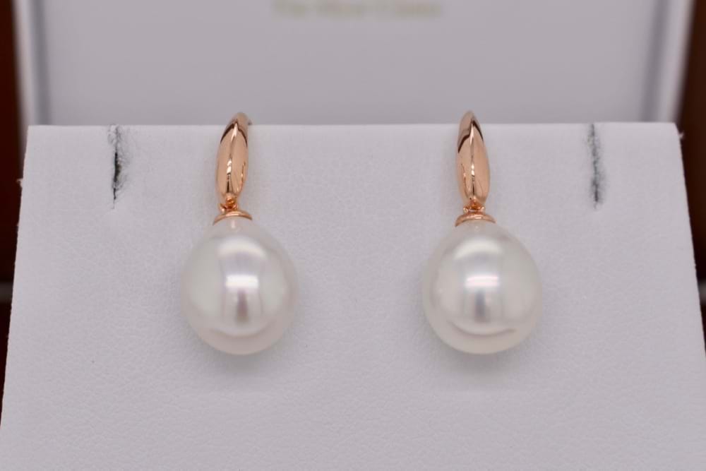 14ct rose gold drop earrings set with 10.5-11mm white South Sea Pearls. Independent valuation supplied