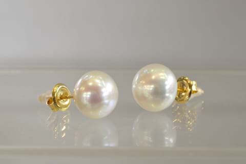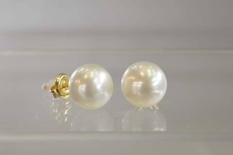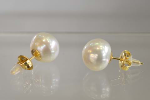A pair of highly lustrous, button shape, 12-12.5mm white South Sea Pearls set onto 18ct yellow gold post and butterfly fittings