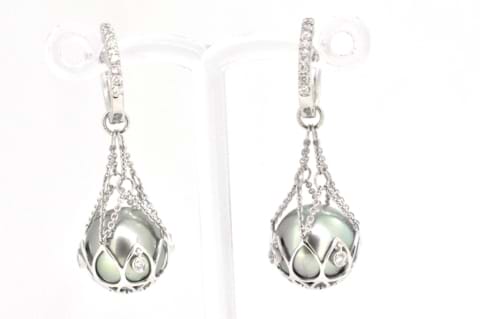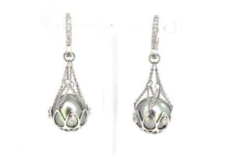 Elegant and striking these lustrous Tahitian pearls are suspended in an 18ct white gold netting that is supporting a decorative wire basket with a shimmering diamond set alternately around it. These earring enhancers are designed to be suspended from diamond huggies, which are available in different sizes and styles for separate purchase. Pearls measure 10.9mm. Independent Valuation Supplied