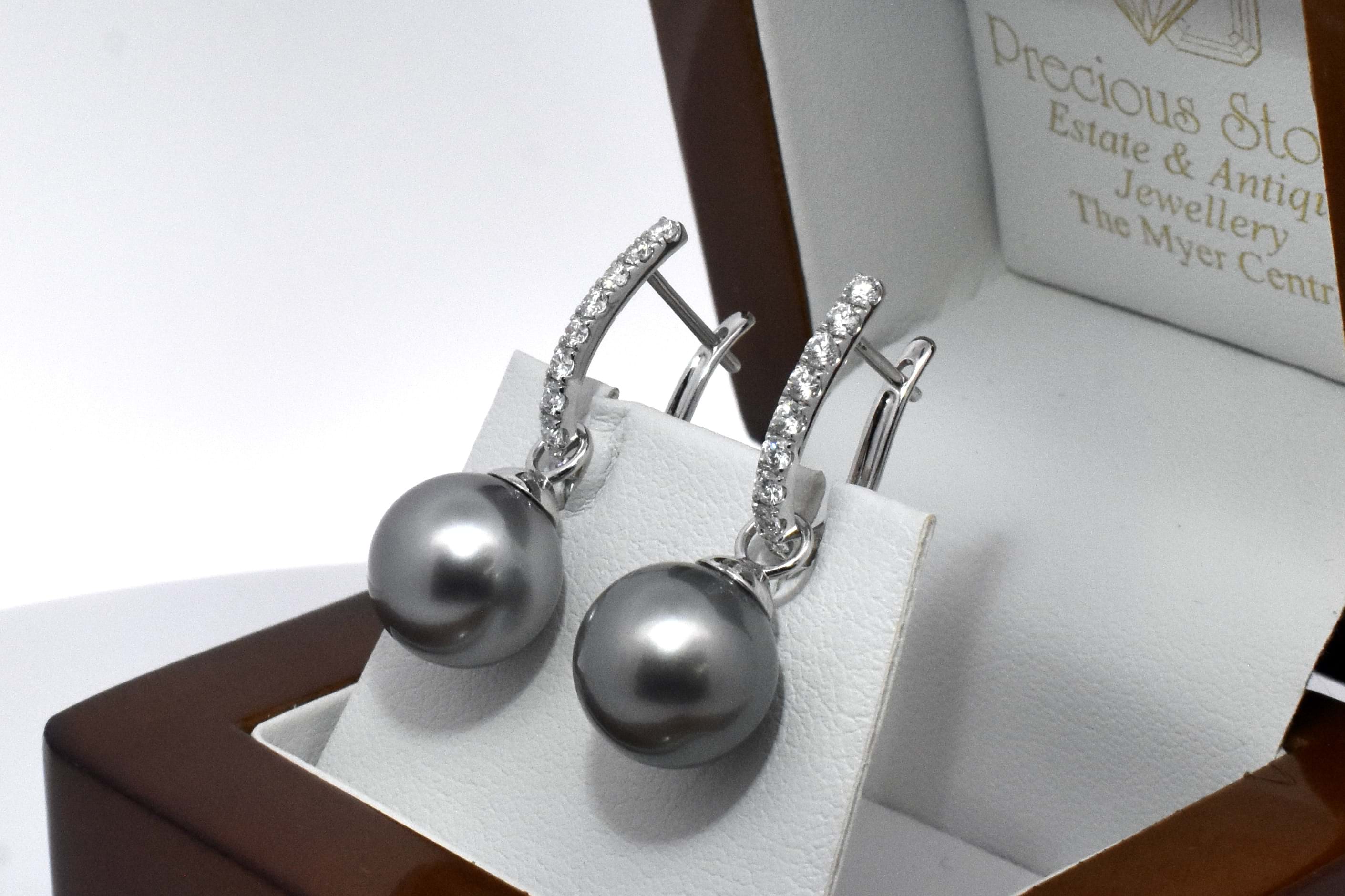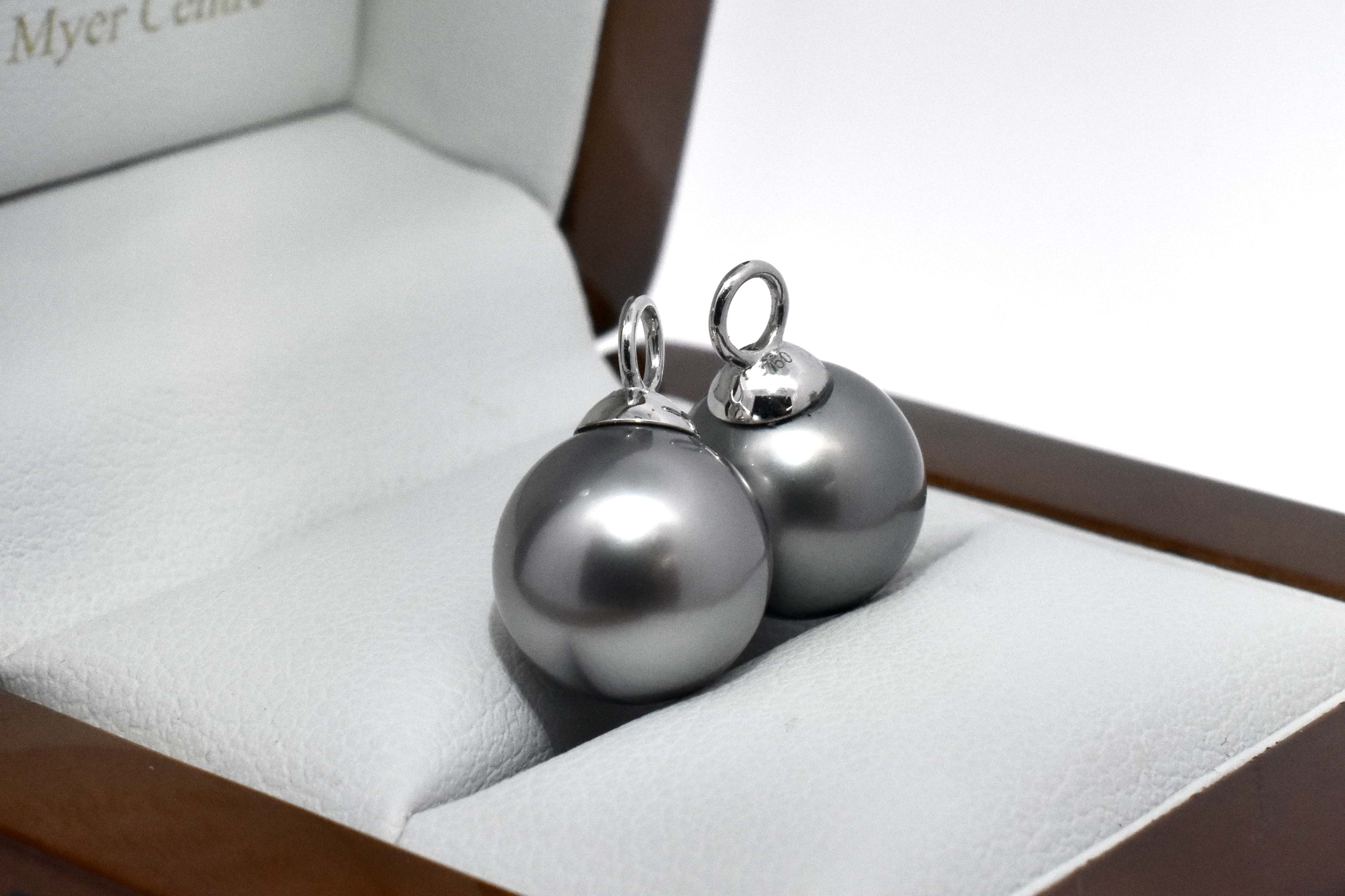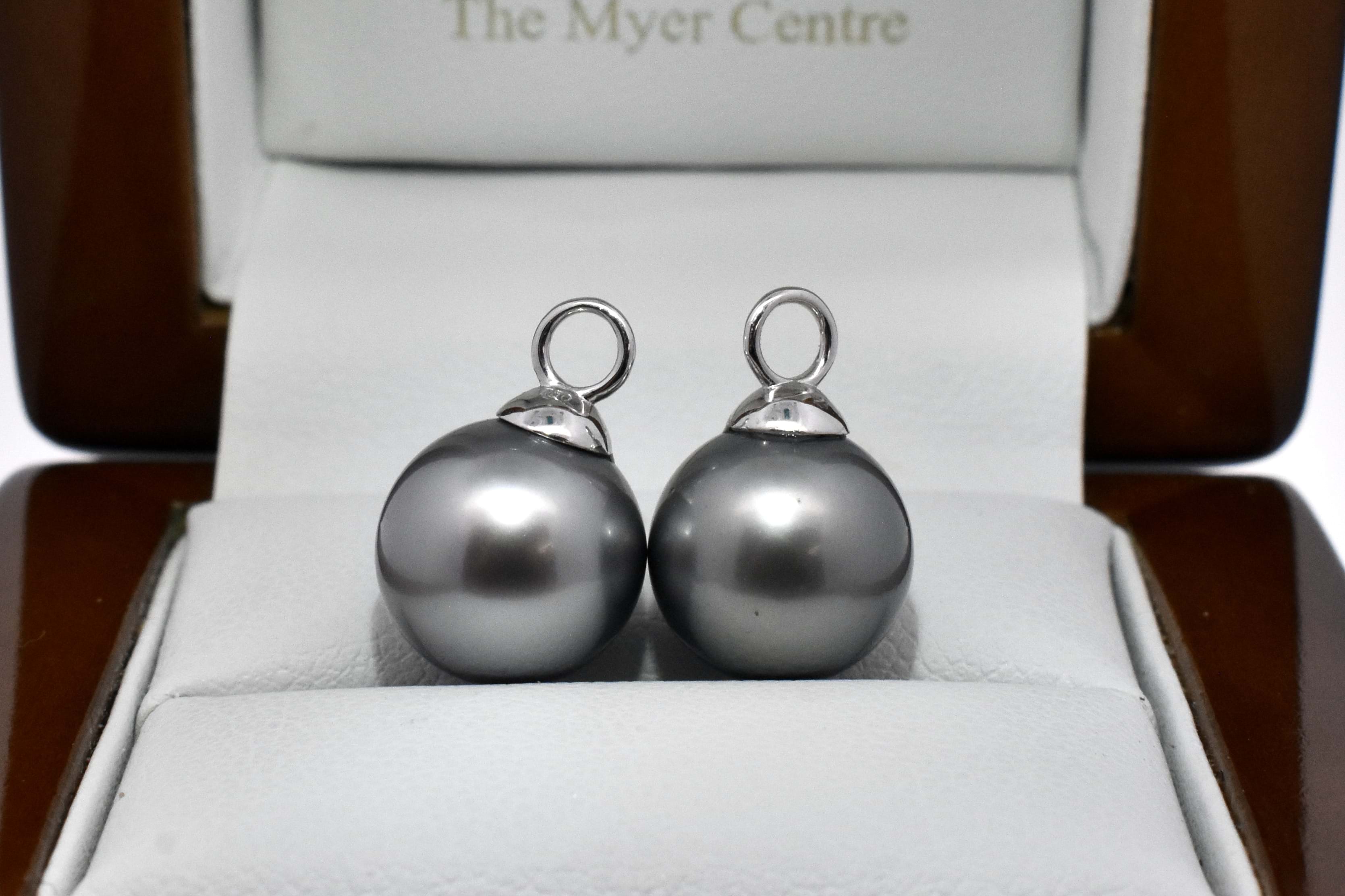 A versatile and elegant pair of near round 10.5-11mm south sea pearls, with 18ct white gold cap and ring fittings perfect to suspend from diamond huggies