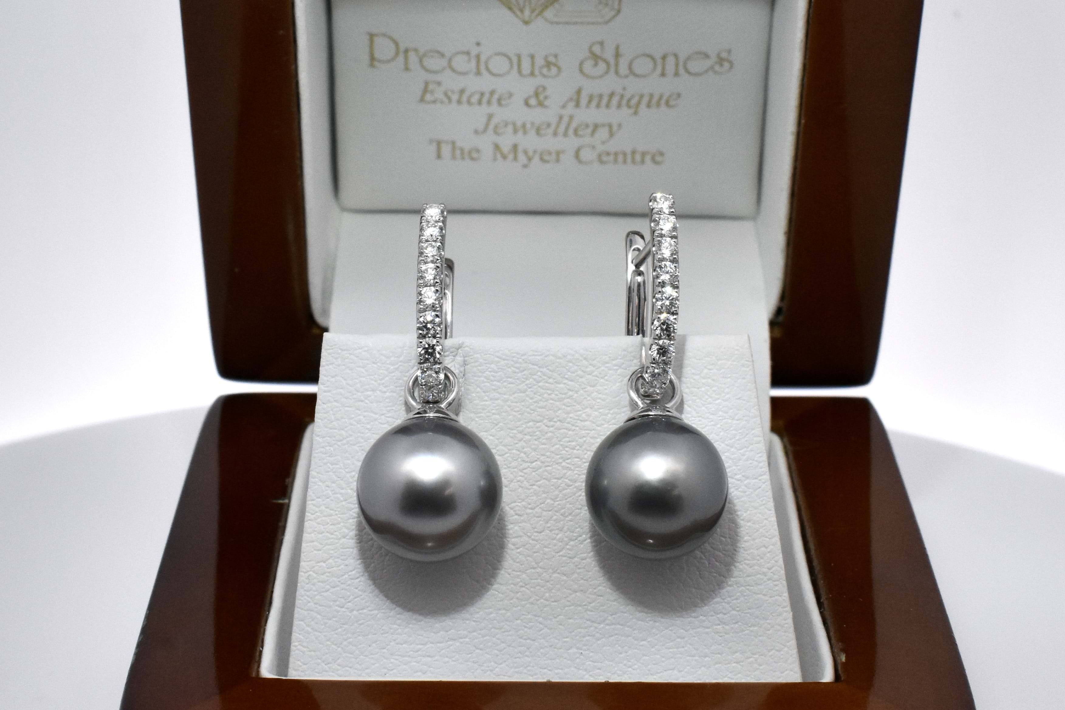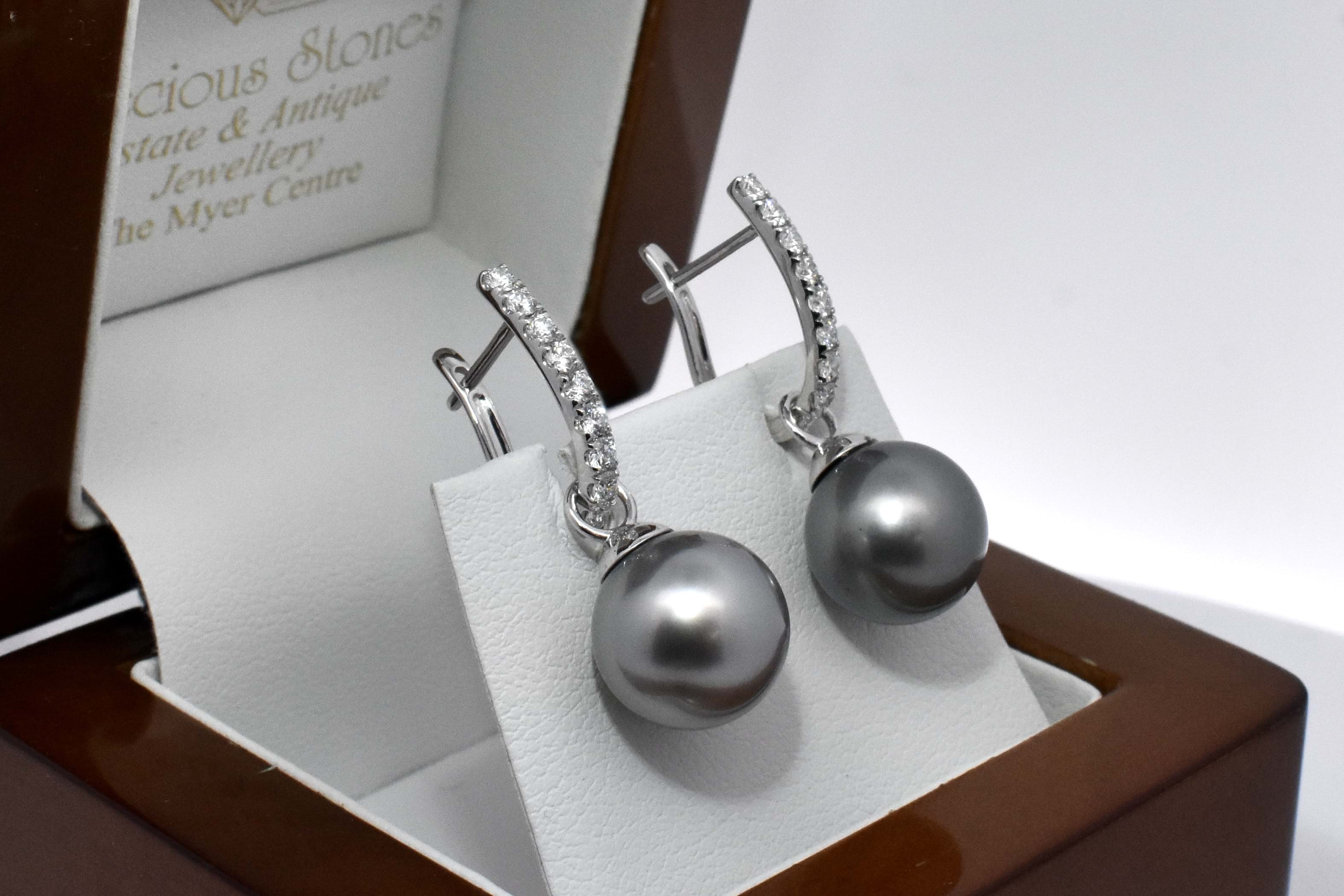 Pearls independently graded as: mid grey black hue, high lustre, very lightly blemished skin. Signature diamond huggies are available for separate purchase