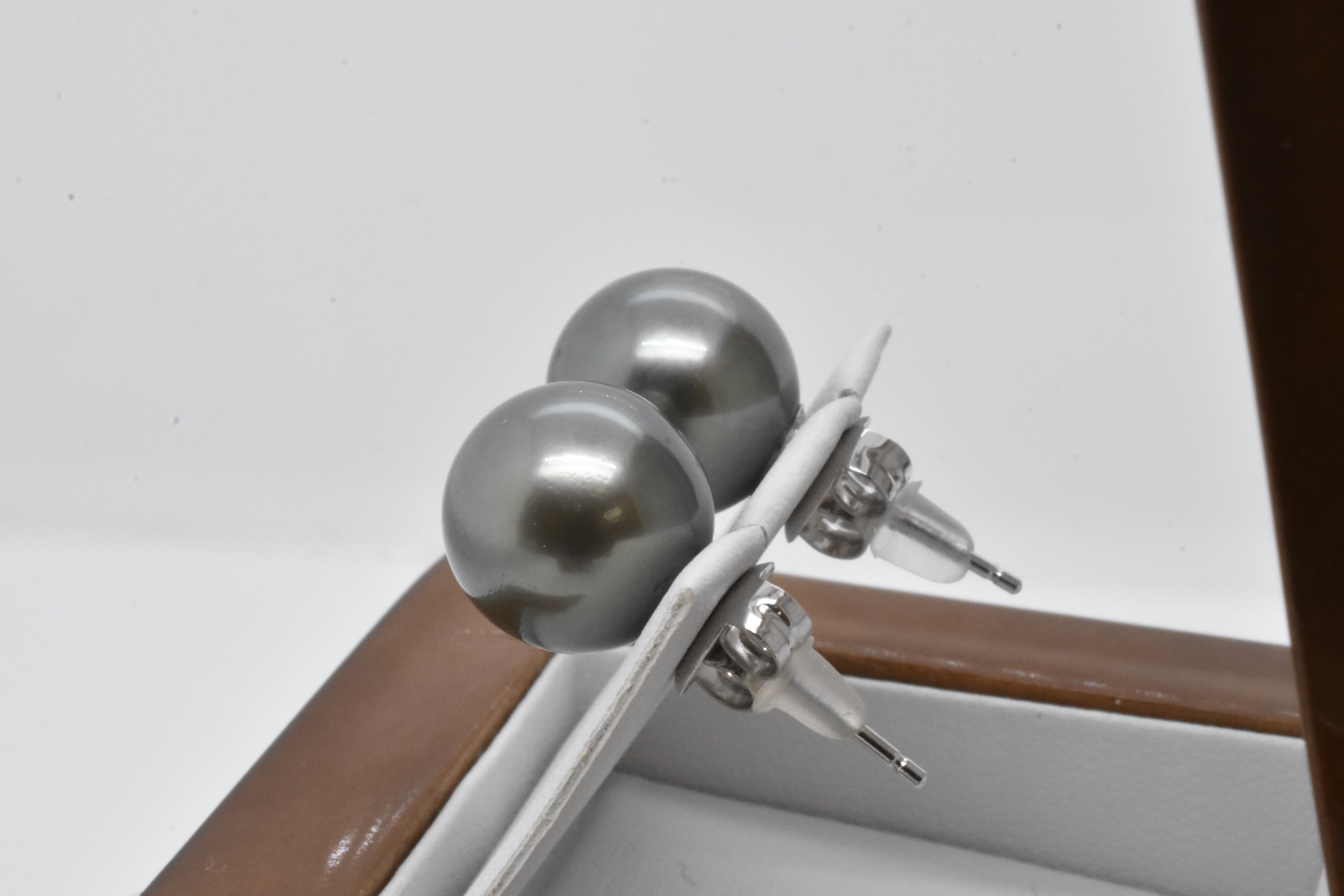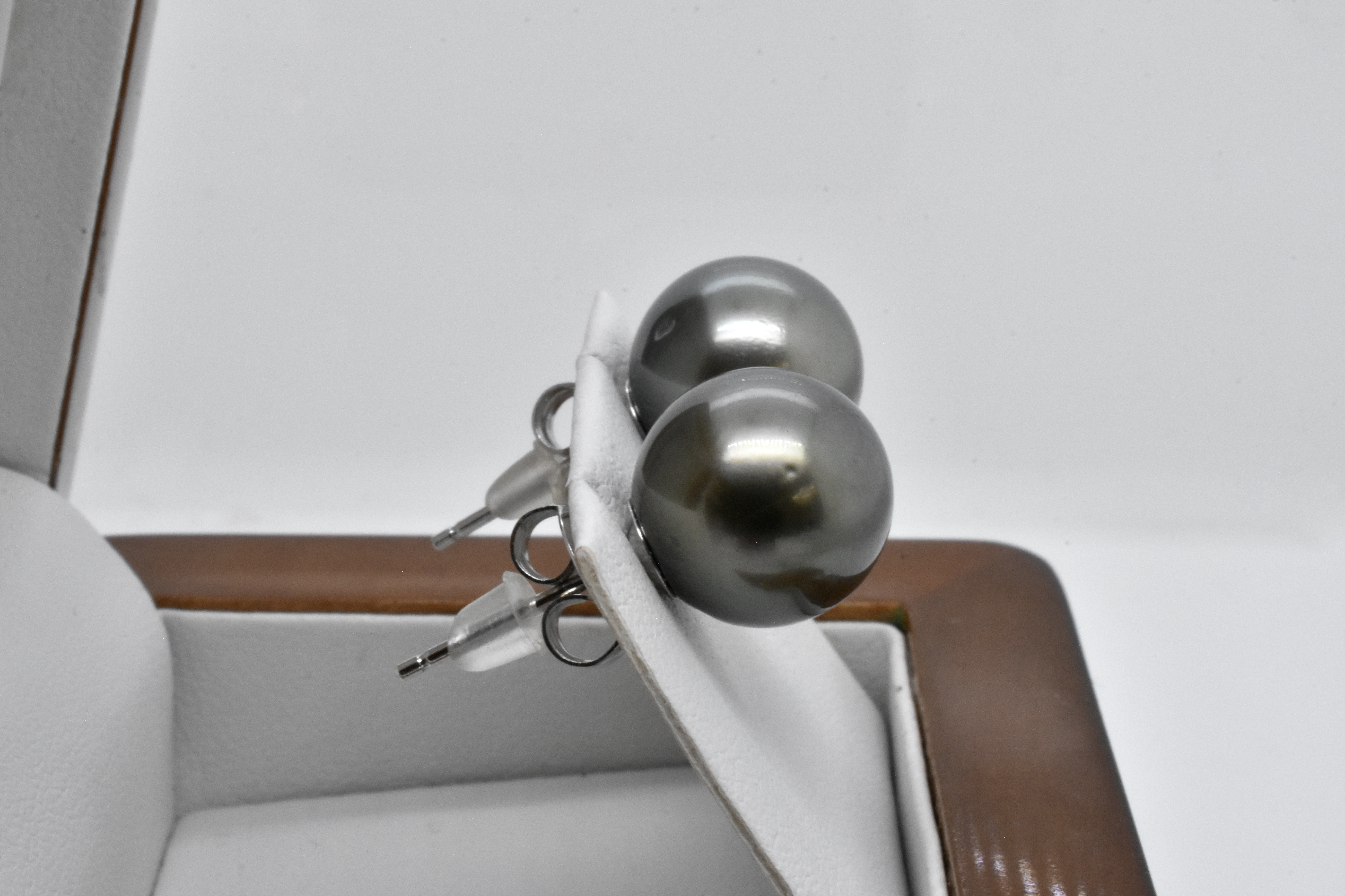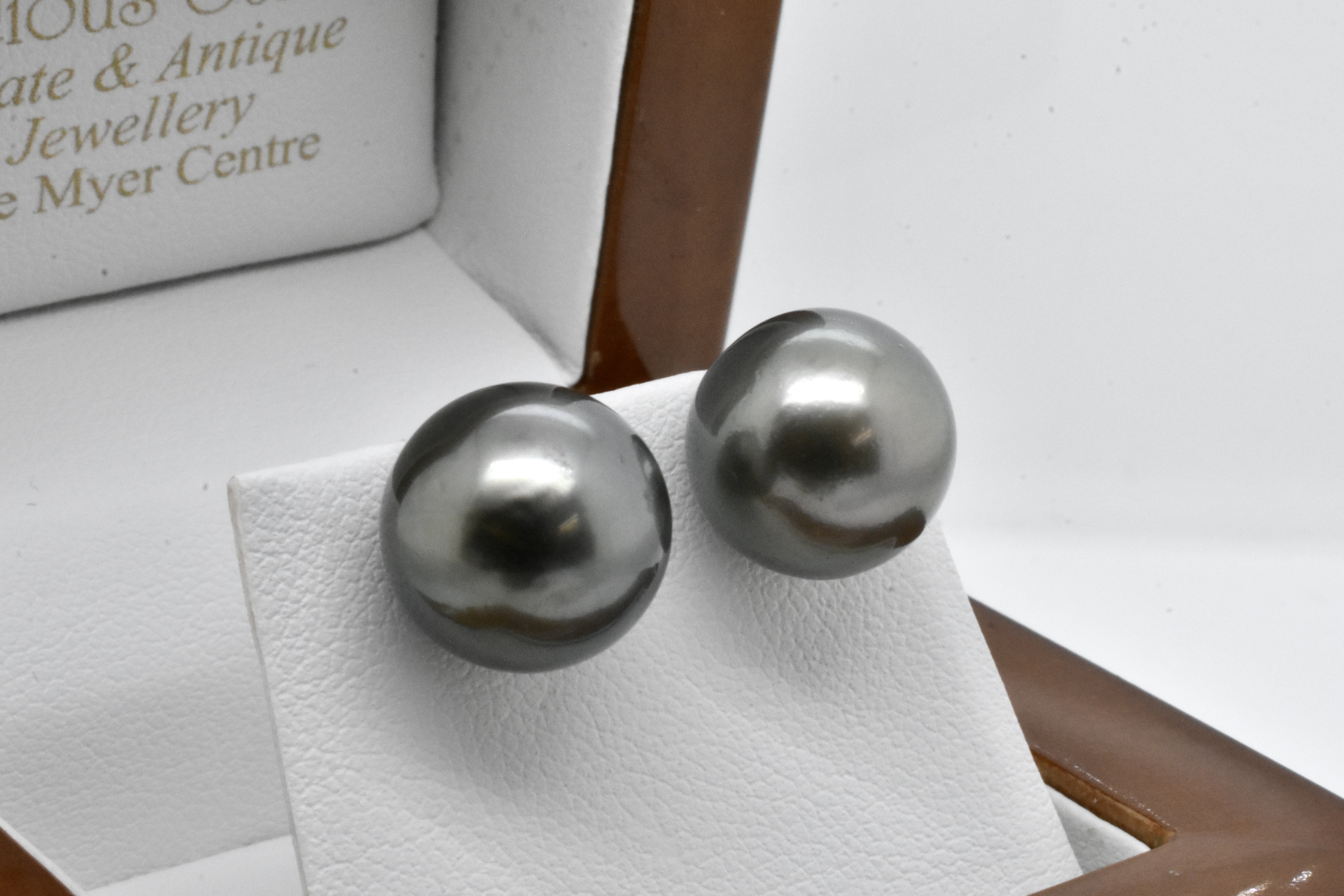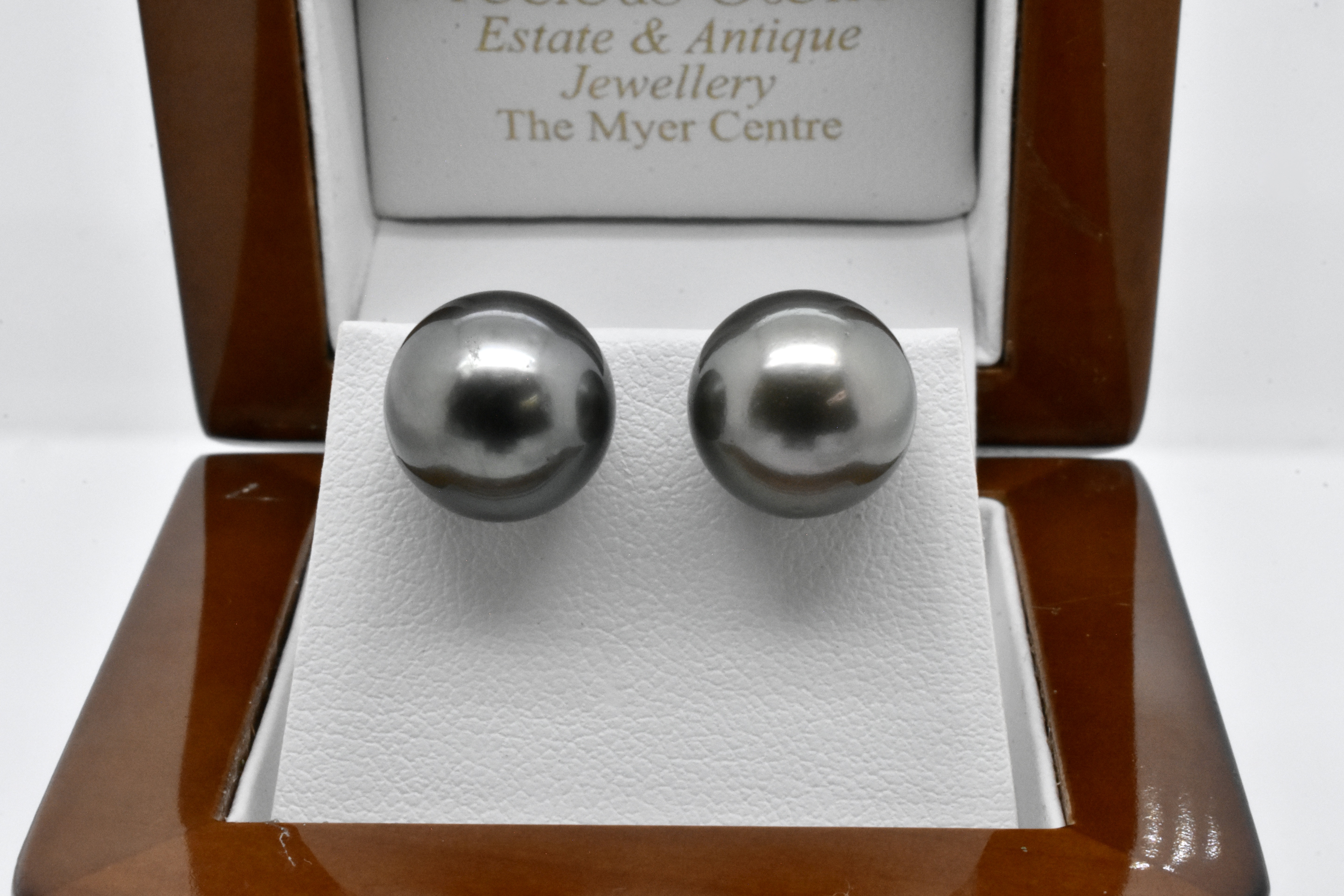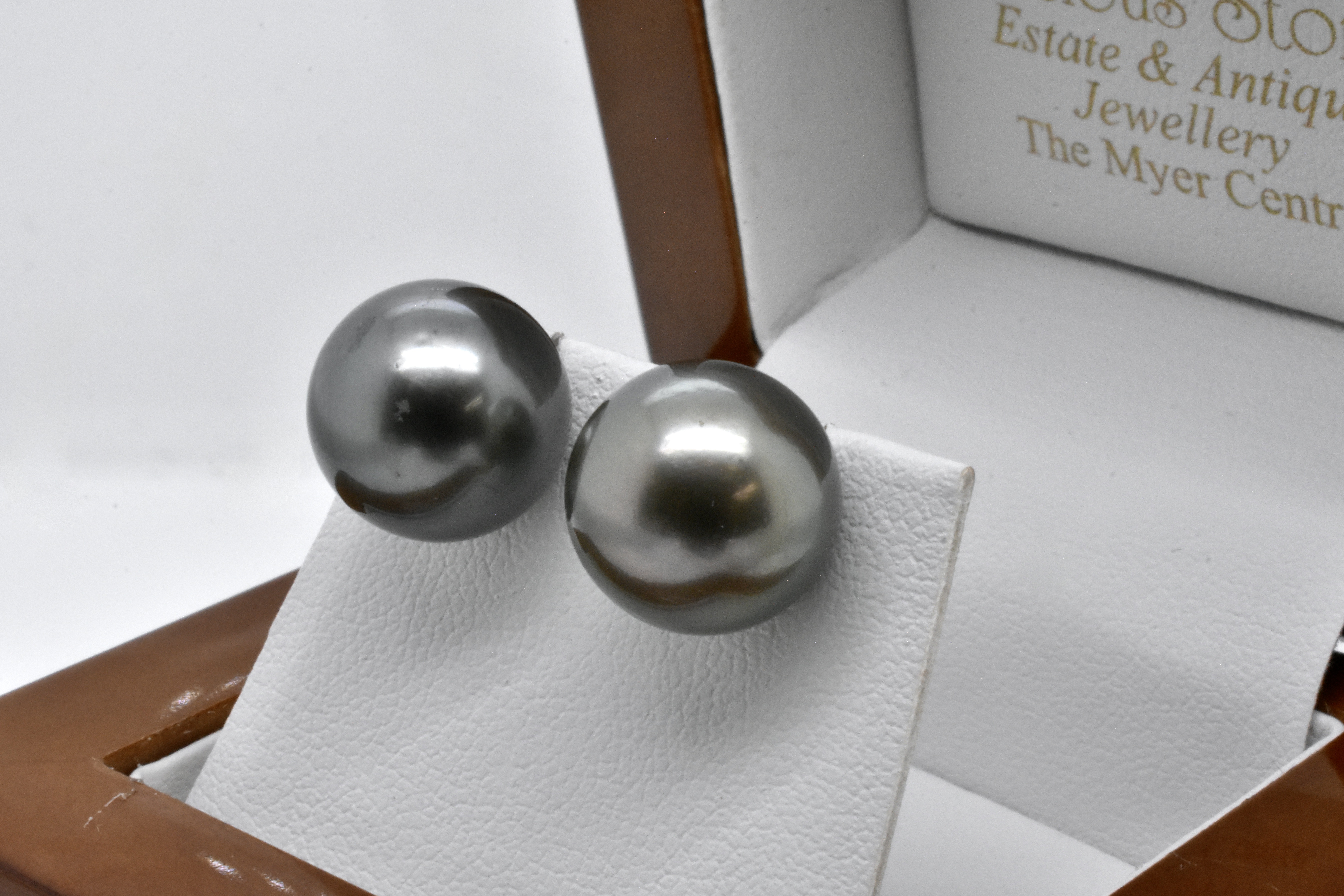 A gorgeous, sizeable pair of Tahitian pearls measuring 11.5-12mm round, with a dark grey hue and good lustre in 18ct white gold studs with post and butterfly fittings