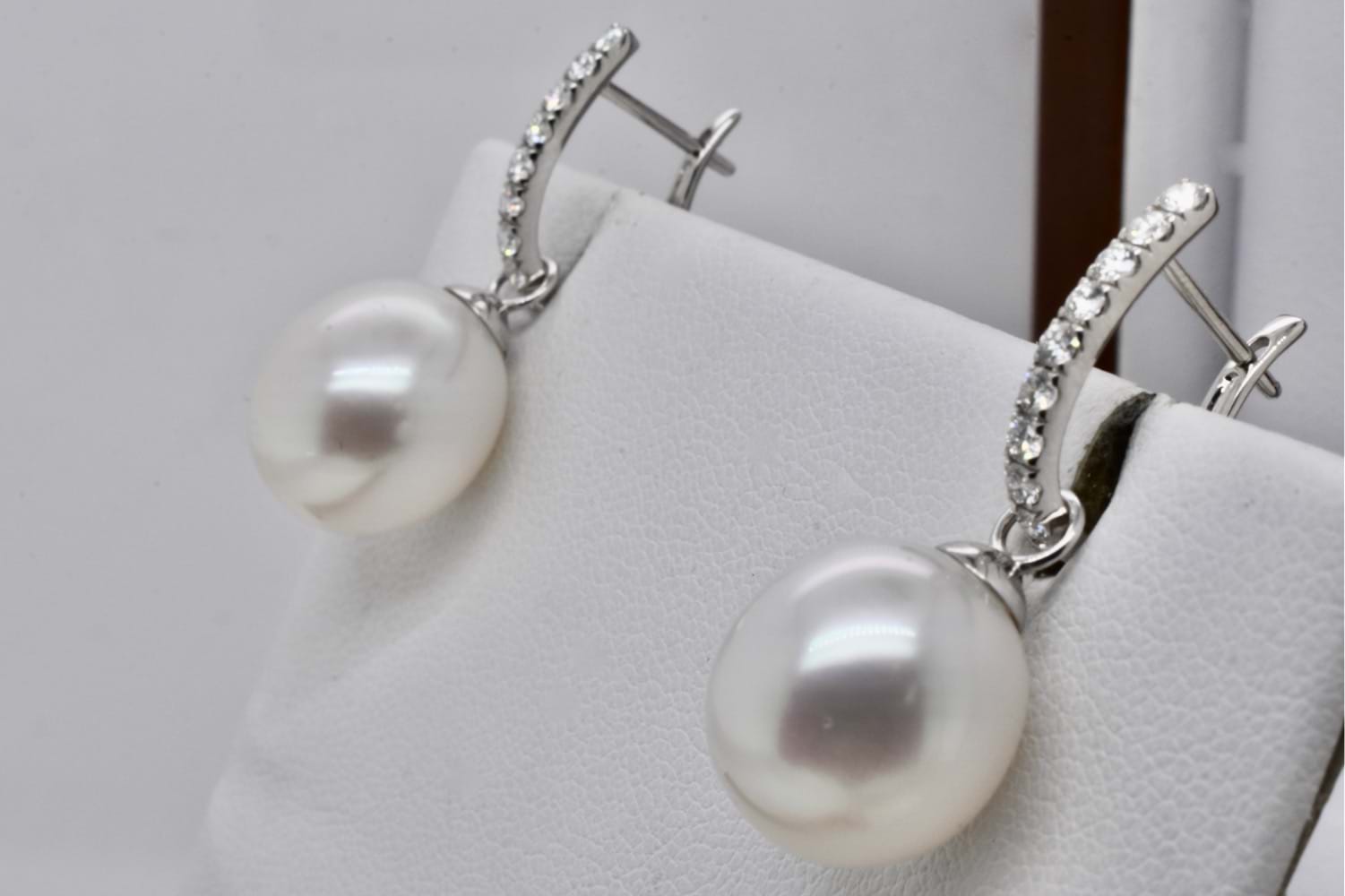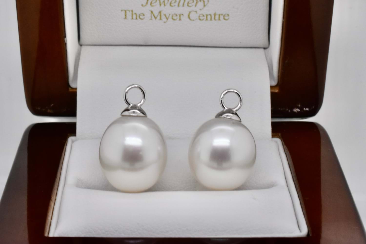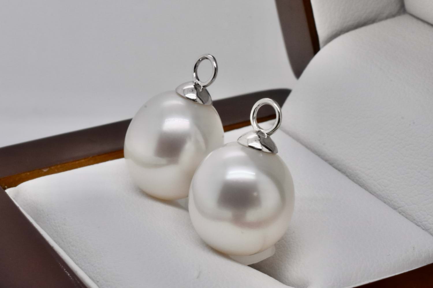 A beautiful and elegant pair of oval 12-12.2mm south sea pearls with 18ct white gold cap and ring fittings perfect to suspend from diamond huggies. Pearls independently graded as: oval pink white hue with good lustre, clean- very lightly blemished. Independent Valuation Supplied.