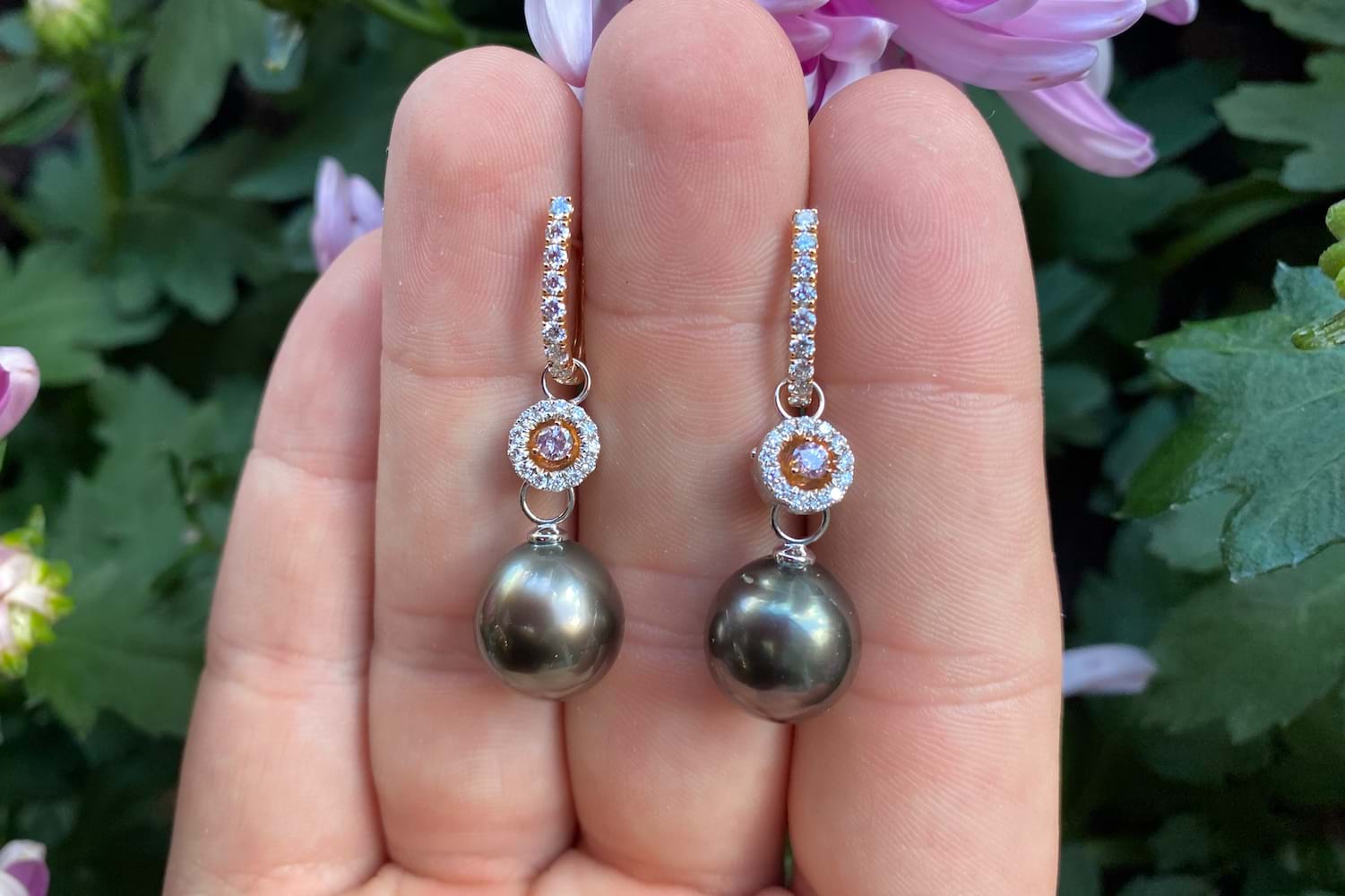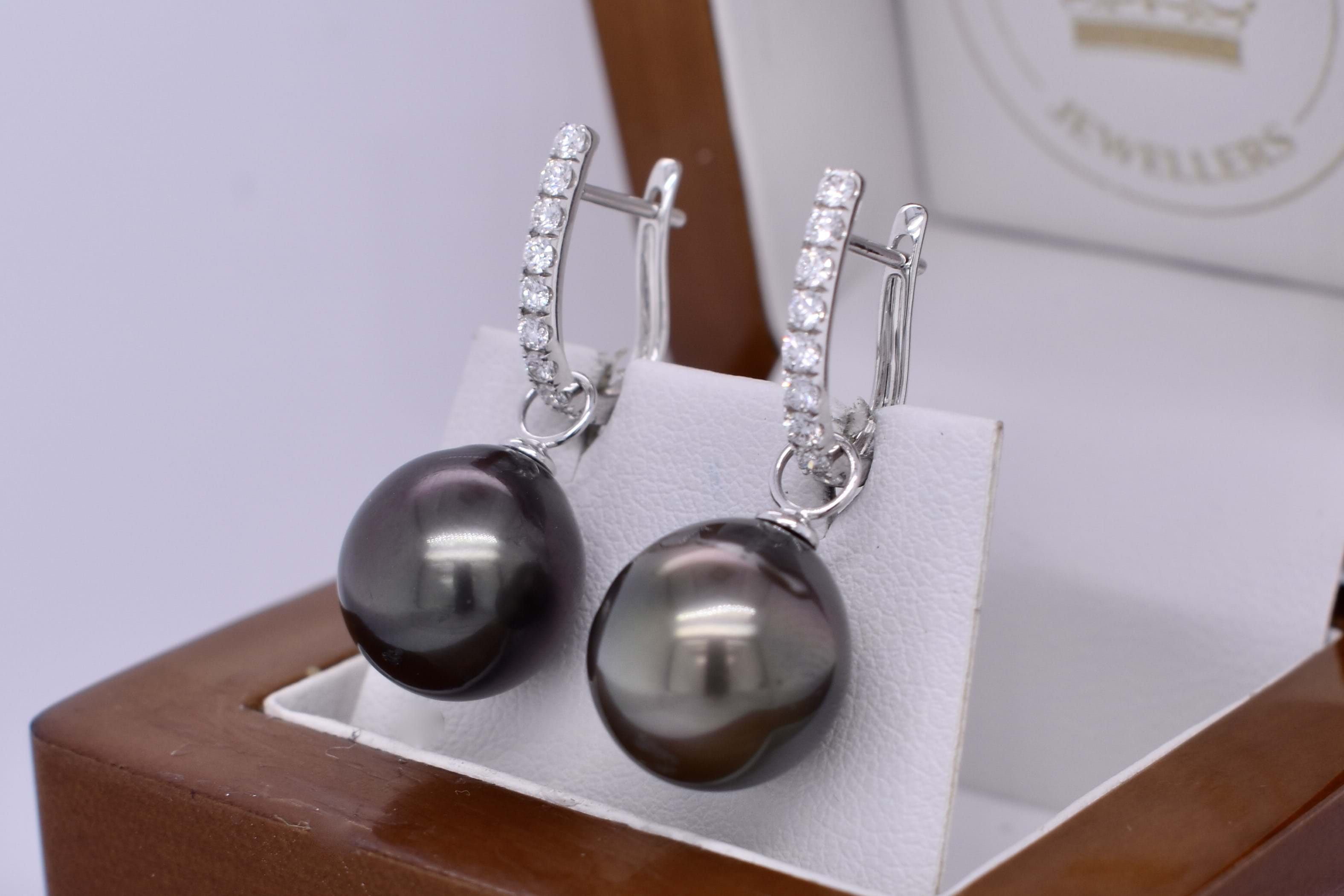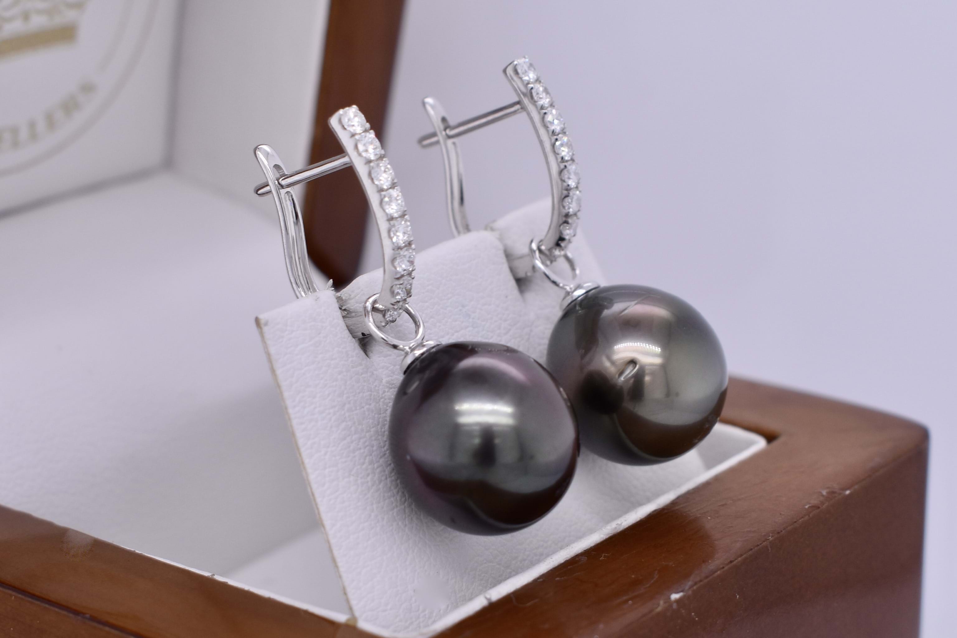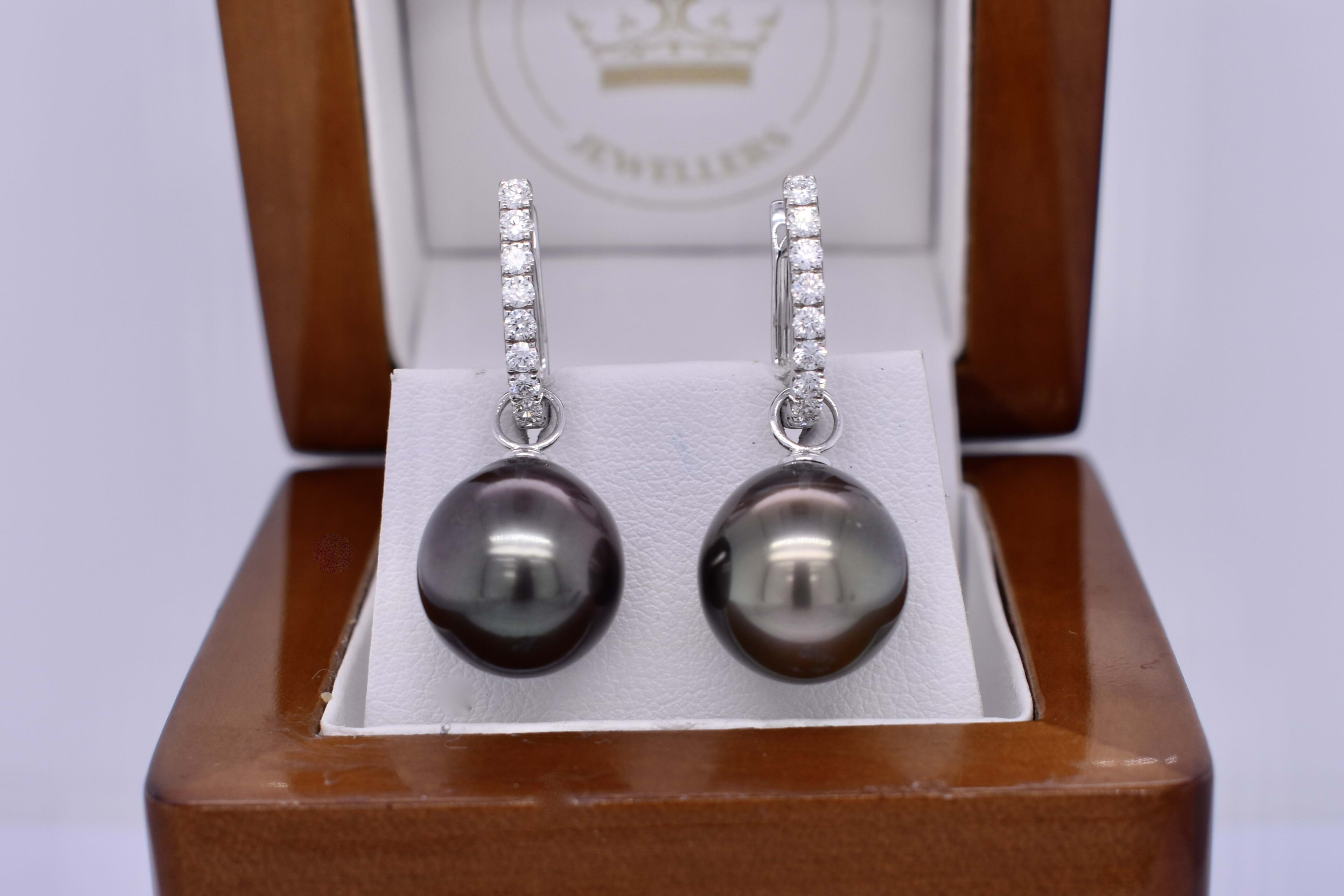 A versatile and elegant pair of 12.43-12.18mm Tahitian pearls, with 18ct white gold cap and ring fittings perfect to suspend from diamond huggies. Pearls independently graded as: off round, good lustre, dark greenish black, moderately included. Signature diamond huggies are available for separate purchase. Independent Valuation Supplied.