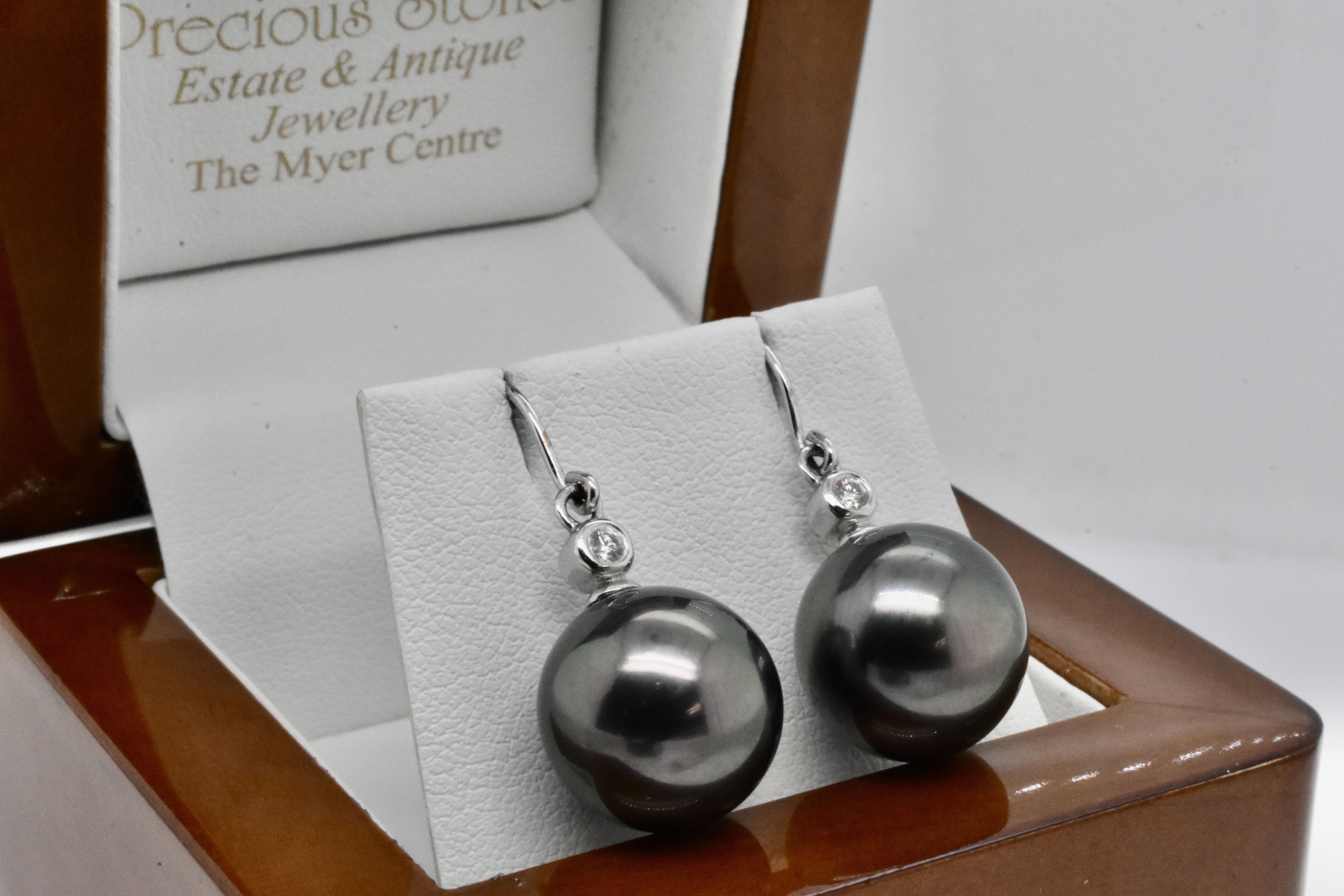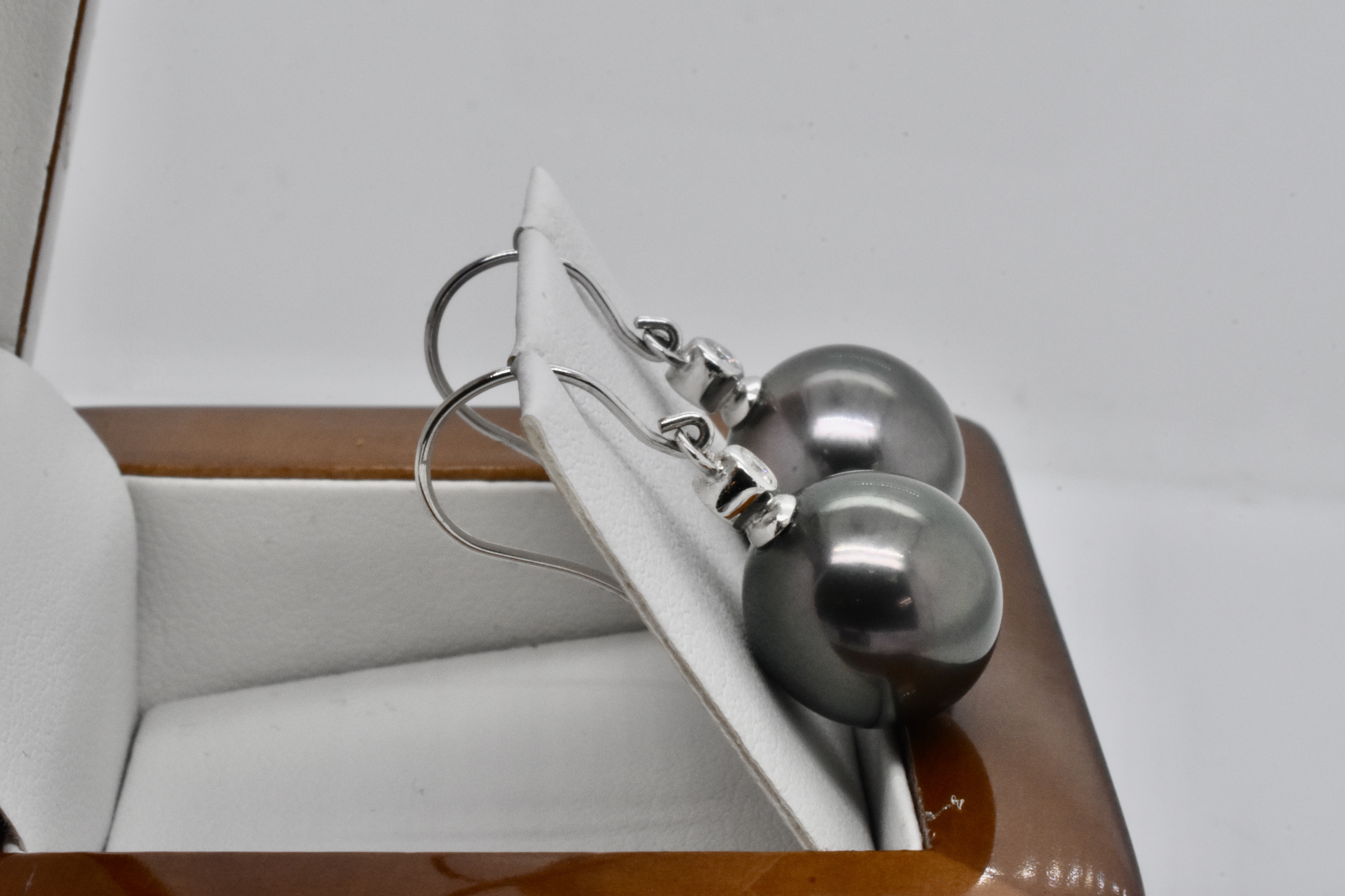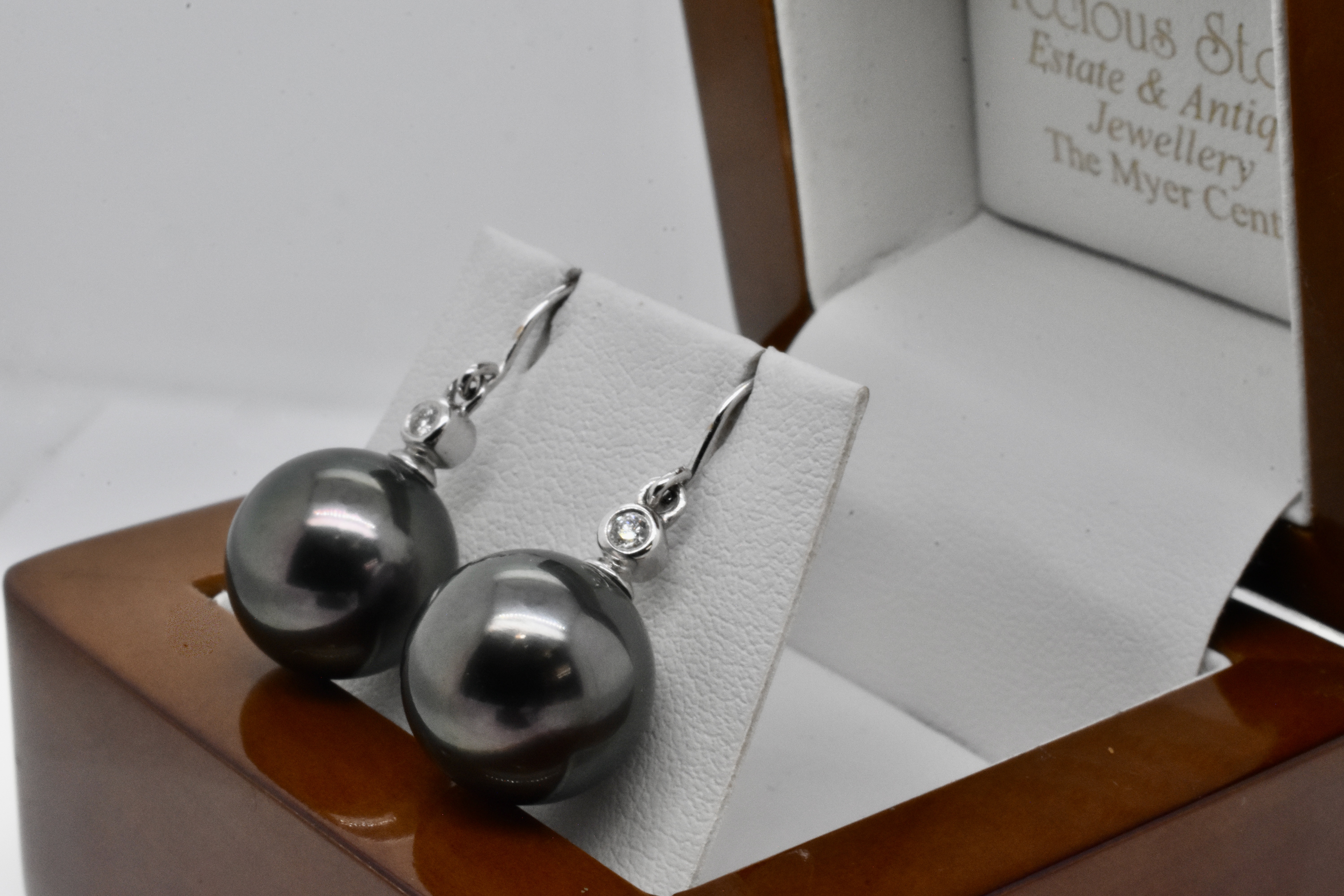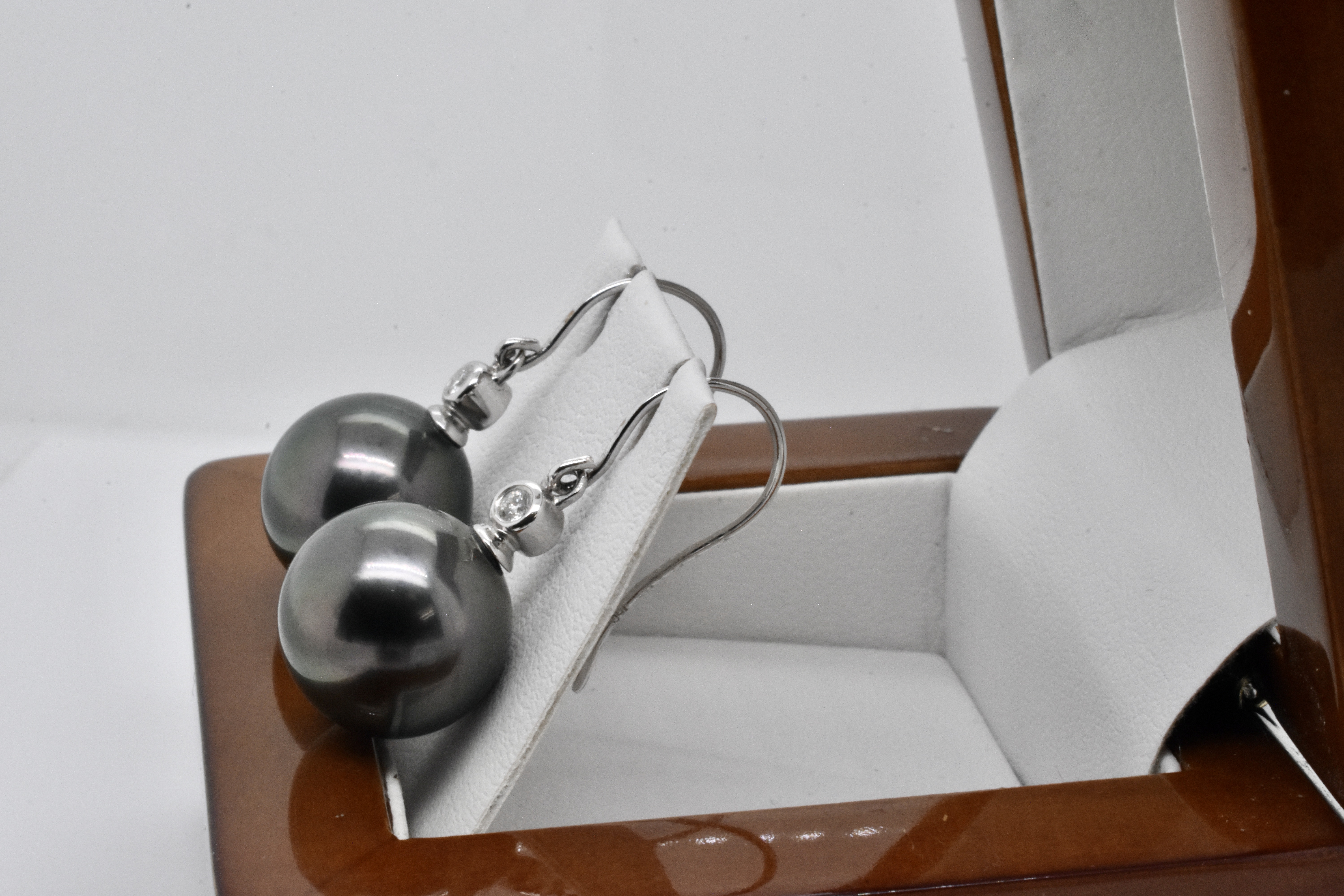 Pearls with a pretty sparkly touch, these 18ct white gold earrings feature large 12.8mm near round Tahitian pearls have a beautifully rich dark purplish black colour and good lustre, with a diamond set pearl cap 2=0.06ct H/SI and finished with fine shepherd hooks