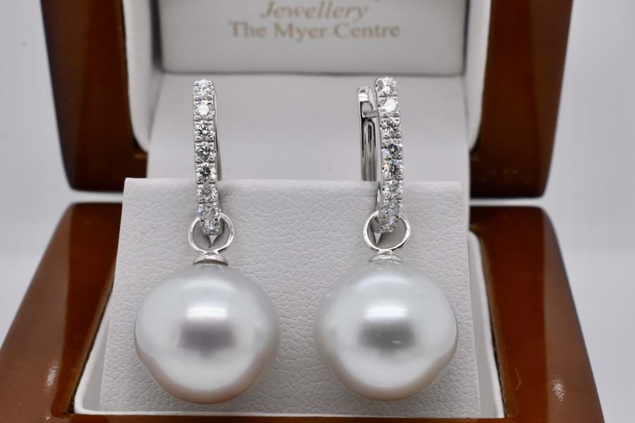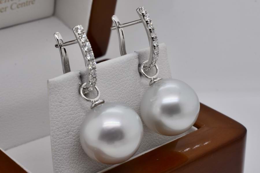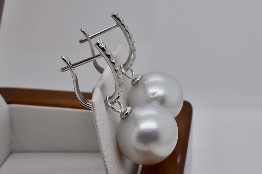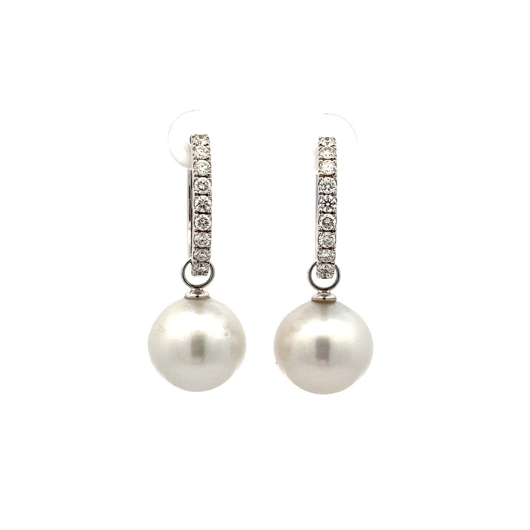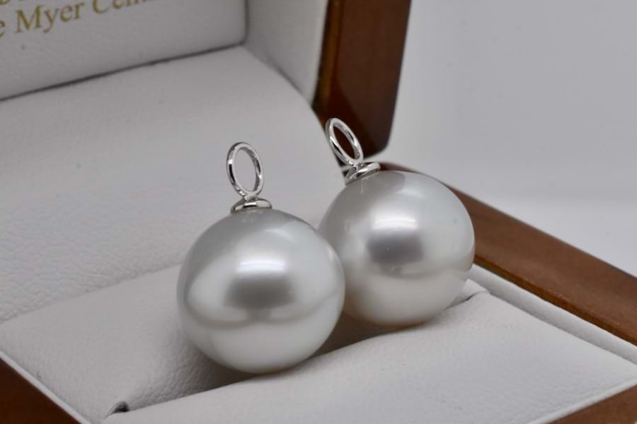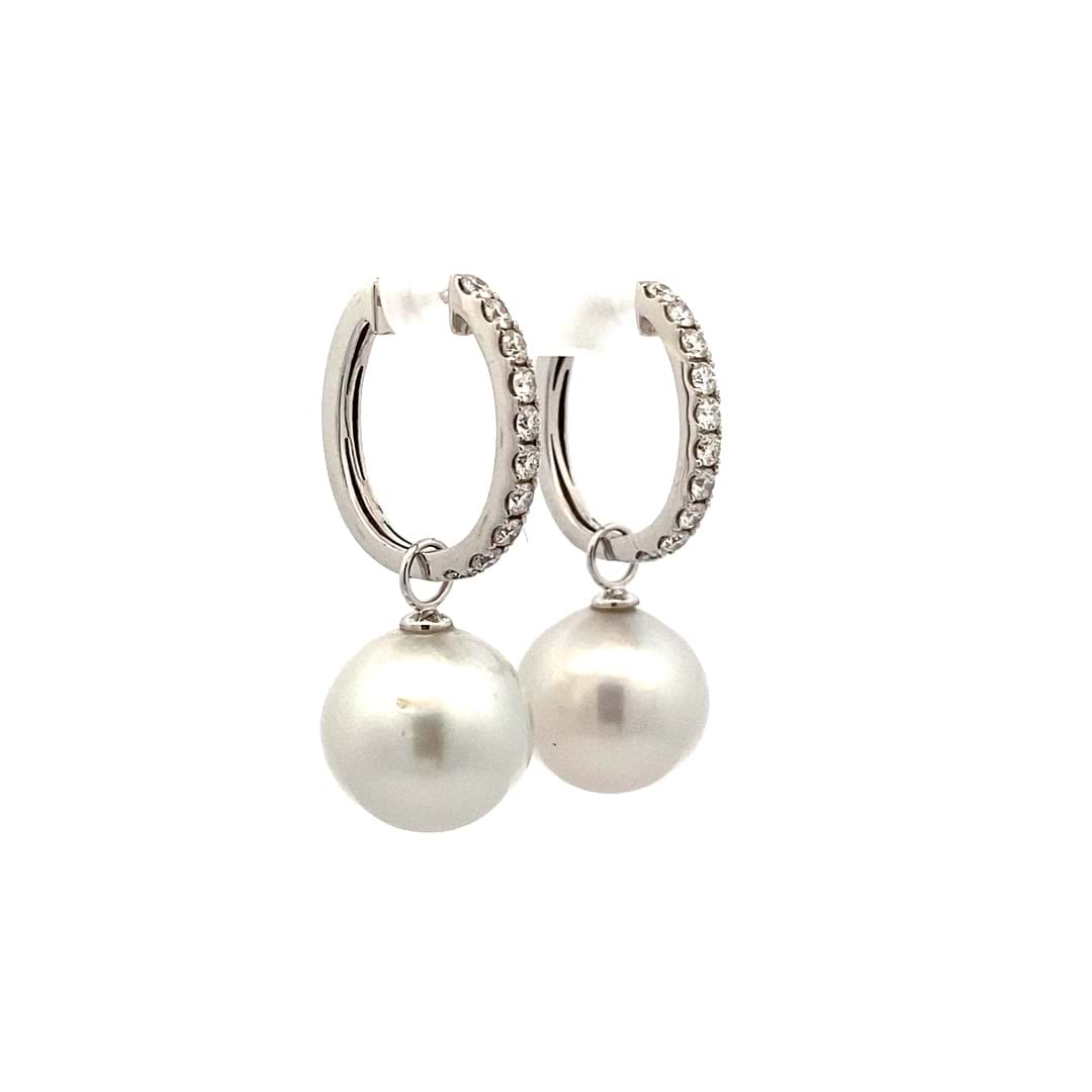 A simple and elegant pair of off round ovalish 13.50 - 13.65mm south sea pearls with 18ct white gold cap and ring fittings perfect to suspend from diamond huggies. Pearls independently graded as: silvery white hue with high lustre, lightly blemished. Independent Valuation Supplied. Diamond huggies pictured are available for separate purchase