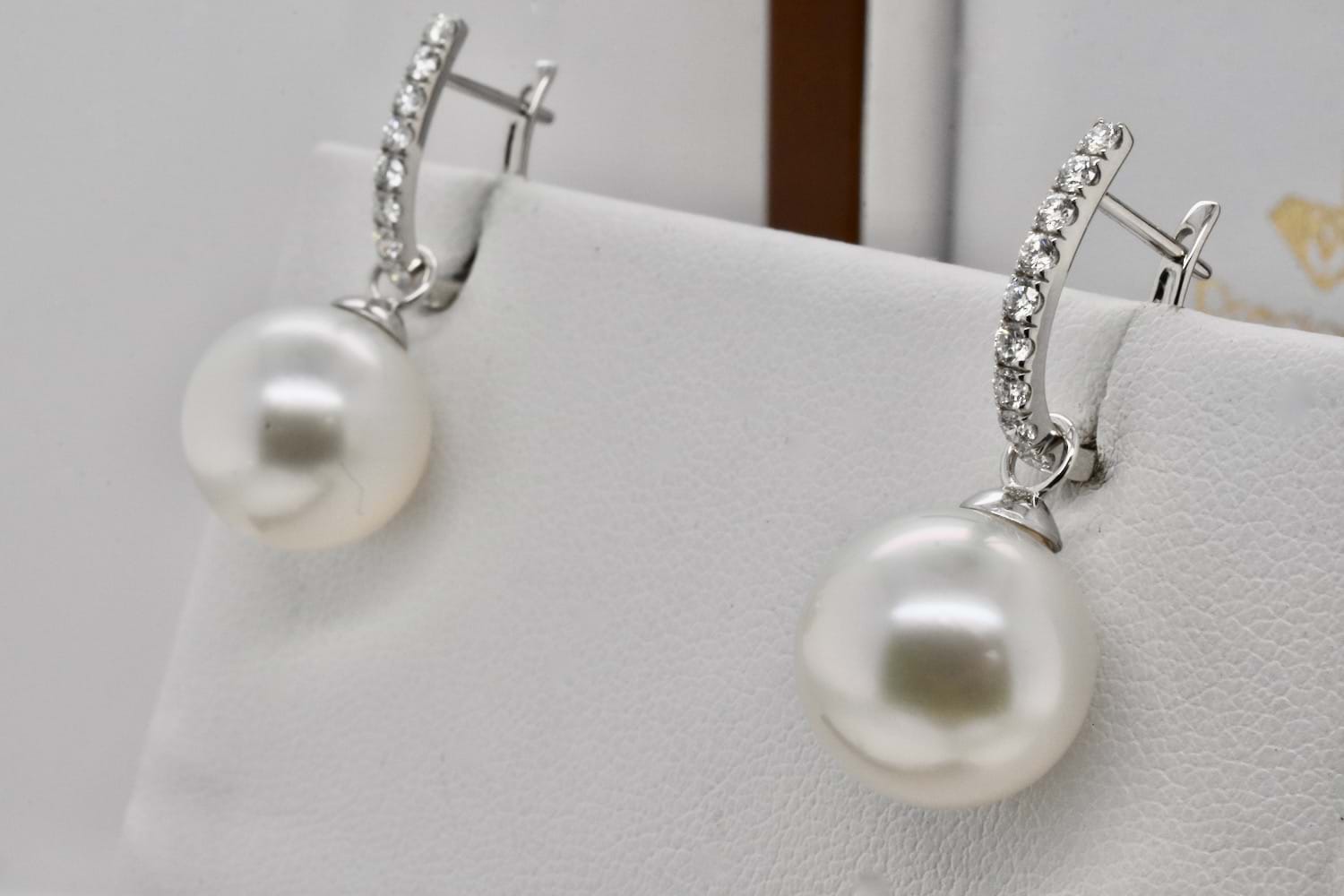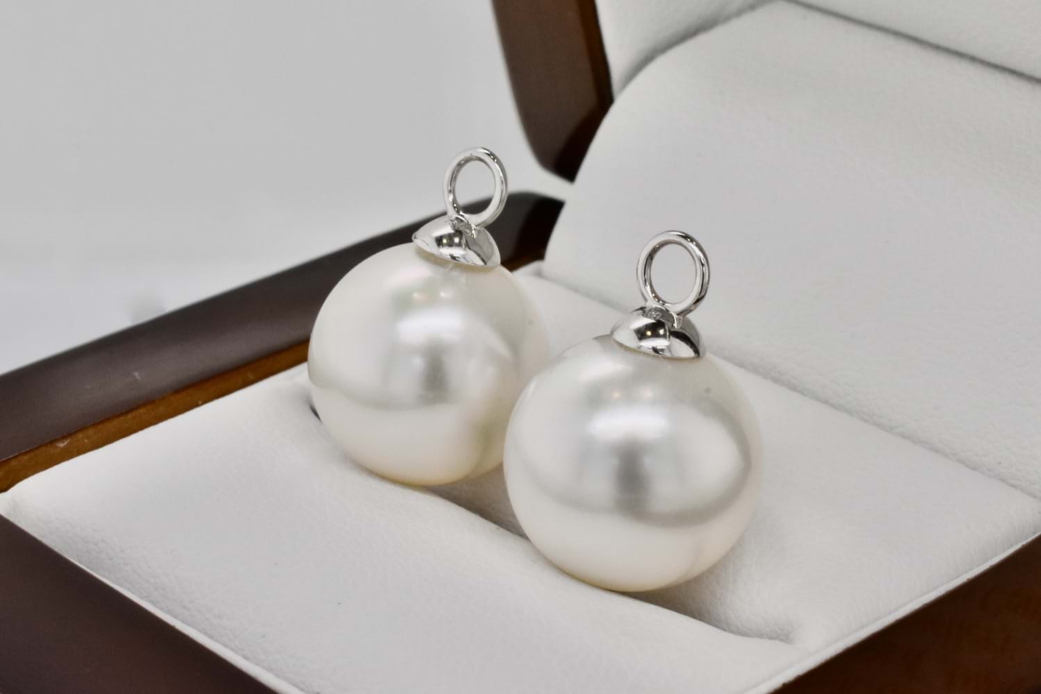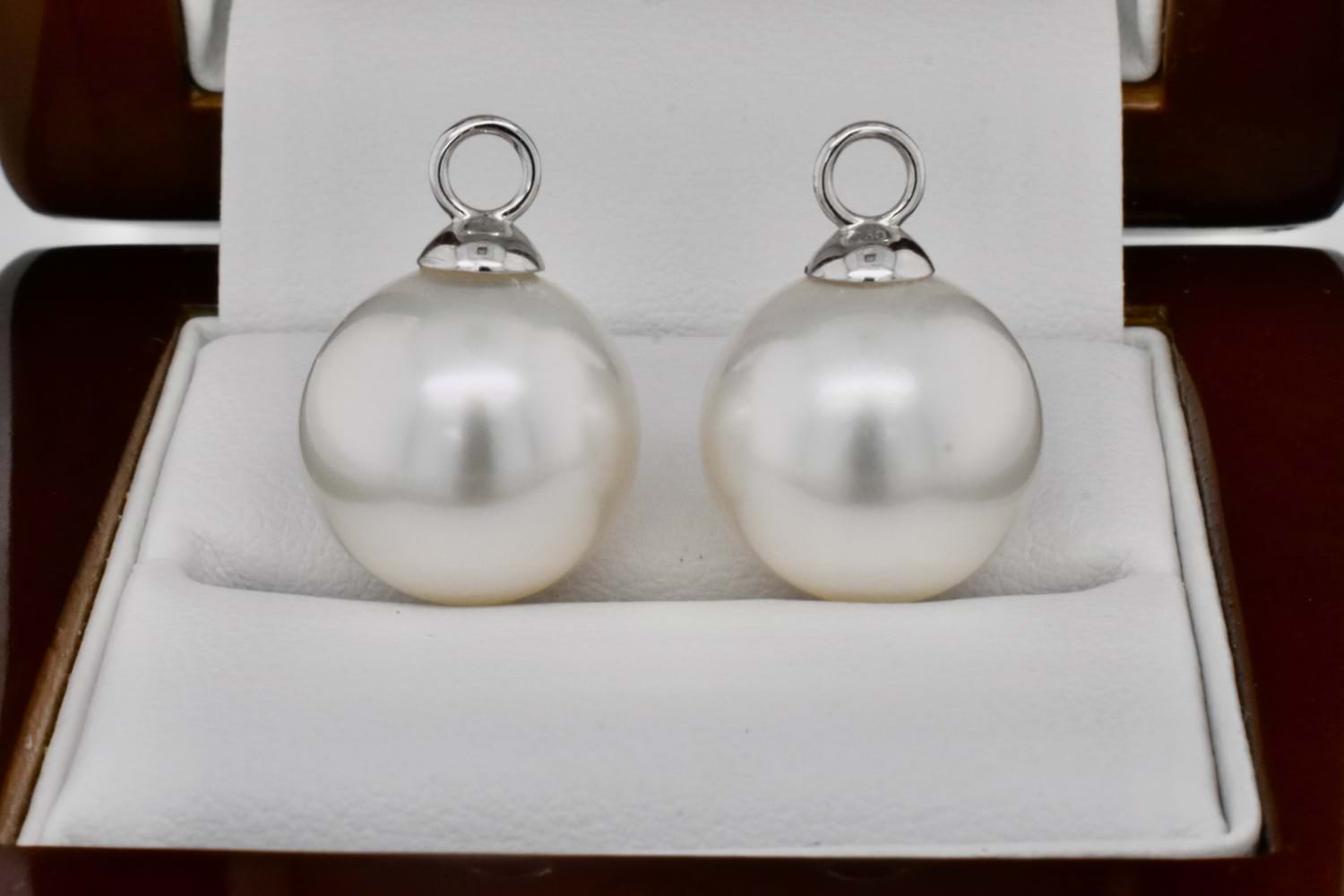 A simple and elegant pair of near round 13mm south sea pearls with 18ct white gold cap and ring fittings perfect to suspend from diamond huggies. Pearls independently graded as: near round pink white hue with good lustre, clean- very lightly blemished. Independent Valuation Supplied.