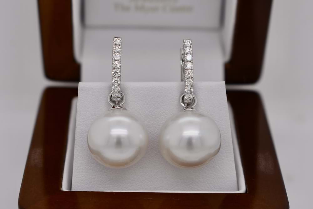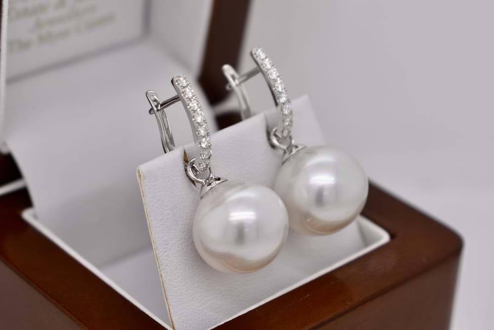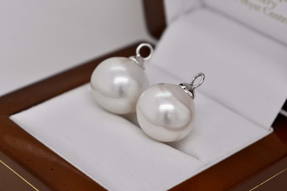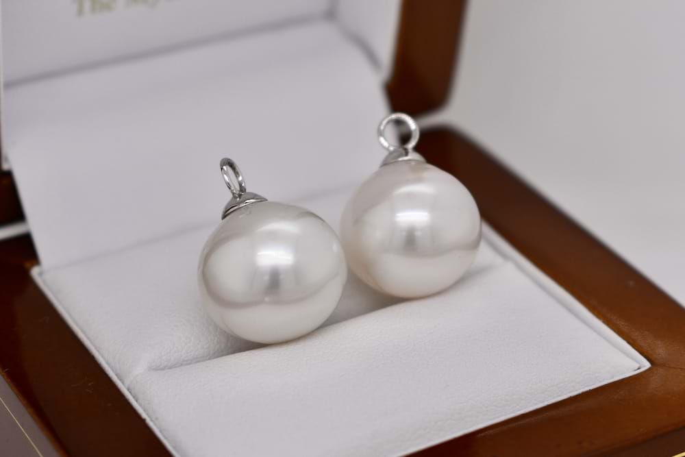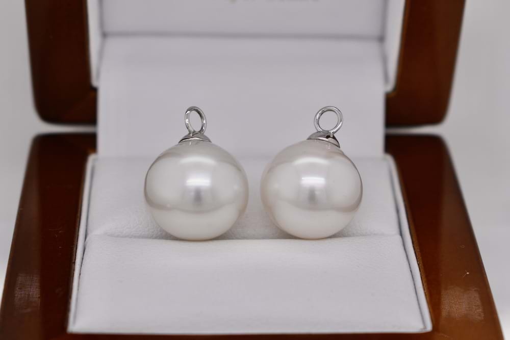 This stunning pair of South Sea pearl earring enhancers are set in 18ct white gold and measure 14-14.5mm semi round, with good lustre and pink/white in colour. They are the perfect match for an 18ct white gold set of huggies, these ones are displayed with 20291754 which are available for separate purchase. Independent valuation supplied
