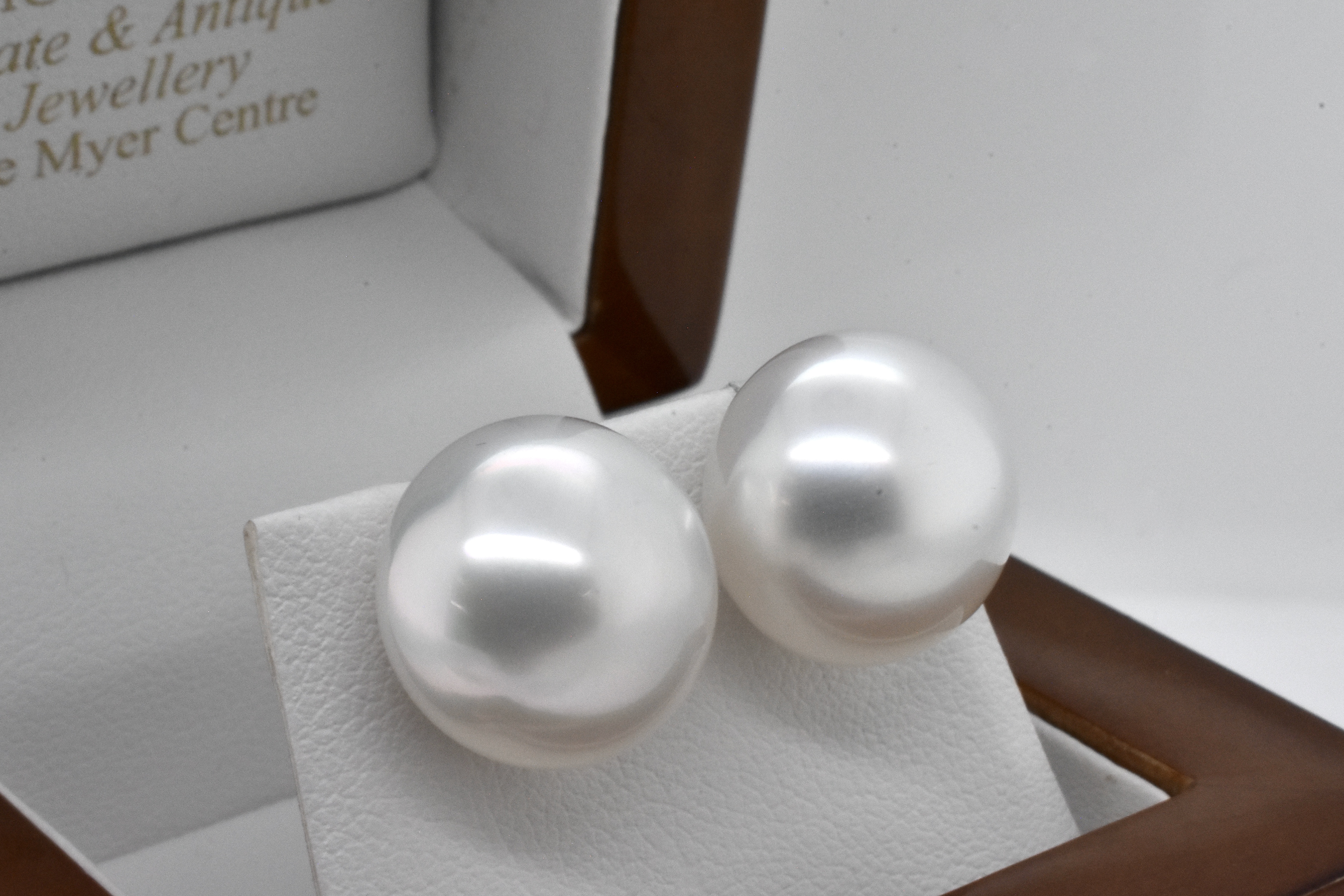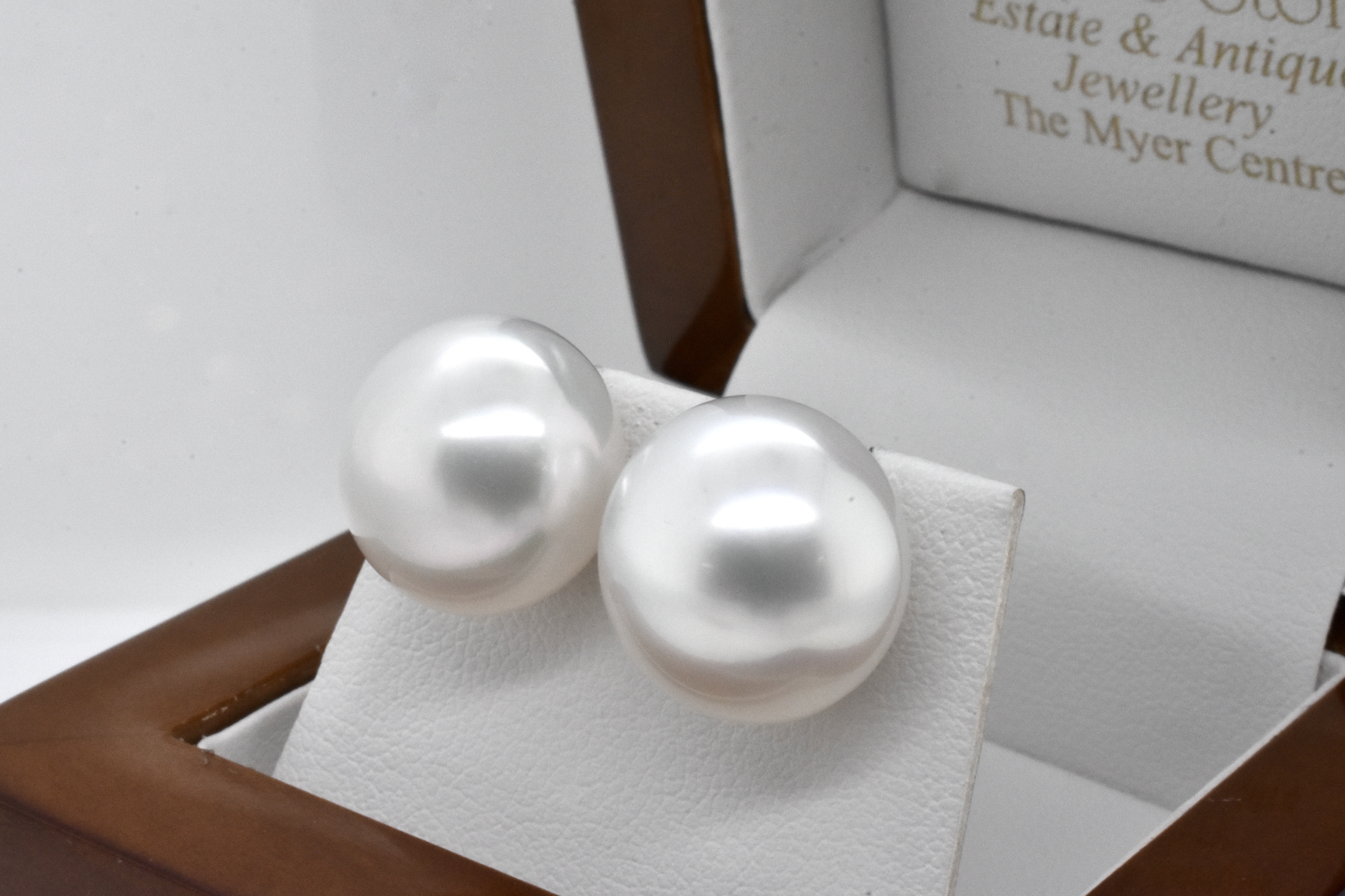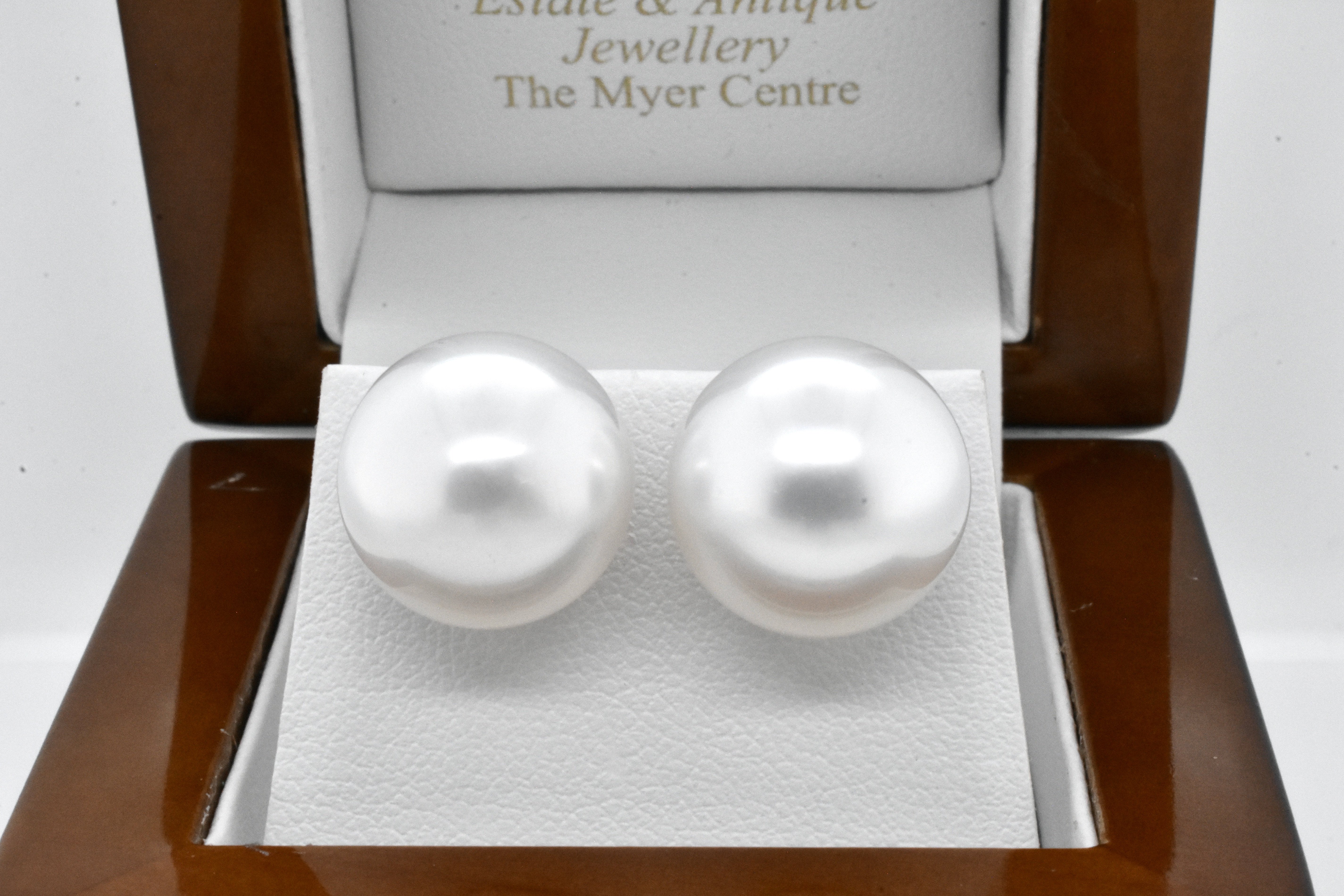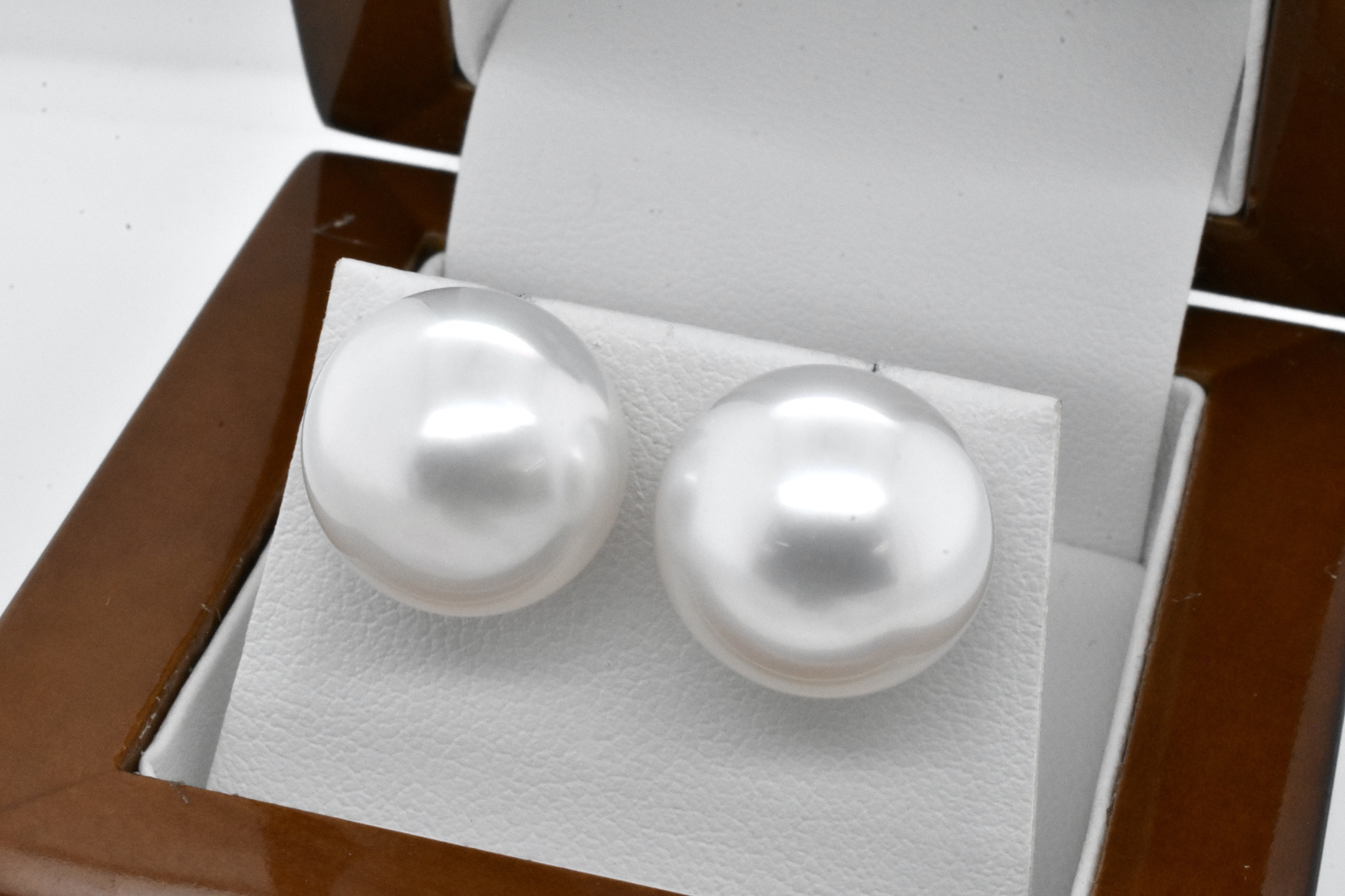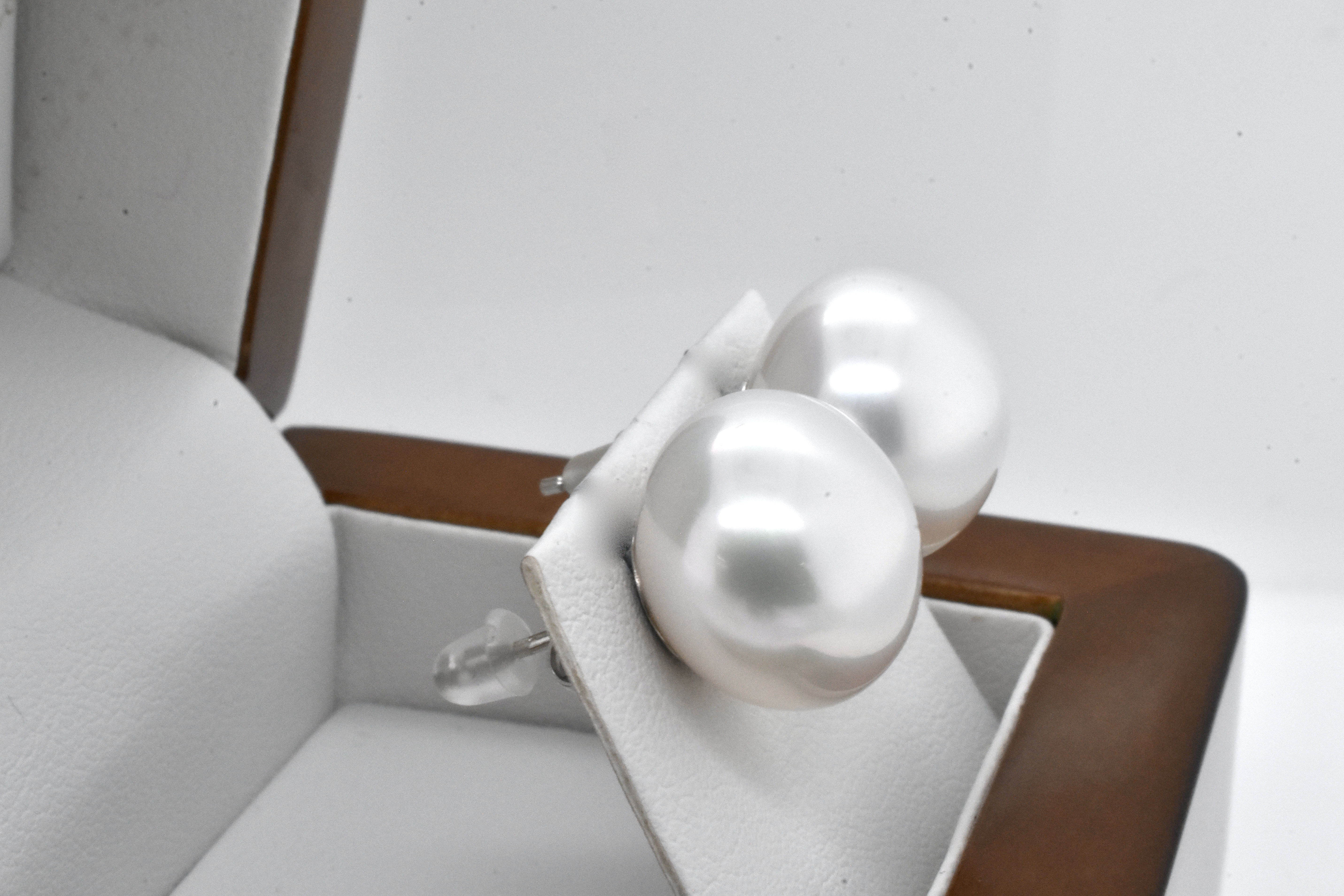 These 18ct white gold studs feature large, statement button shape white south sea pearls measuring 14-14.5mm, in plain caps and with post and butterfly fittings