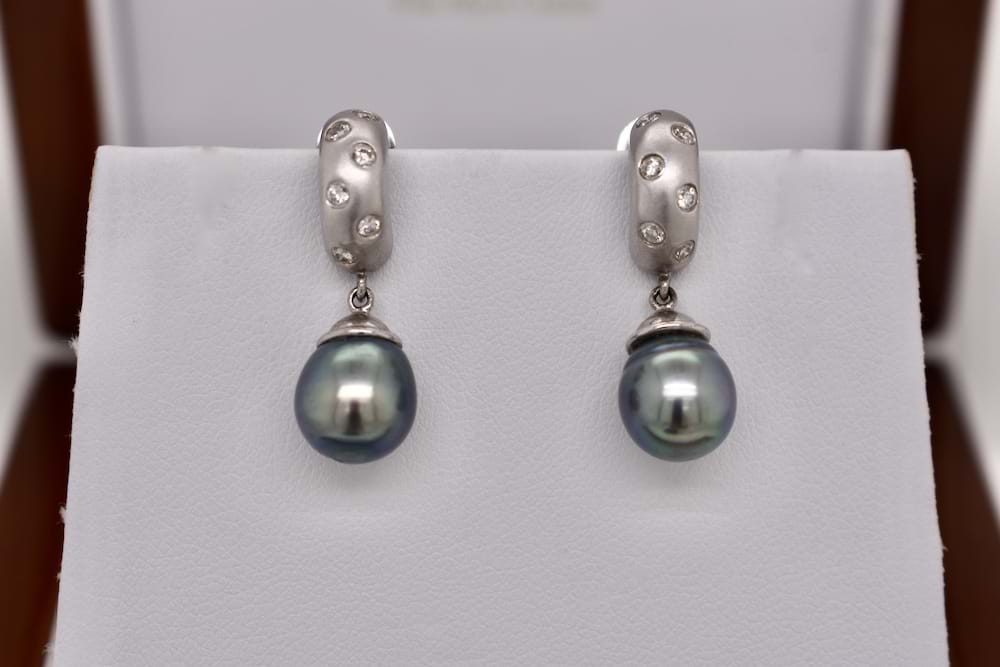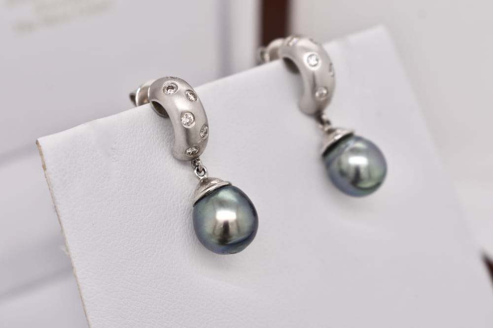 SOLD 18ct White Gold Dyed Freshwater Pearl & Diamond Earrings